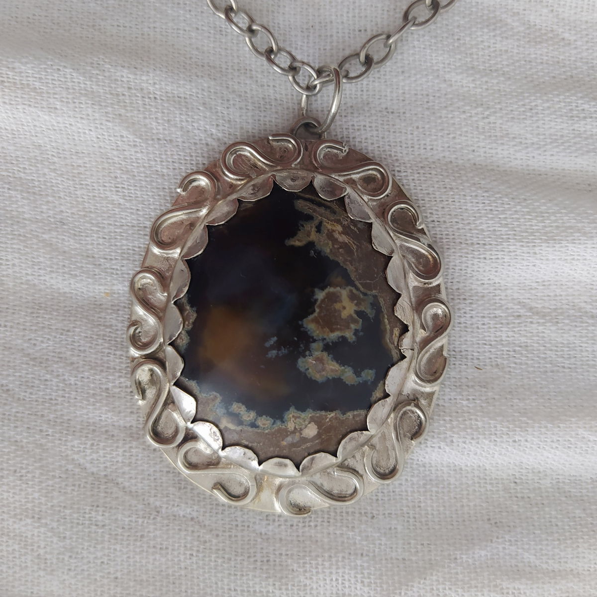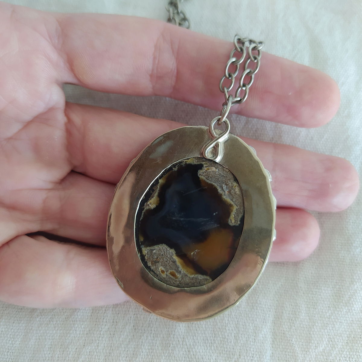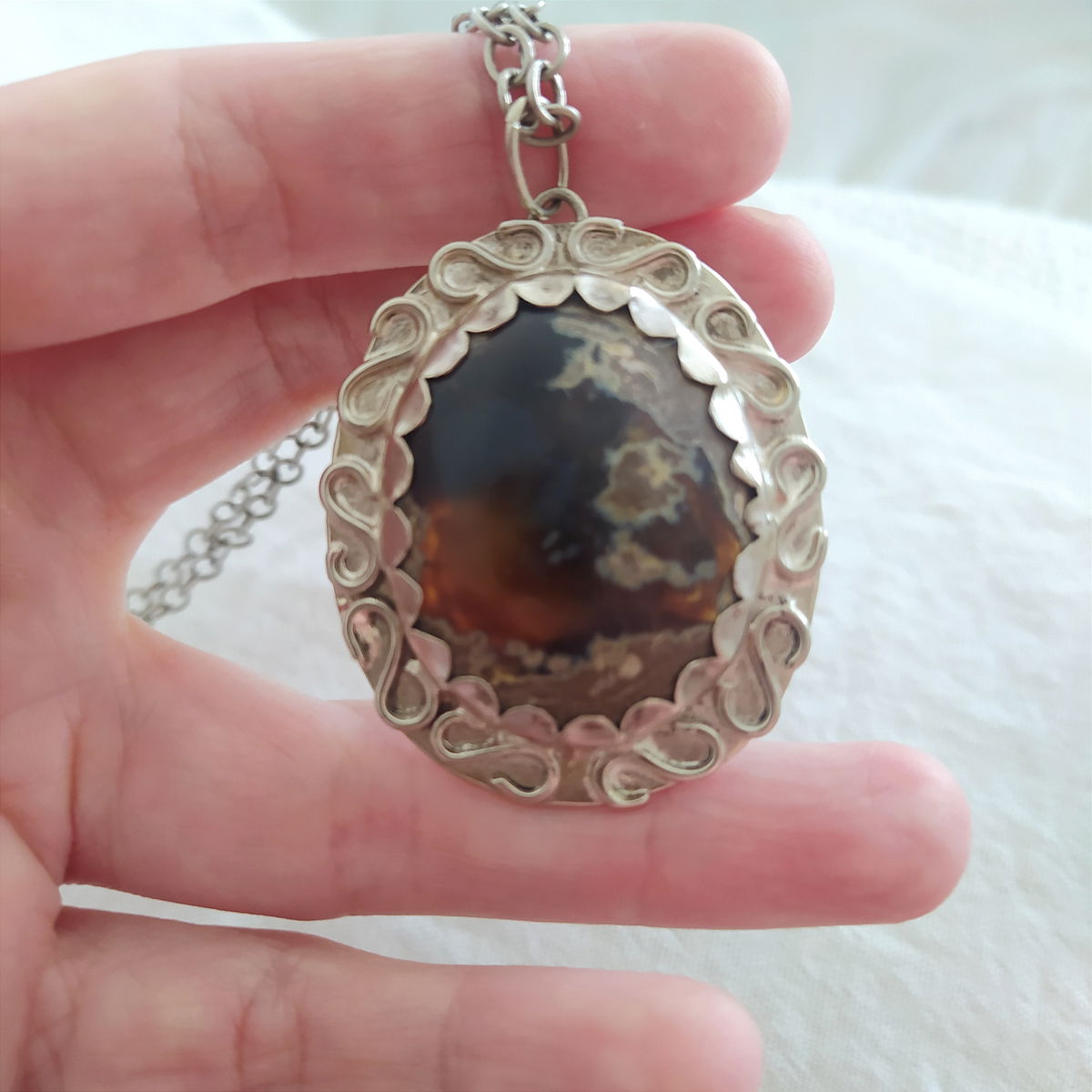 Dije de Agata Fuego hecho a mano en alpaca. Viene con cadena de alpaca incluida.
