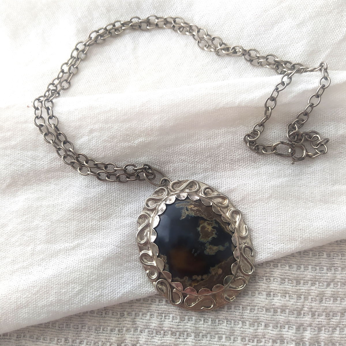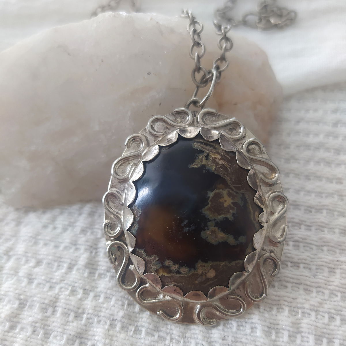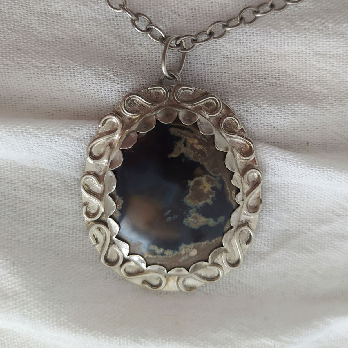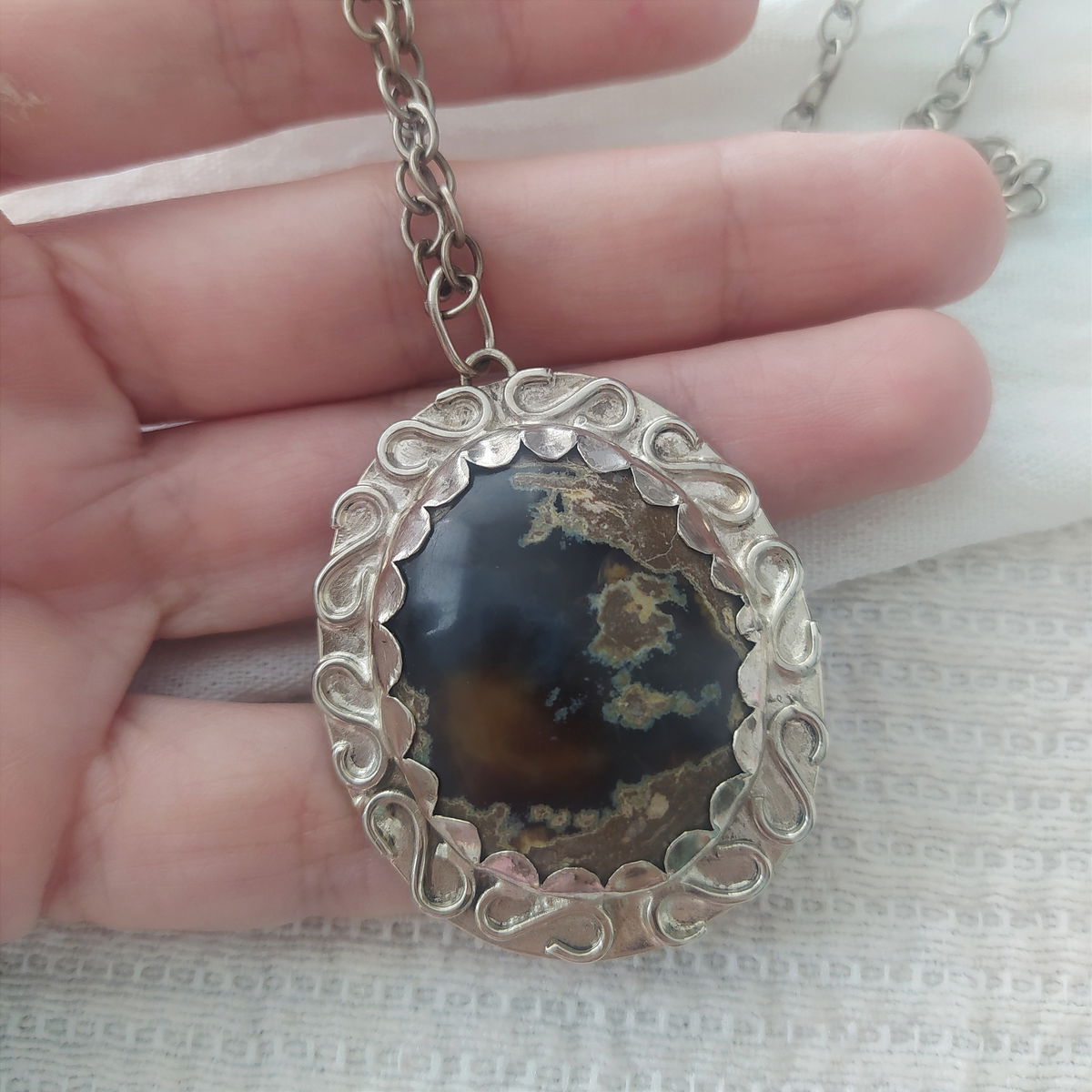 Dije de Agata Fuego hecho a mano en alpaca. Viene con cadena de alpaca incluida.