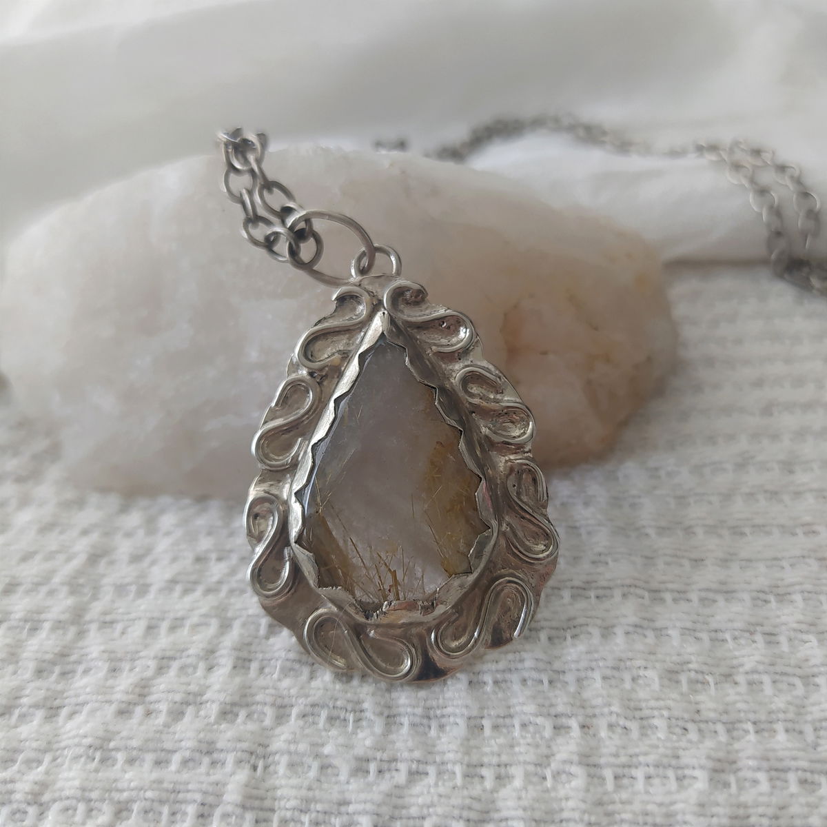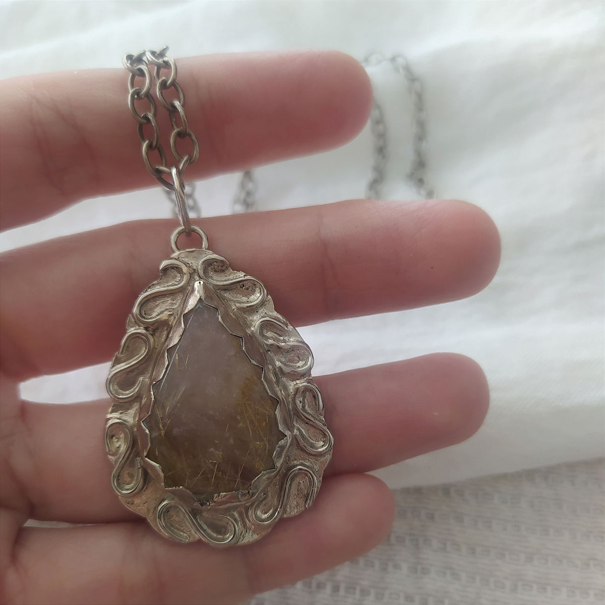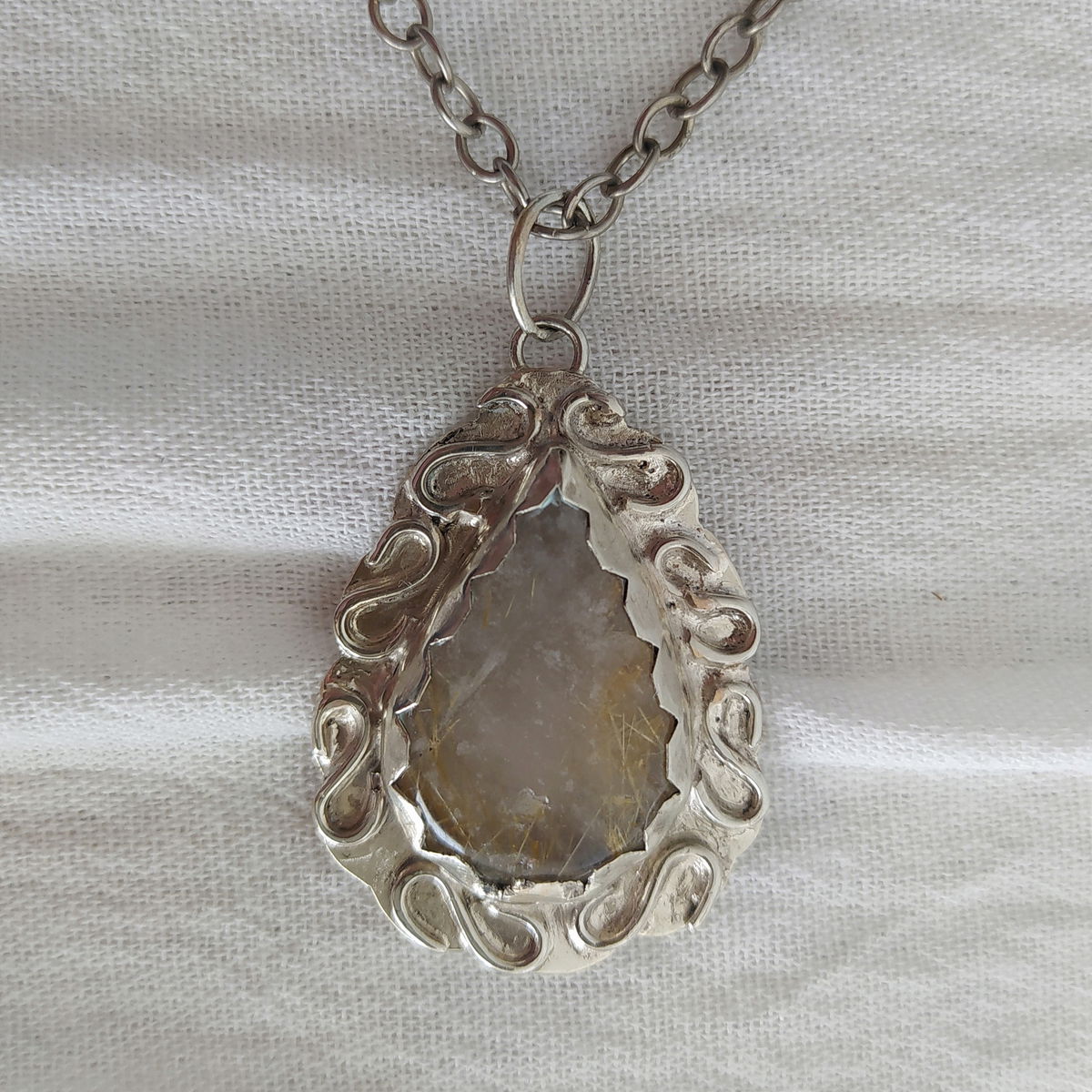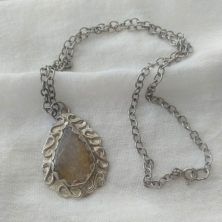 Dije de Cuarzo Rutilado hecho a mano en alpaca. Viene con cadena de alpaca incluida.