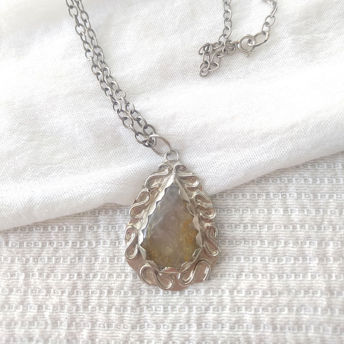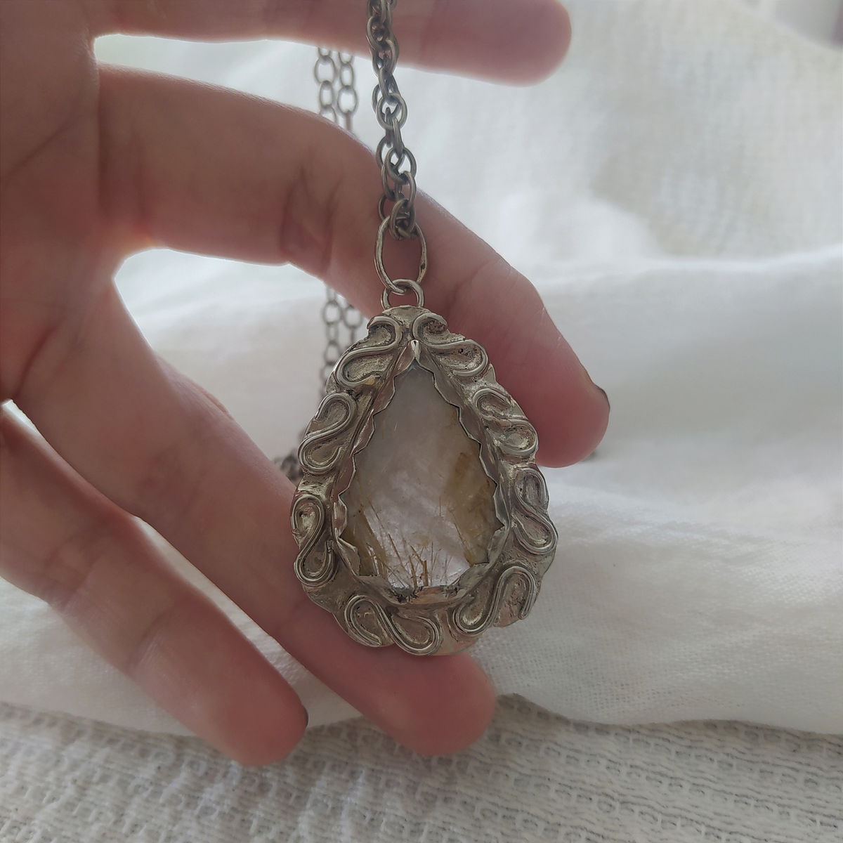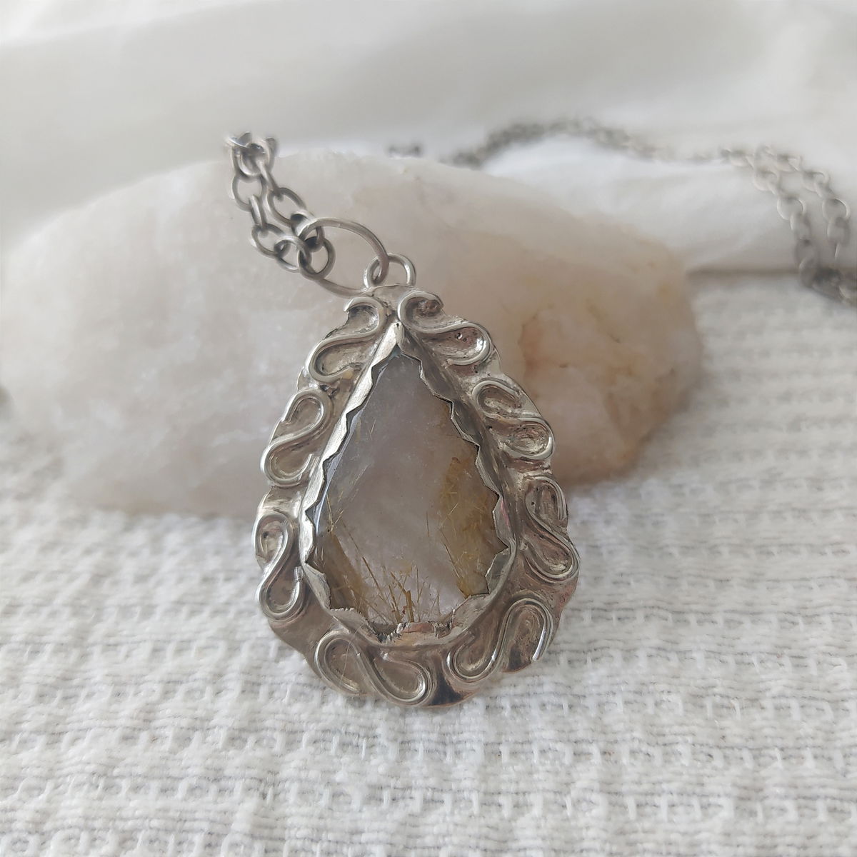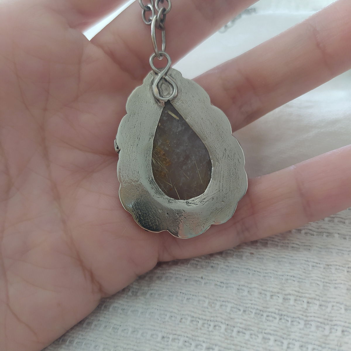 Dije de Cuarzo Rutilado hecho a mano en alpaca. Viene con cadena de alpaca incluida.