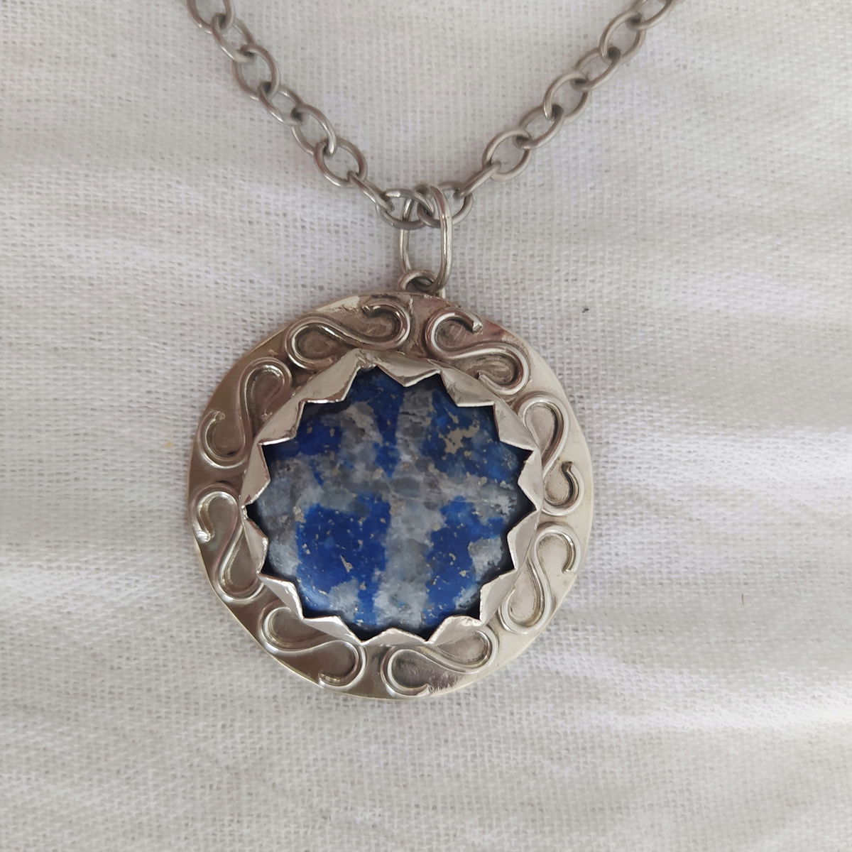 Dije que Lapislázuli trabajado en alpaca. Viene con cadena de alpaca incluida.