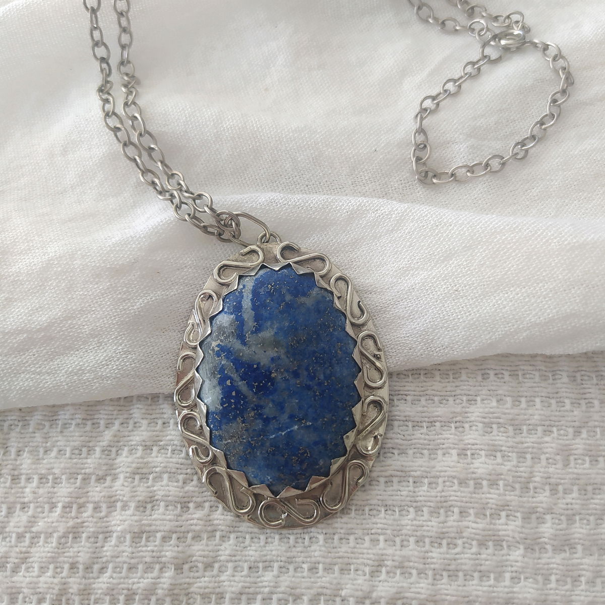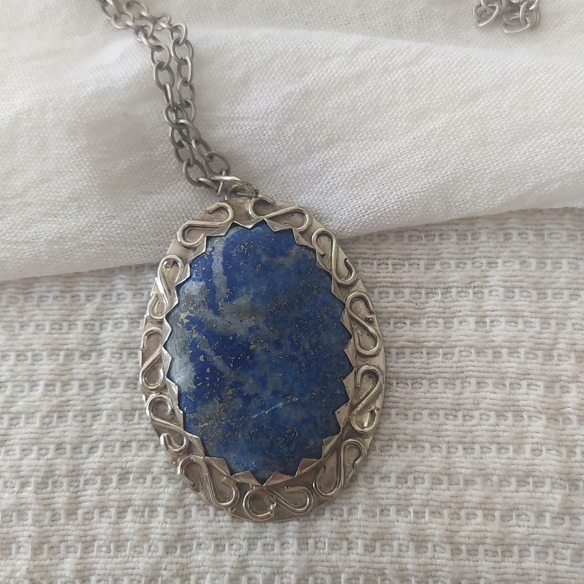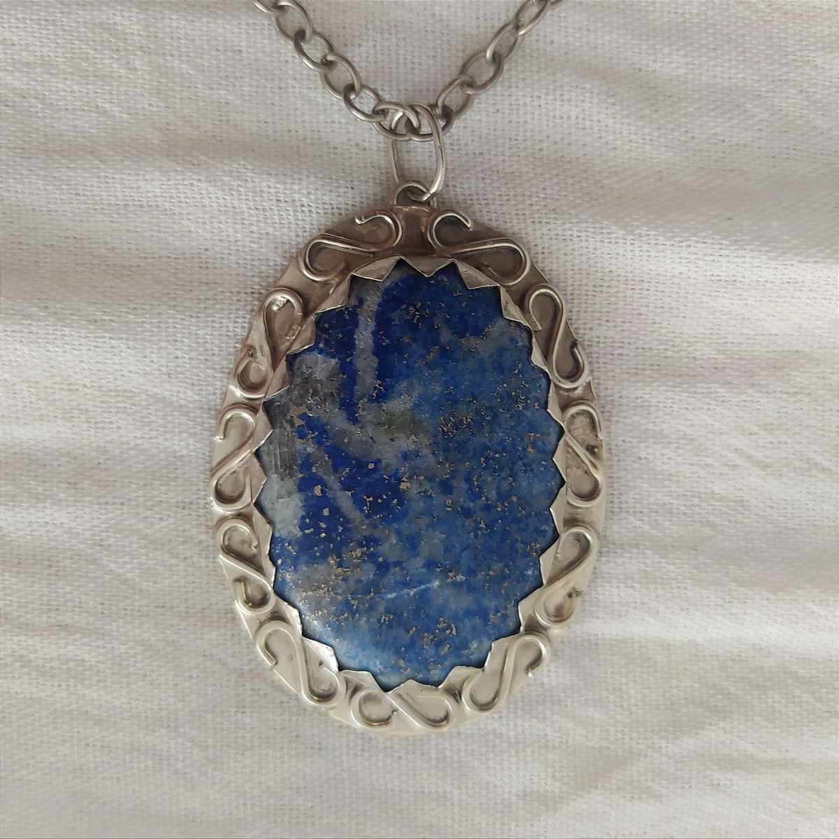 Dije que Lapislázuli hecho en alpaca. Viene con cadena de alpaca incluida.