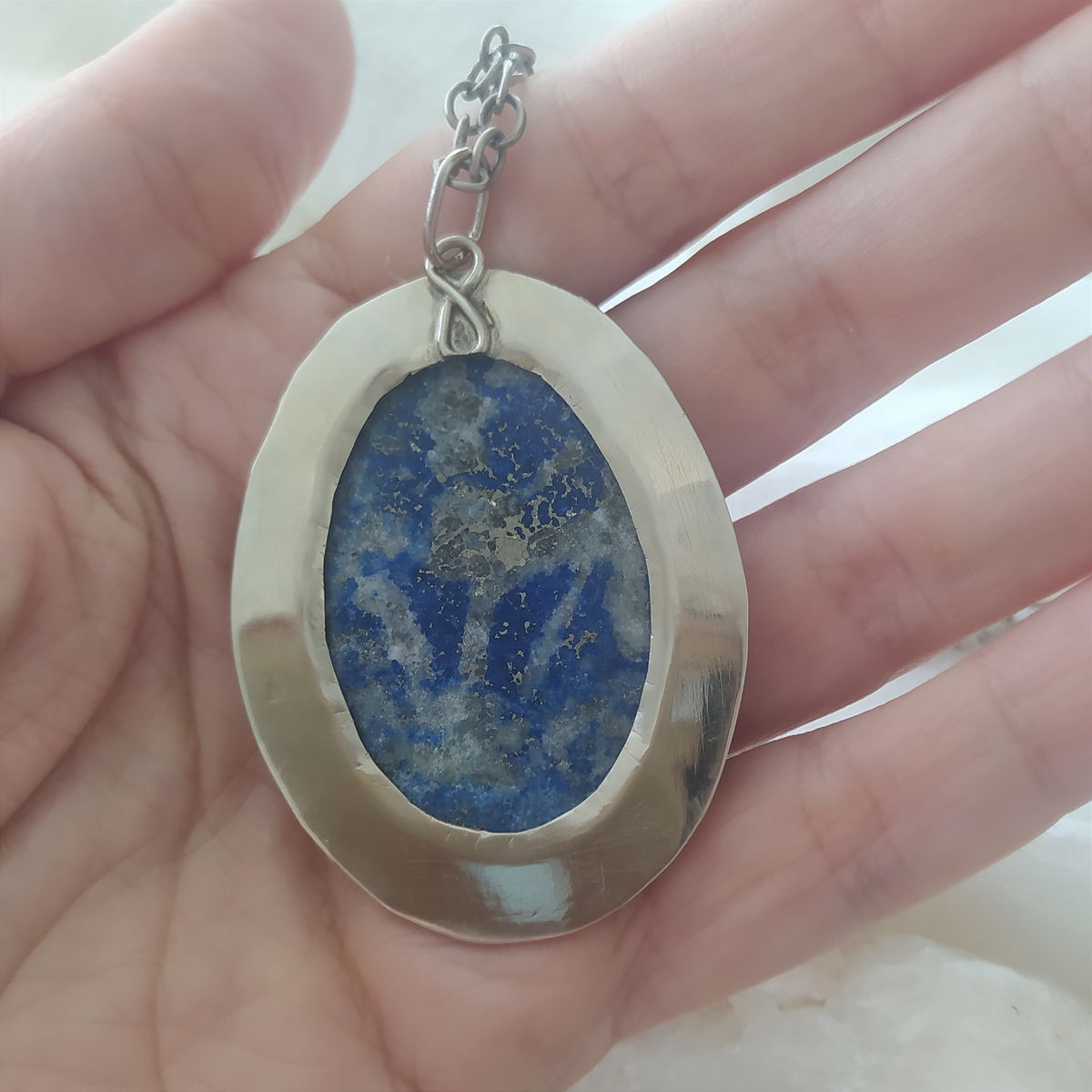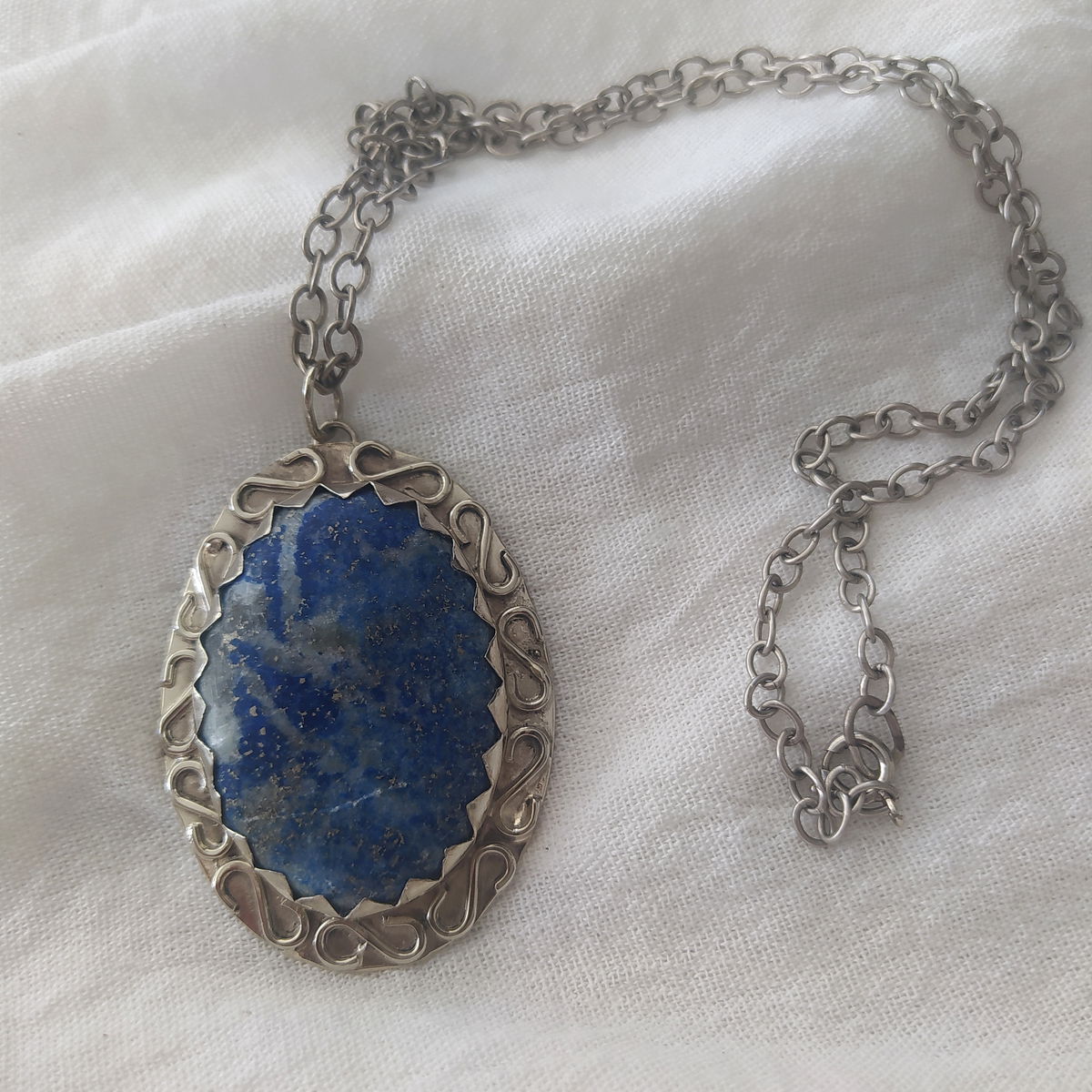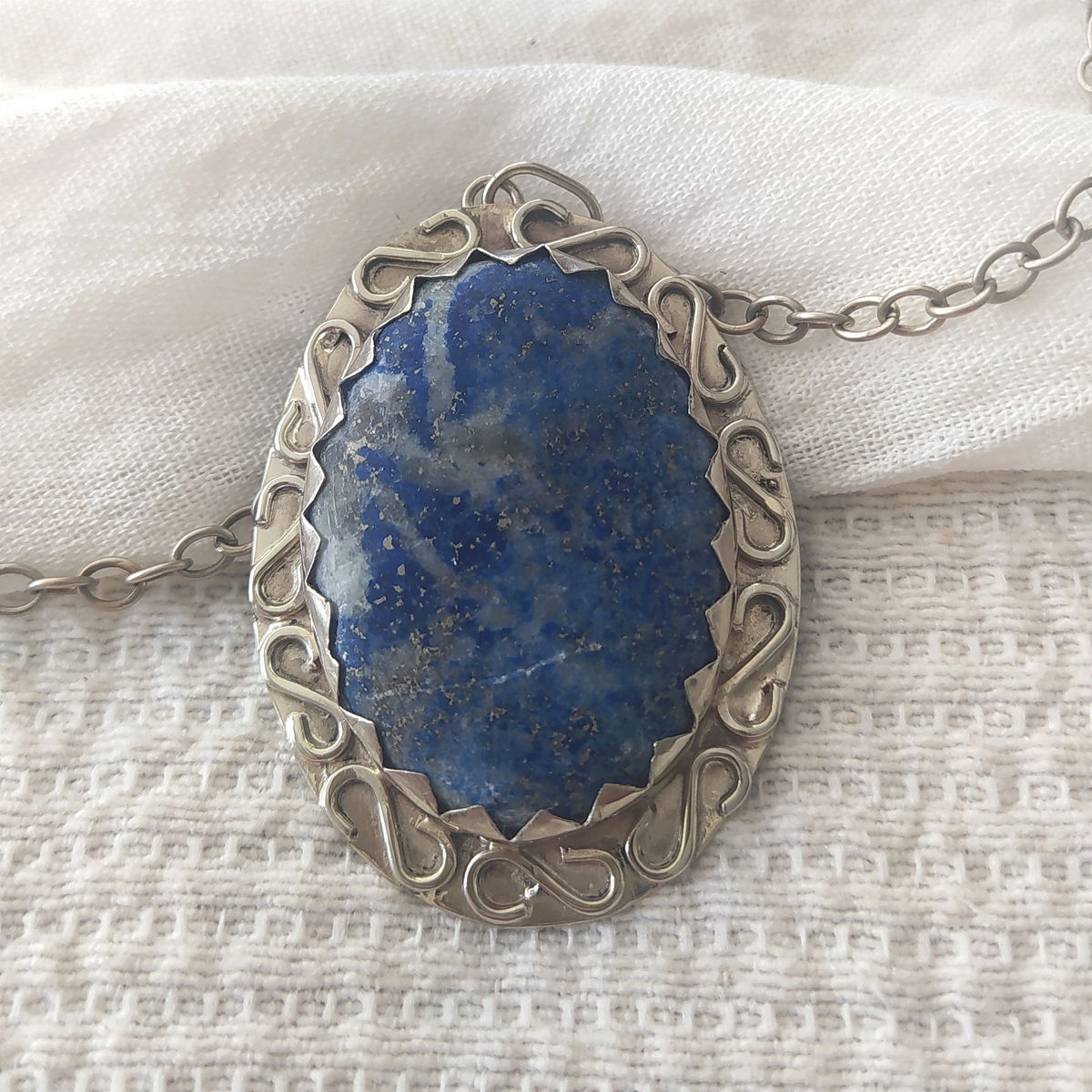 Dije que Lapislázuli hecho en alpaca. Viene con cadena de alpaca incluida.