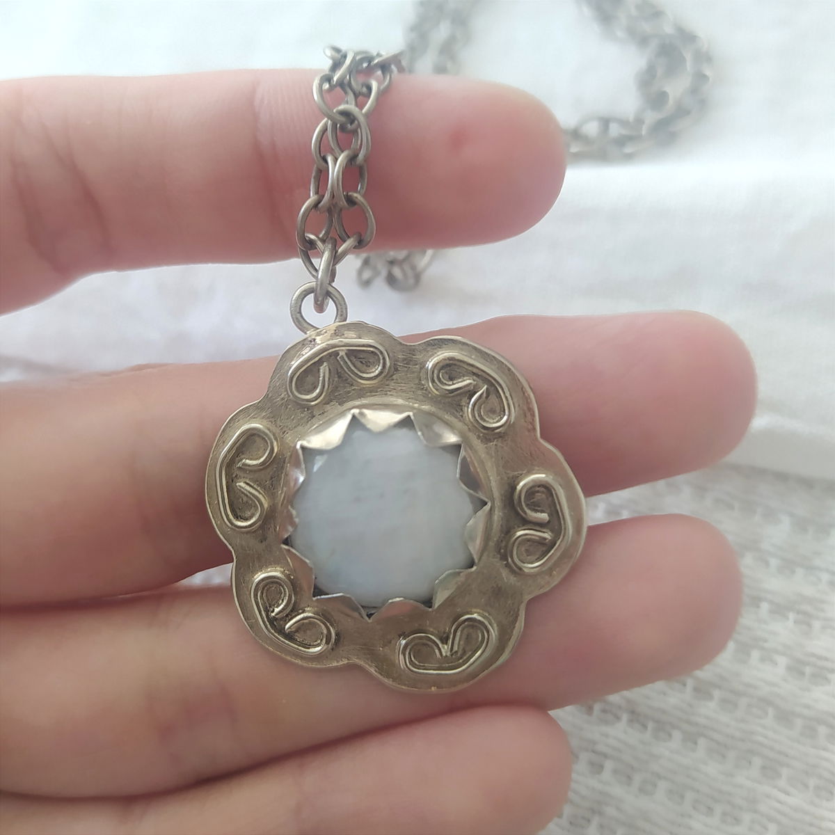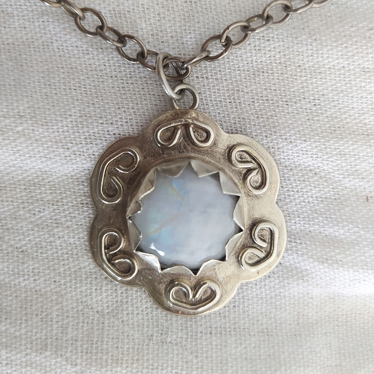 Dije de piedra de Luna trabajado en alpaca. Viene con cadena de alpaca incluida.