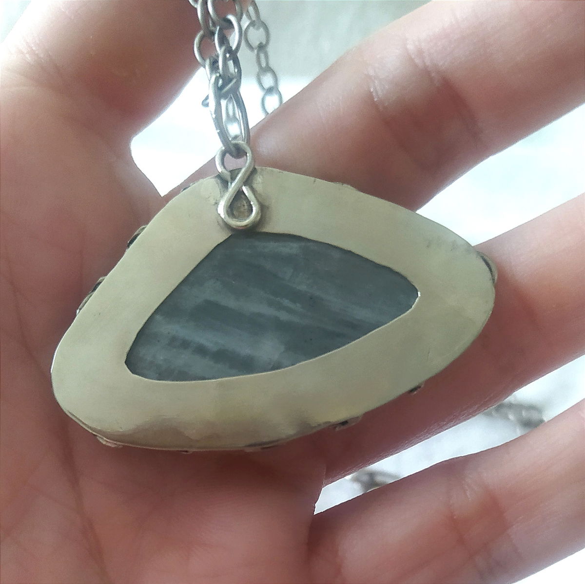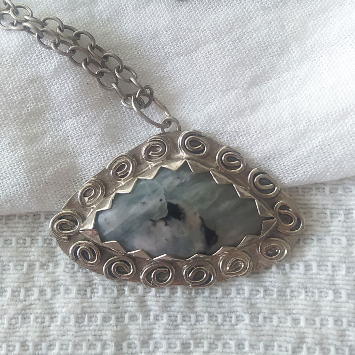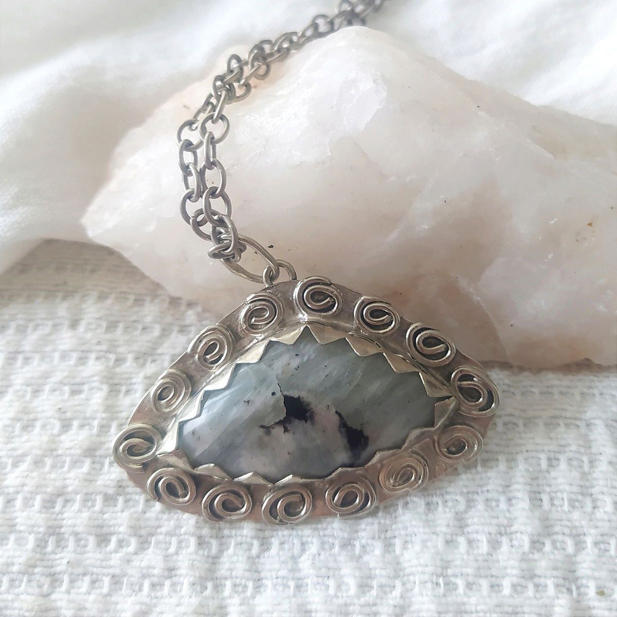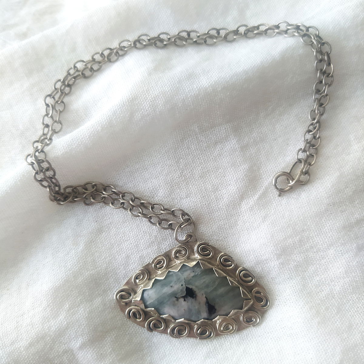Dije de Piedra de luna con Turmalina Negra trabajado en alpaca. Viene con cadena de alpaca incluida.