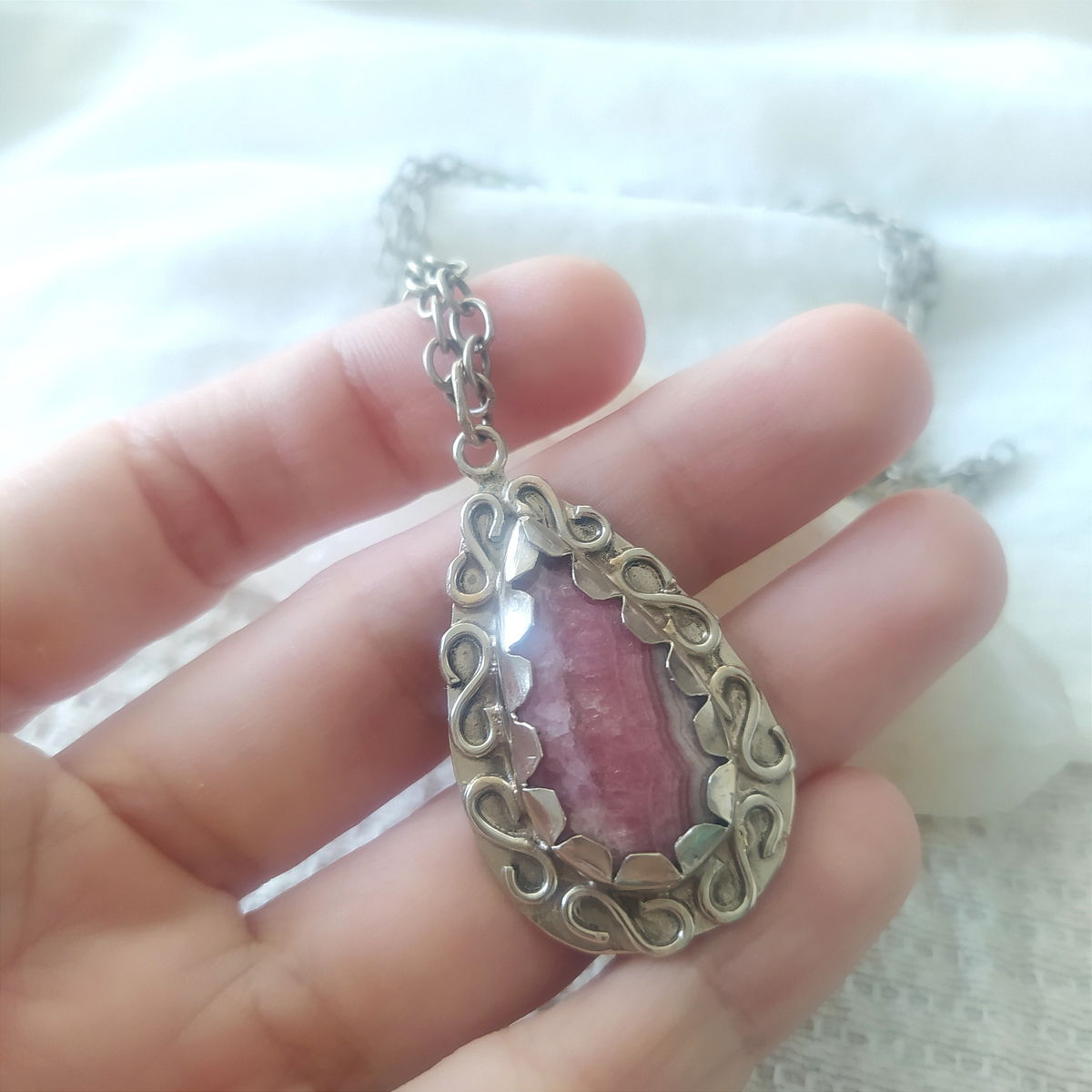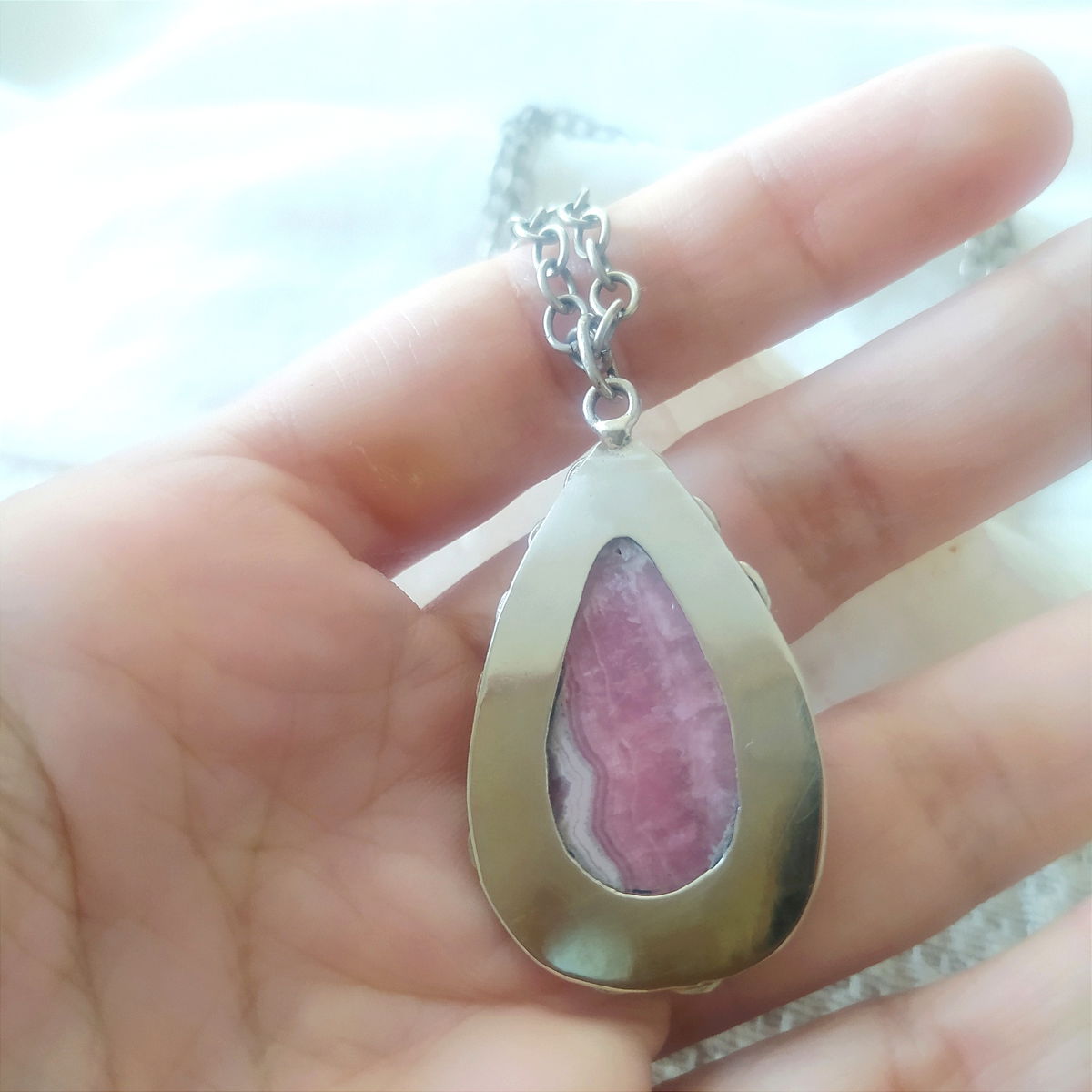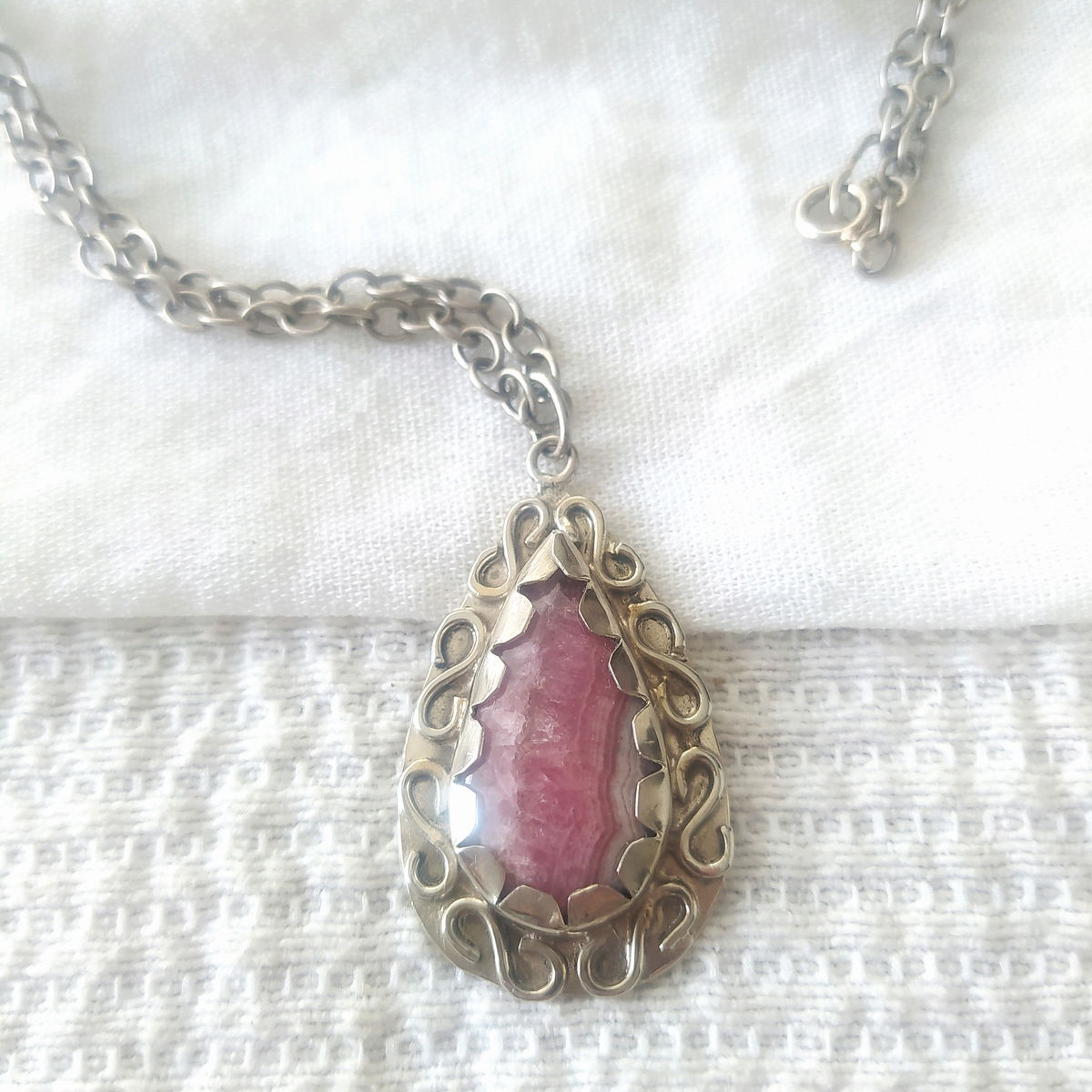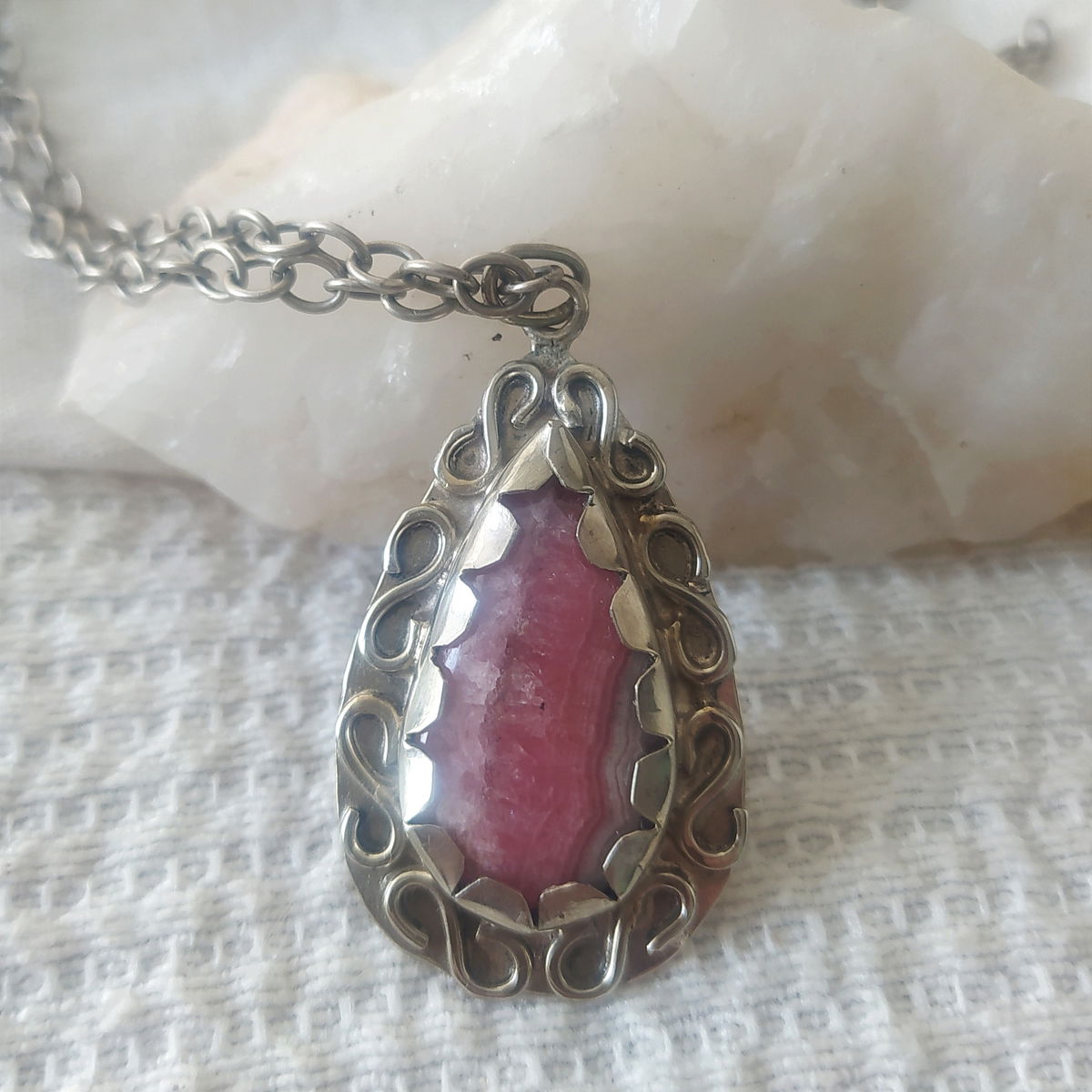 Dije de Rodocrosita trabajado en alpaca. Viene con cadena de alpaca incluida.