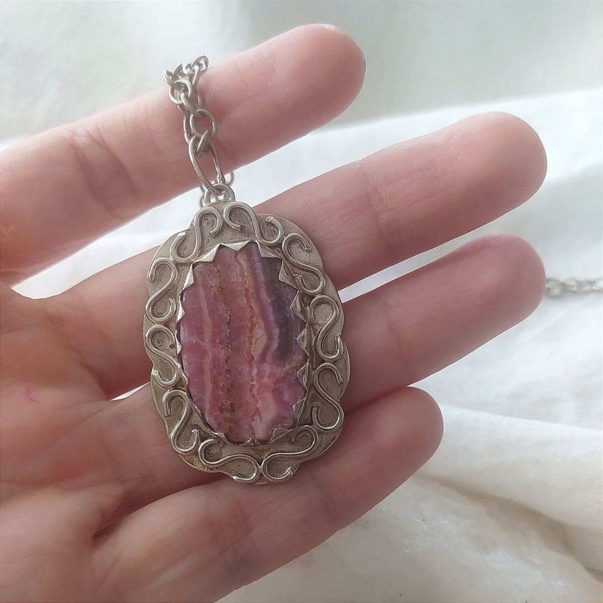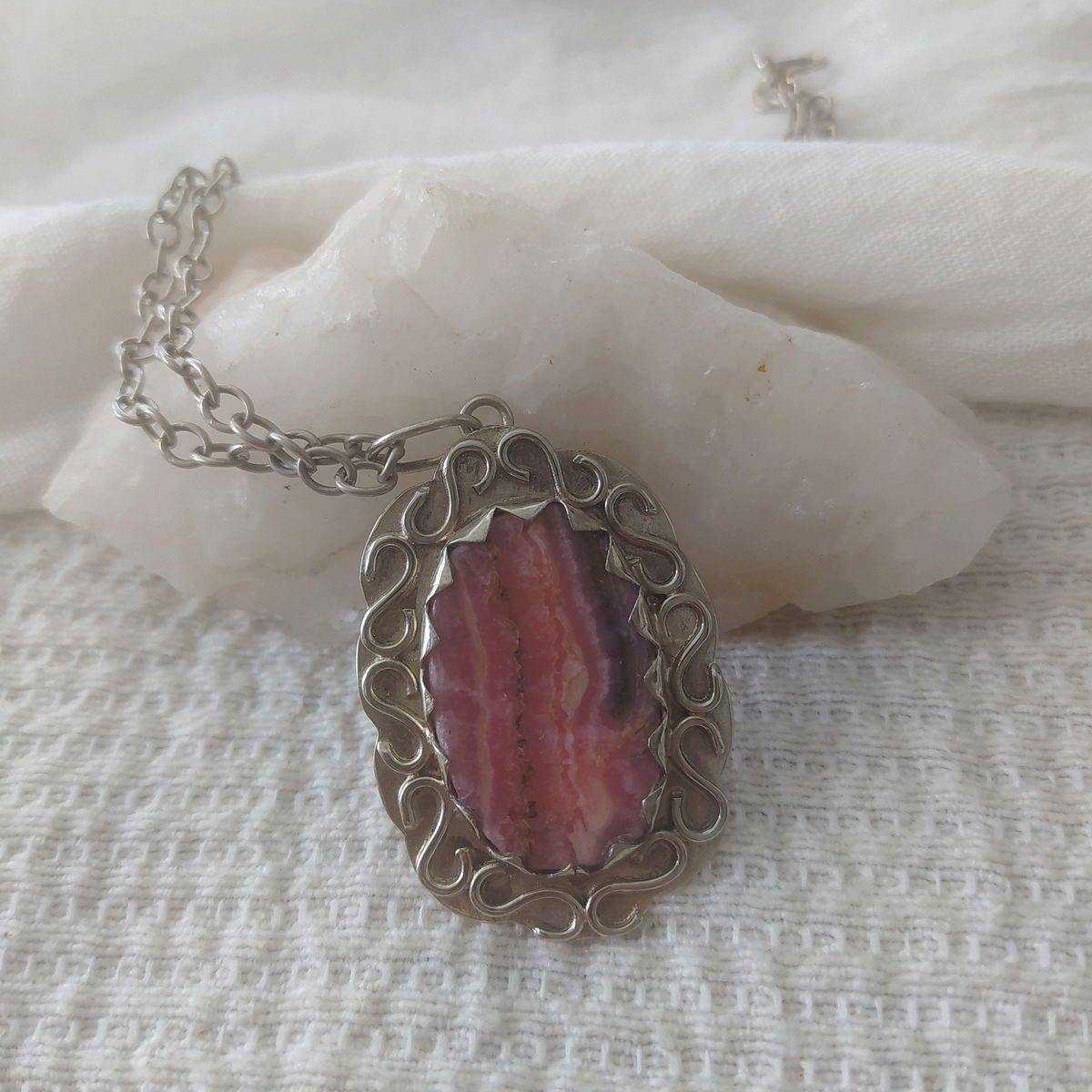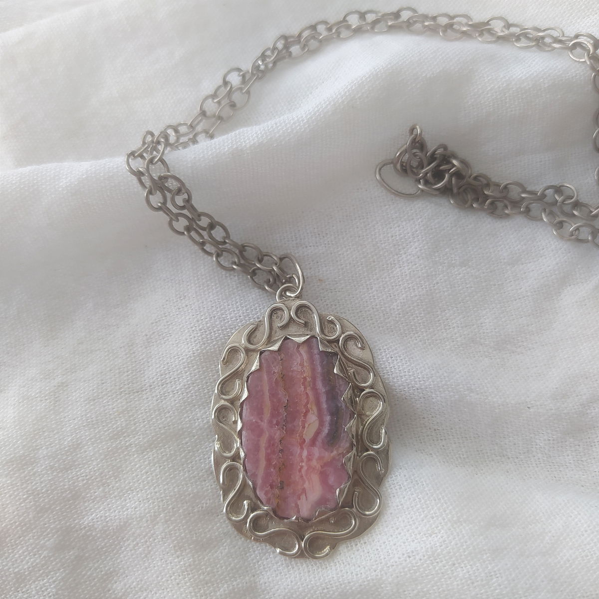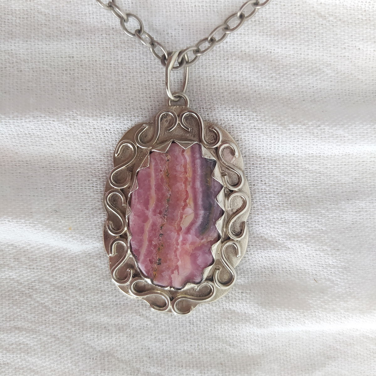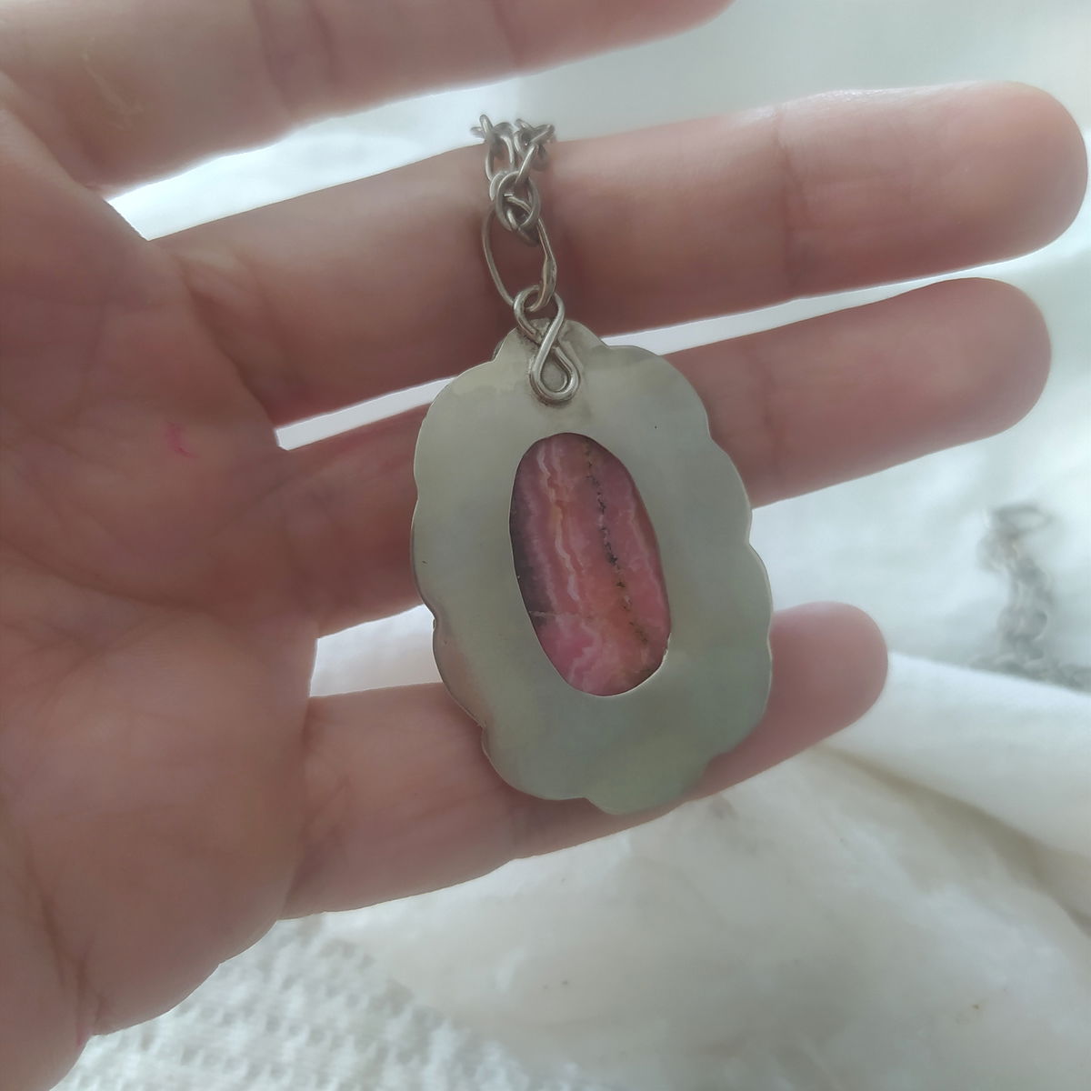 Dije de Rodocrosita trabajado en alpaca. Viene con cadena de alpaca incluida.