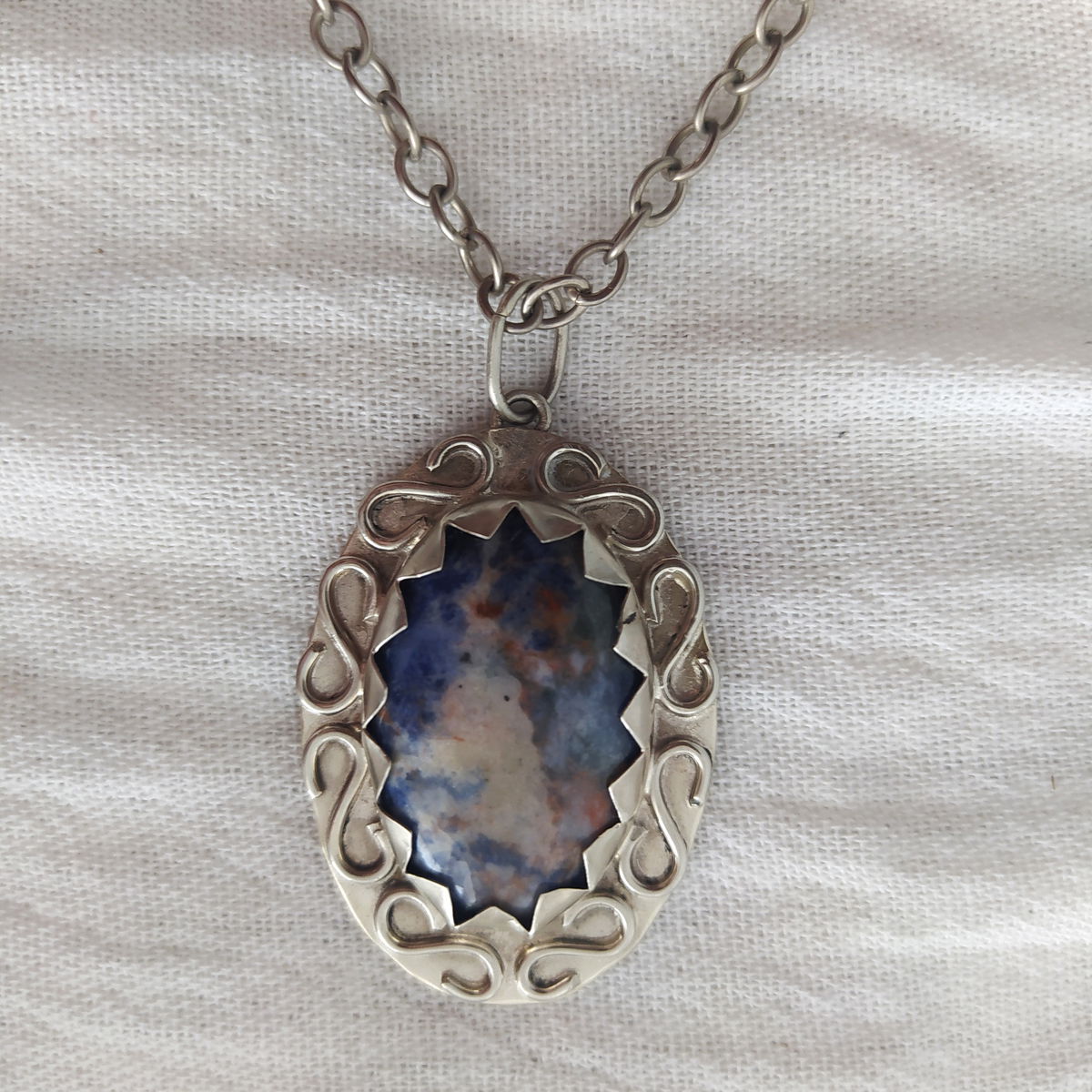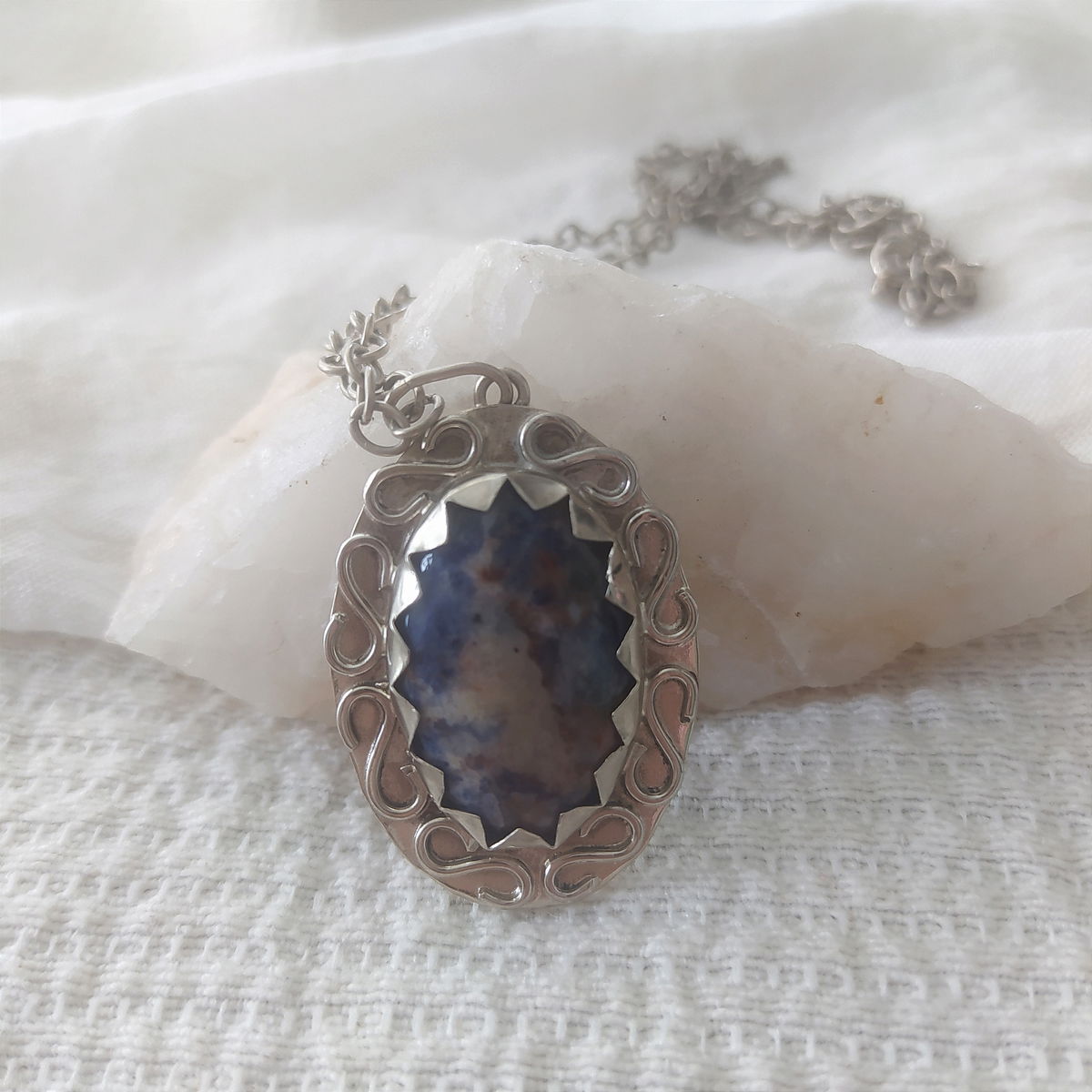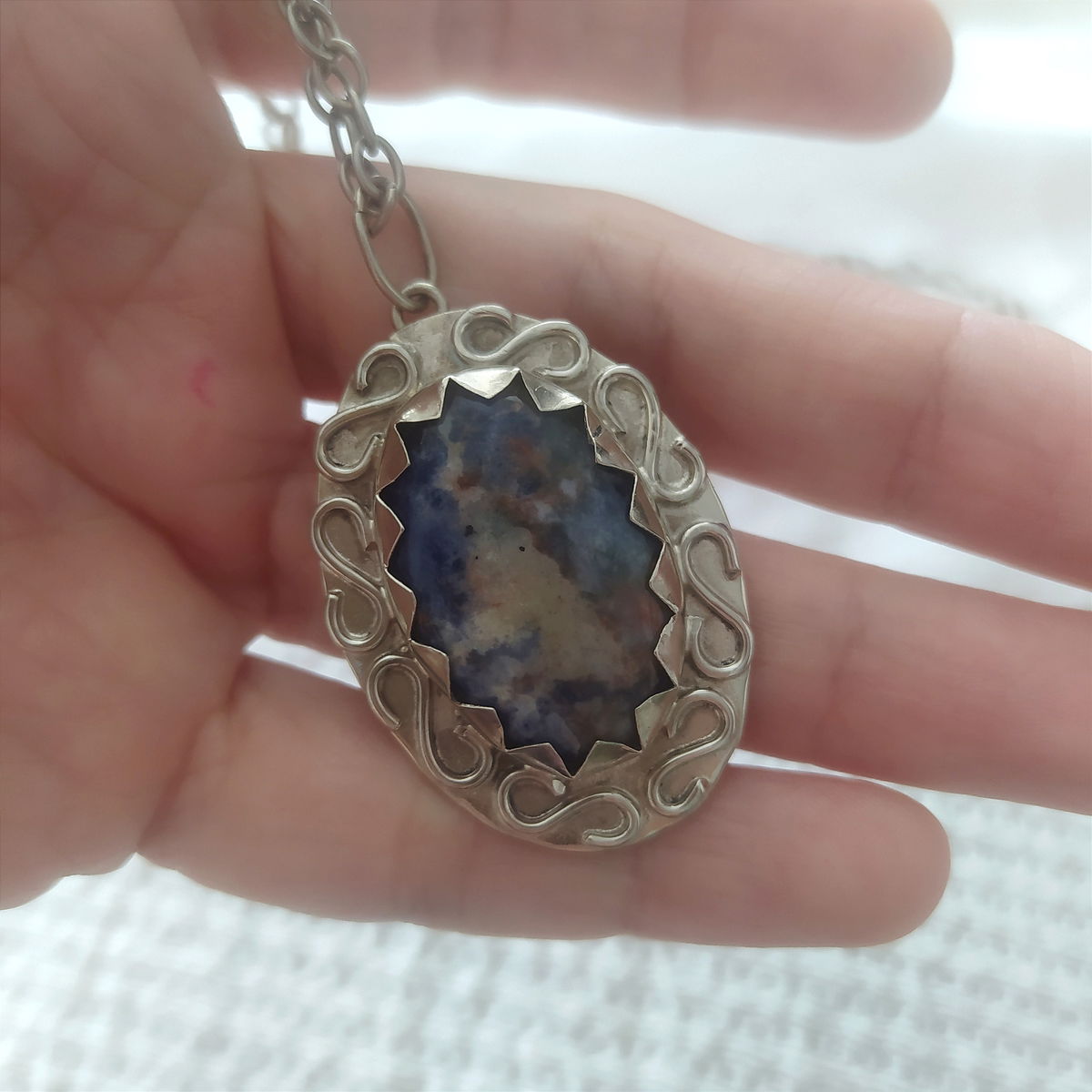 Dije de Sodalita trabajado en alpaca. Viene con cadena de alpaca incluida.