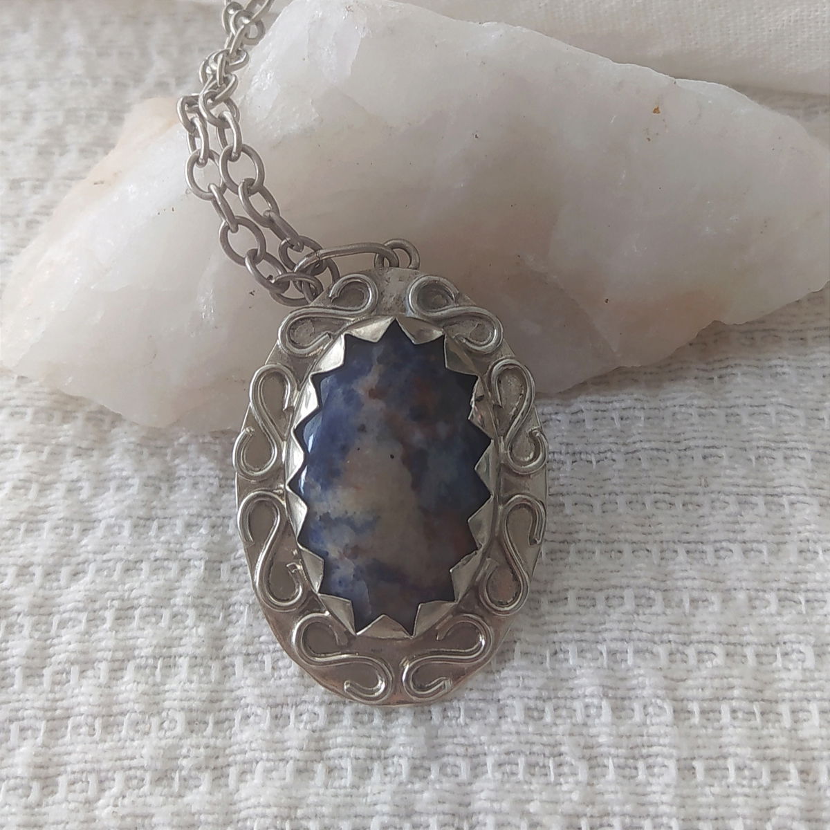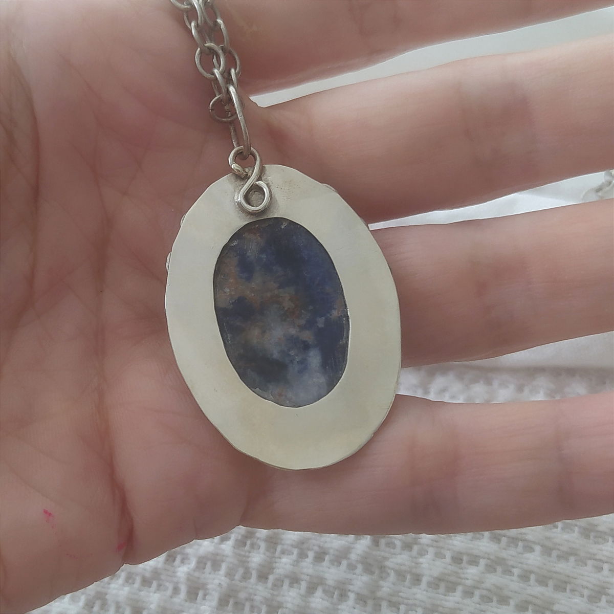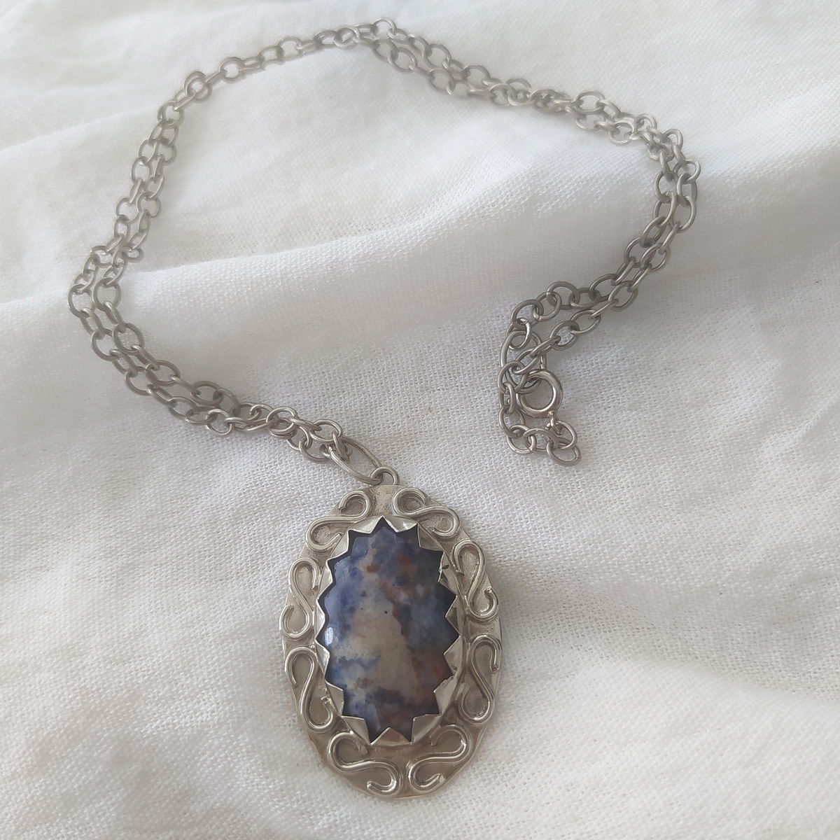 Dije de Sodalita trabajado en alpaca. Viene con cadena de alpaca incluida.