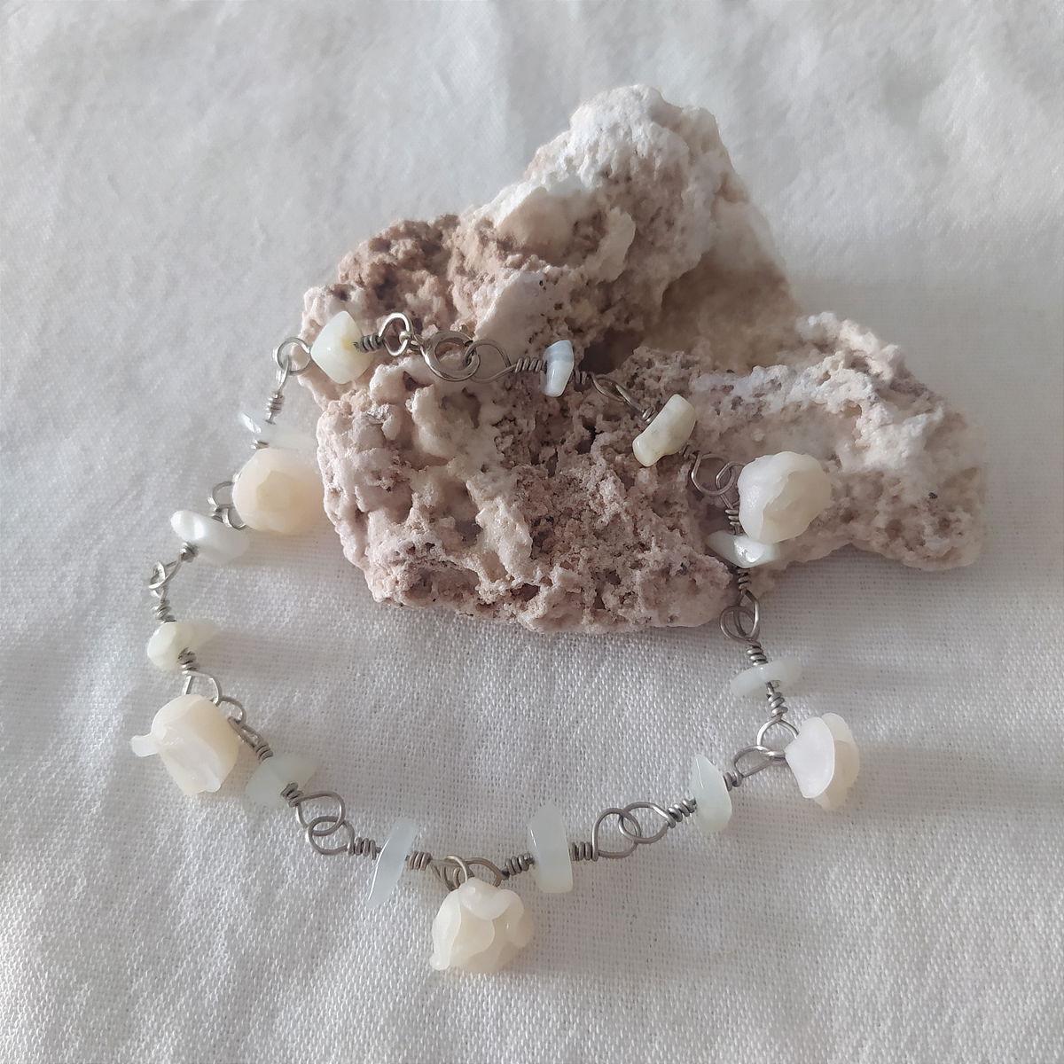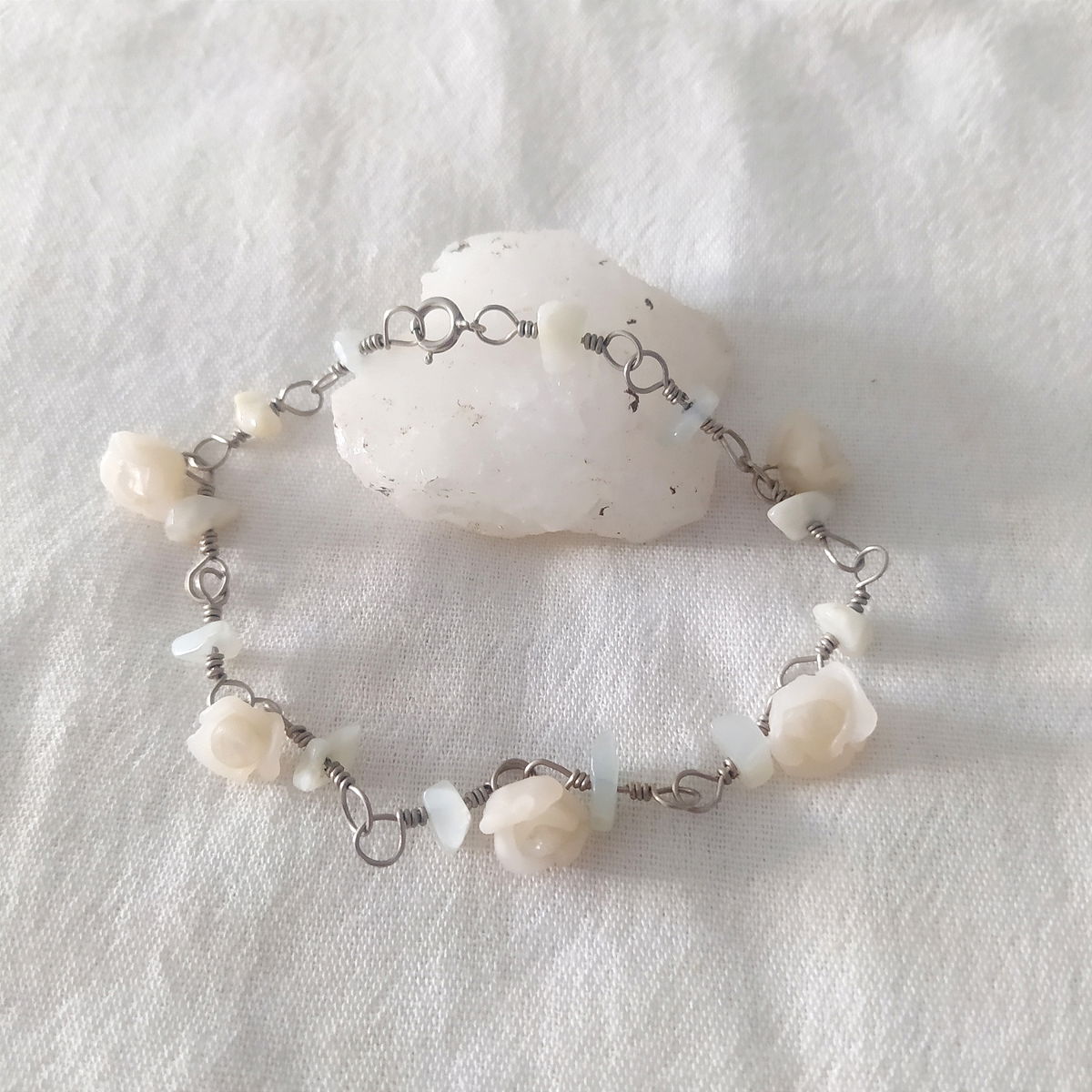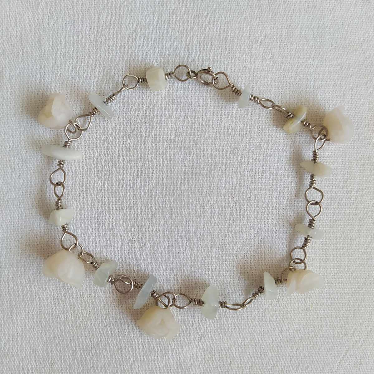 Tobillera de alpaca con jade blanco y flores blancas