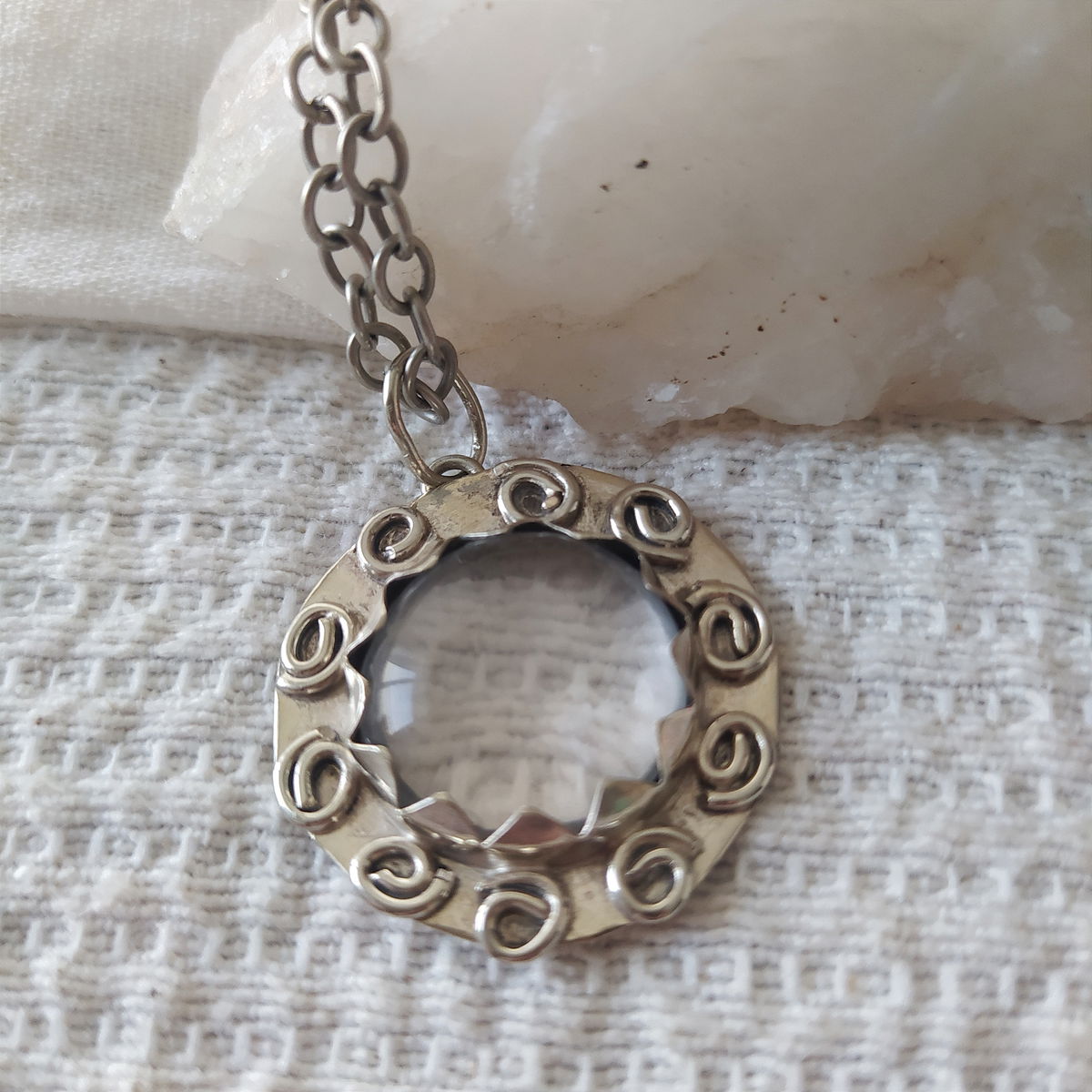 Dije de cuarzo cristal trabajado en alpaca. Viene con cadena de alpaca incluida.