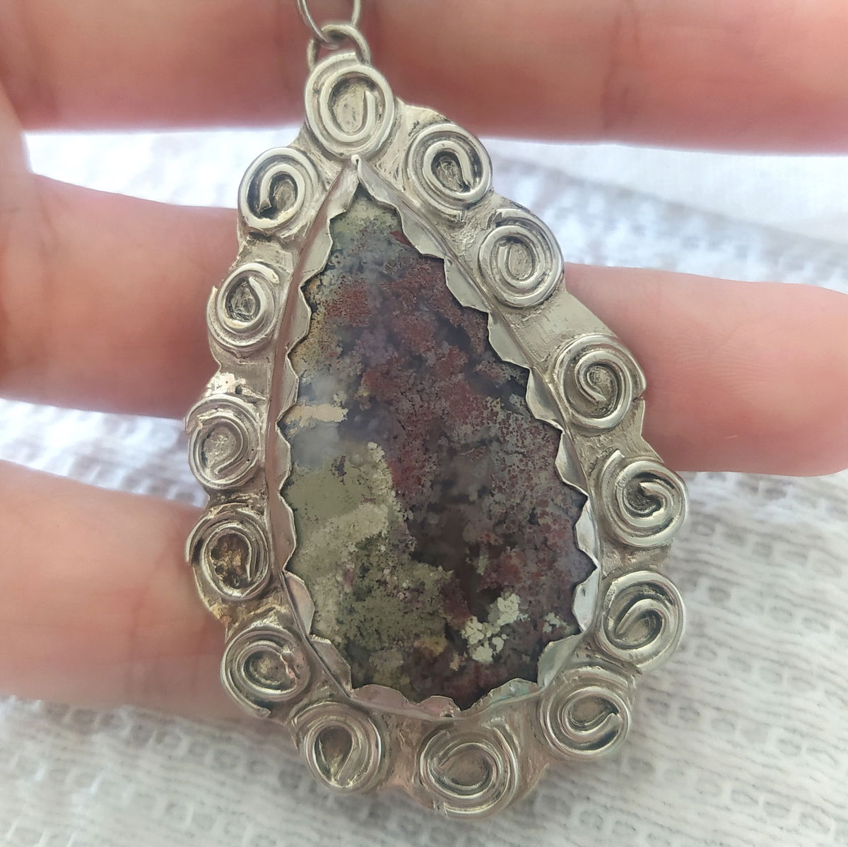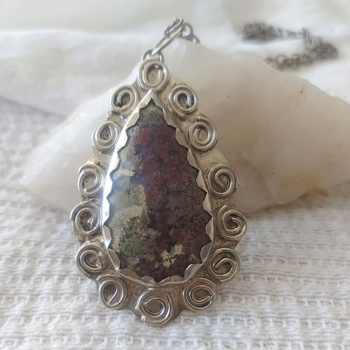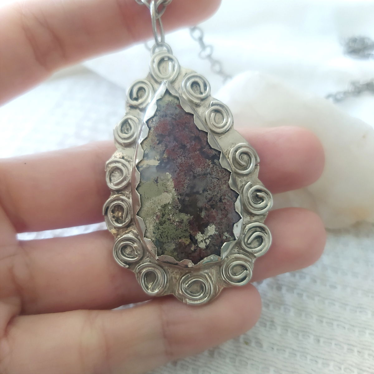 Dije de Ágata Musgo de Indonesia hecho a mano en alpaca. Viene con cadena de alpaca incluida.