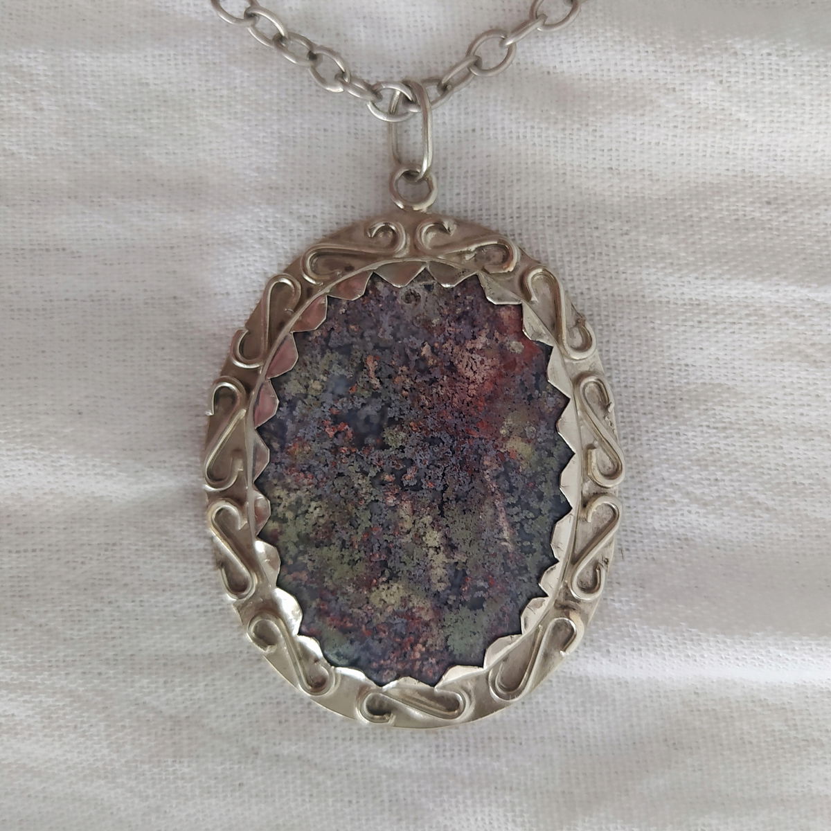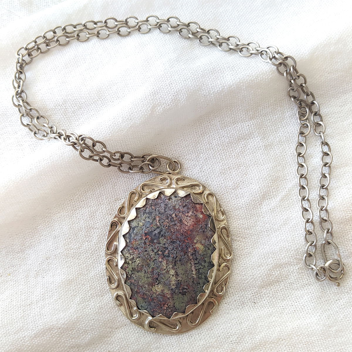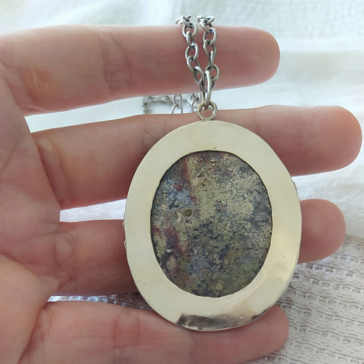 Dije de Ágata Musgo de Indonesia hecho a mano en alpaca. Viene con cadena de alpaca incluida.