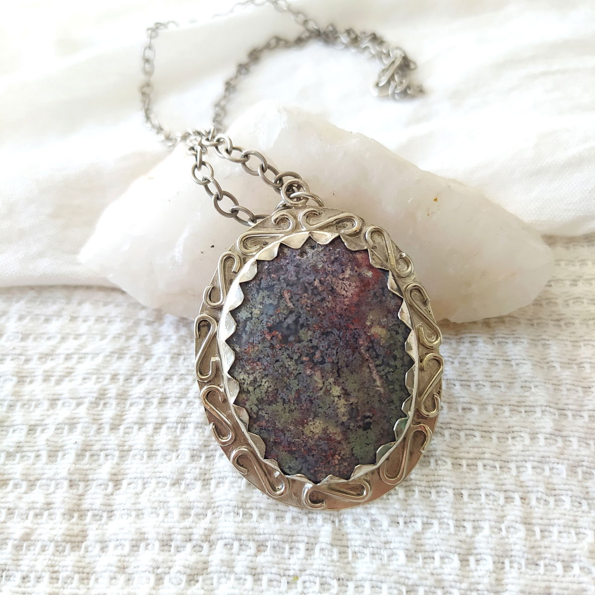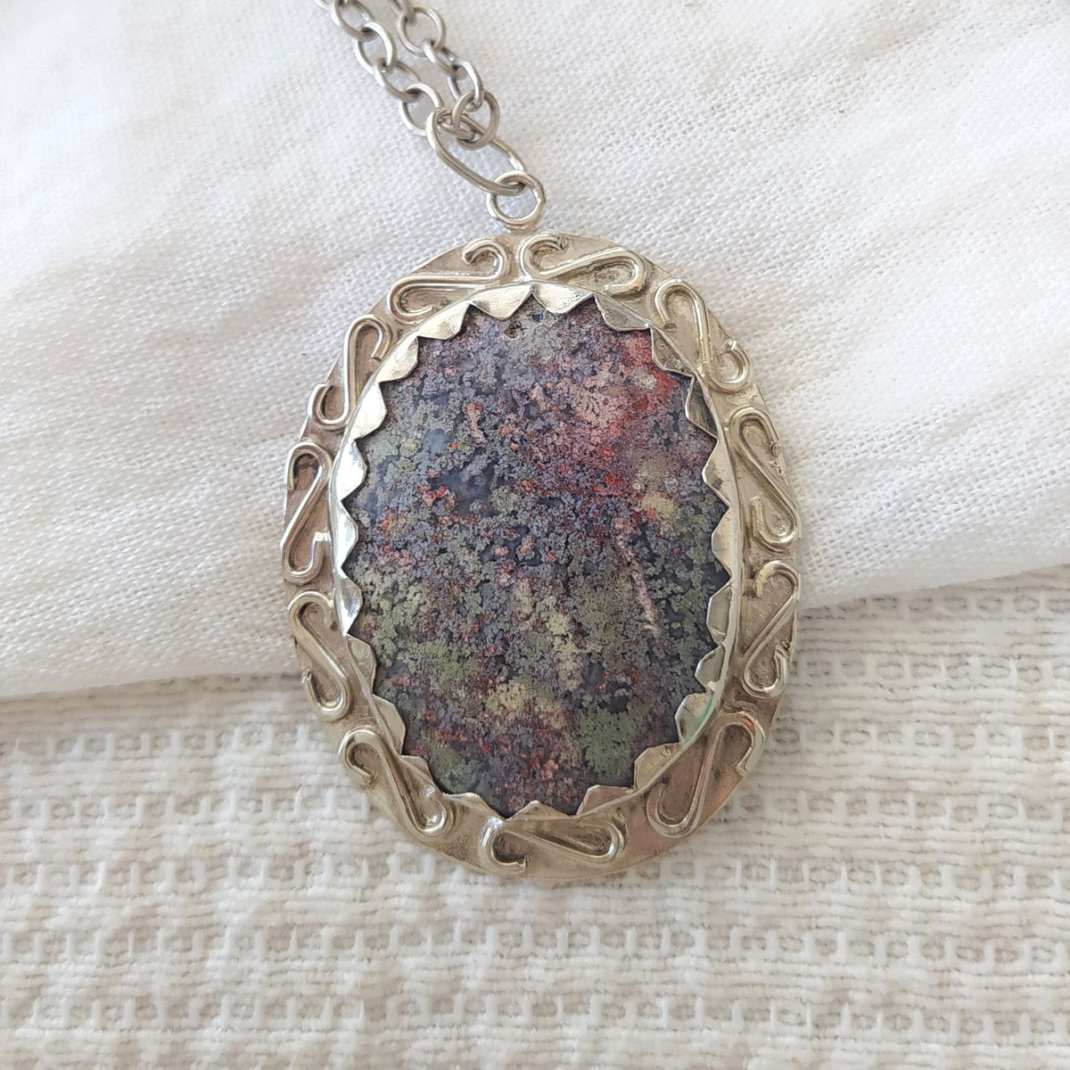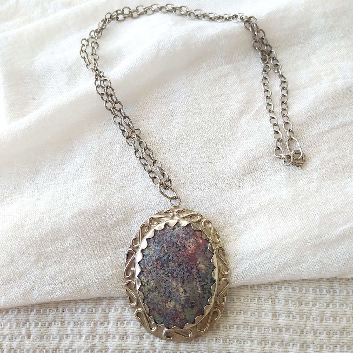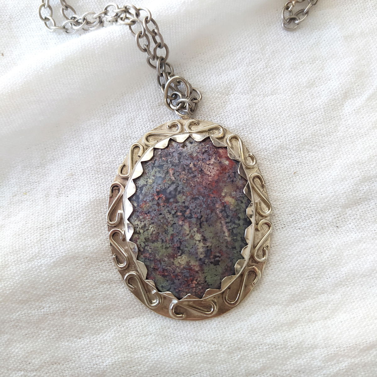 Dije de Ágata Musgo de Indonesia hecho a mano en alpaca. Viene con cadena de alpaca incluida.