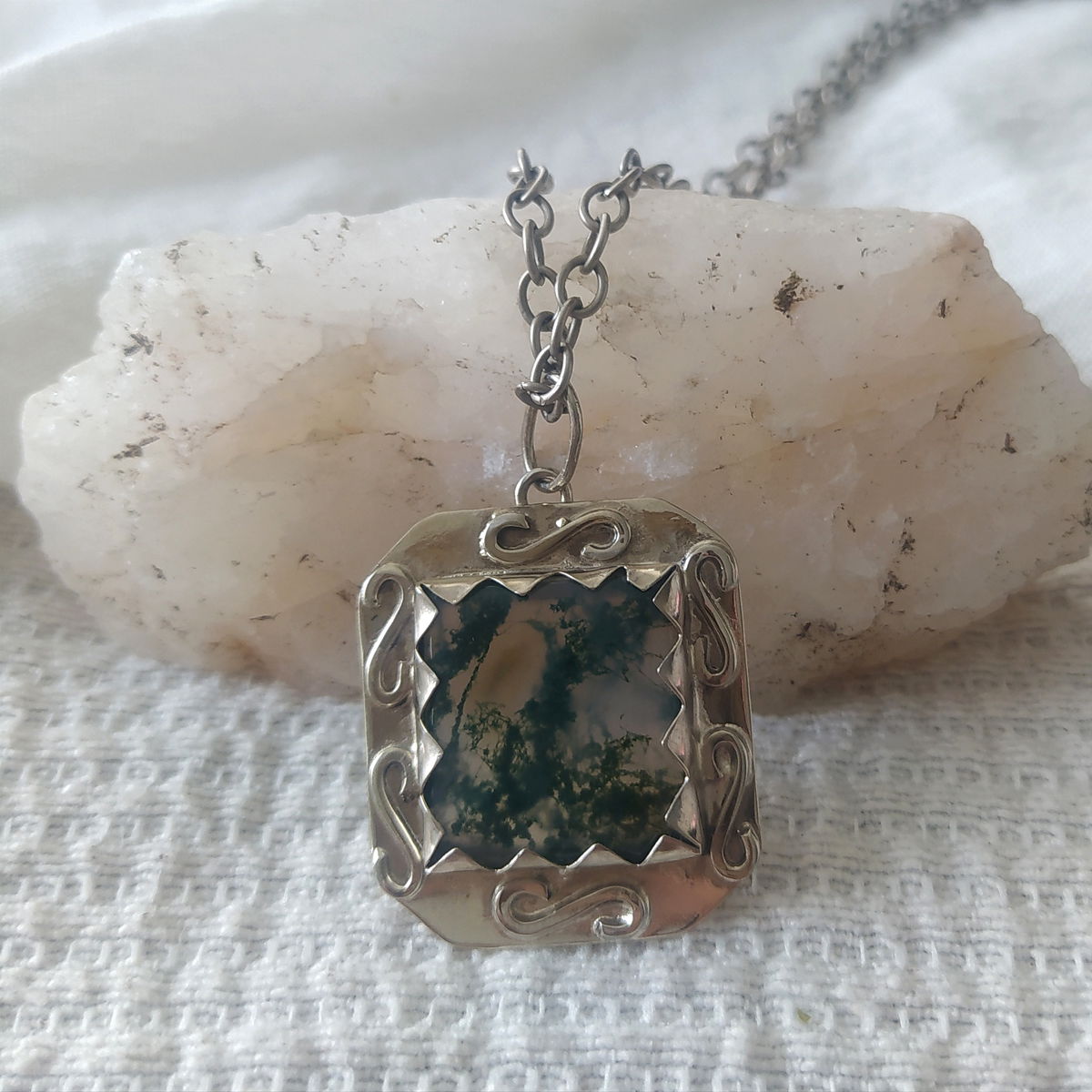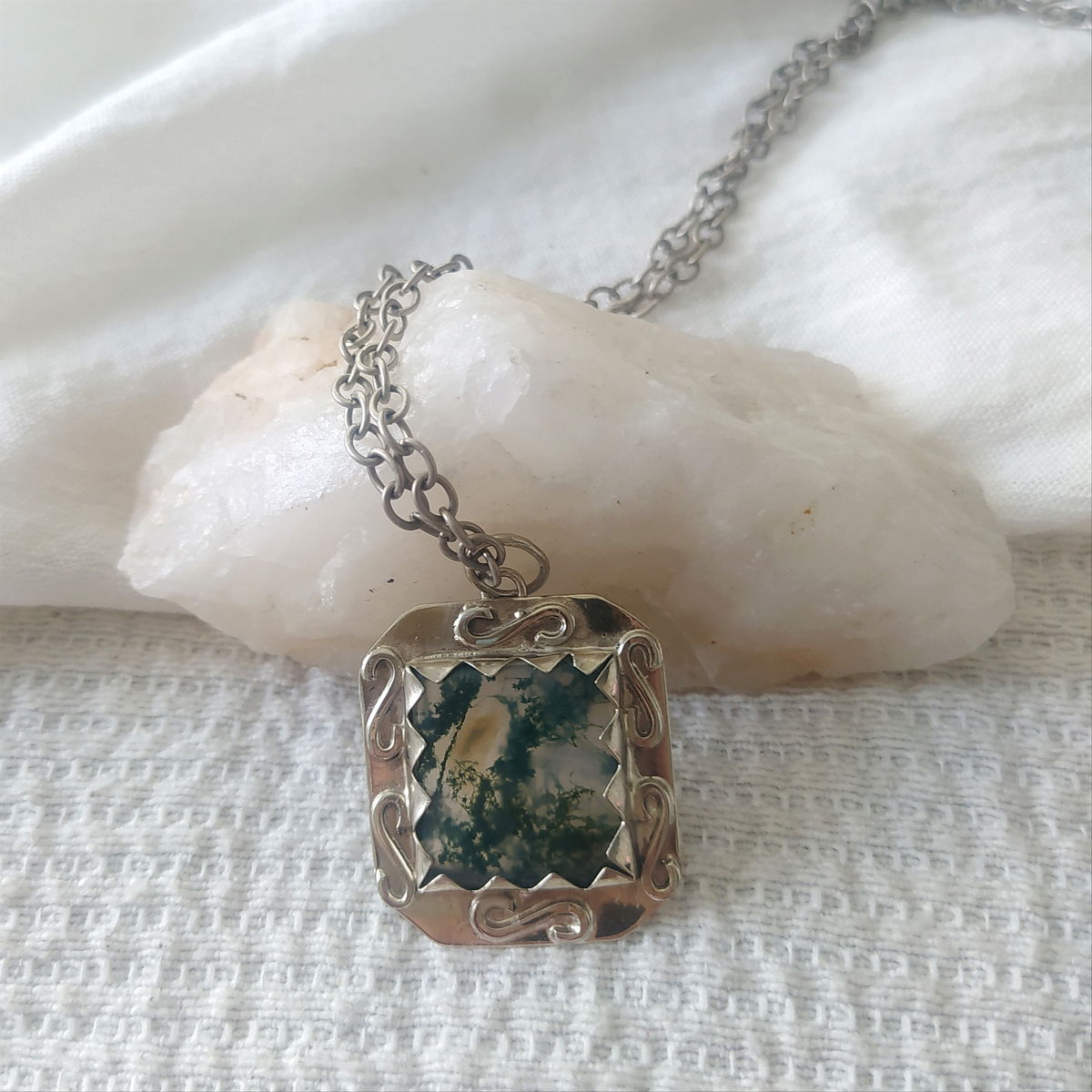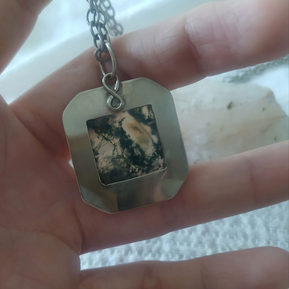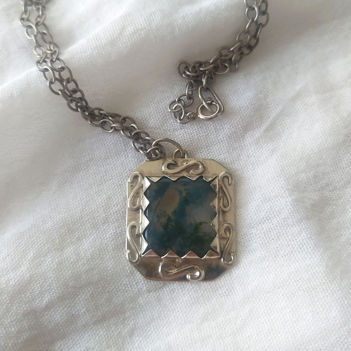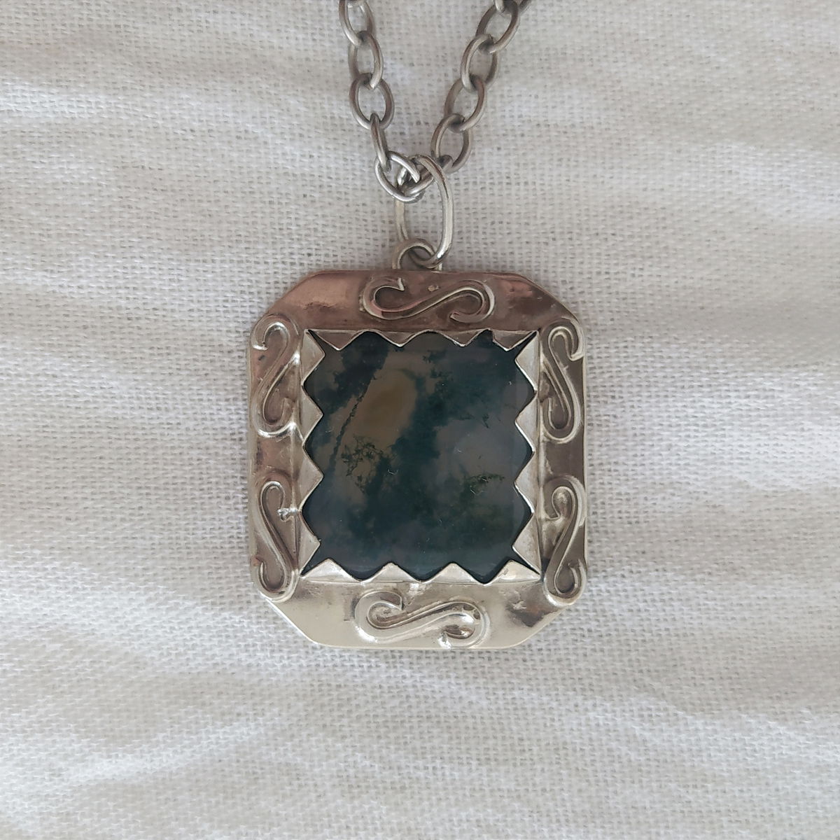 Dije de Ágata Musgo hecho a mano en alpaca. Viene con cadena de alpaca incluida.