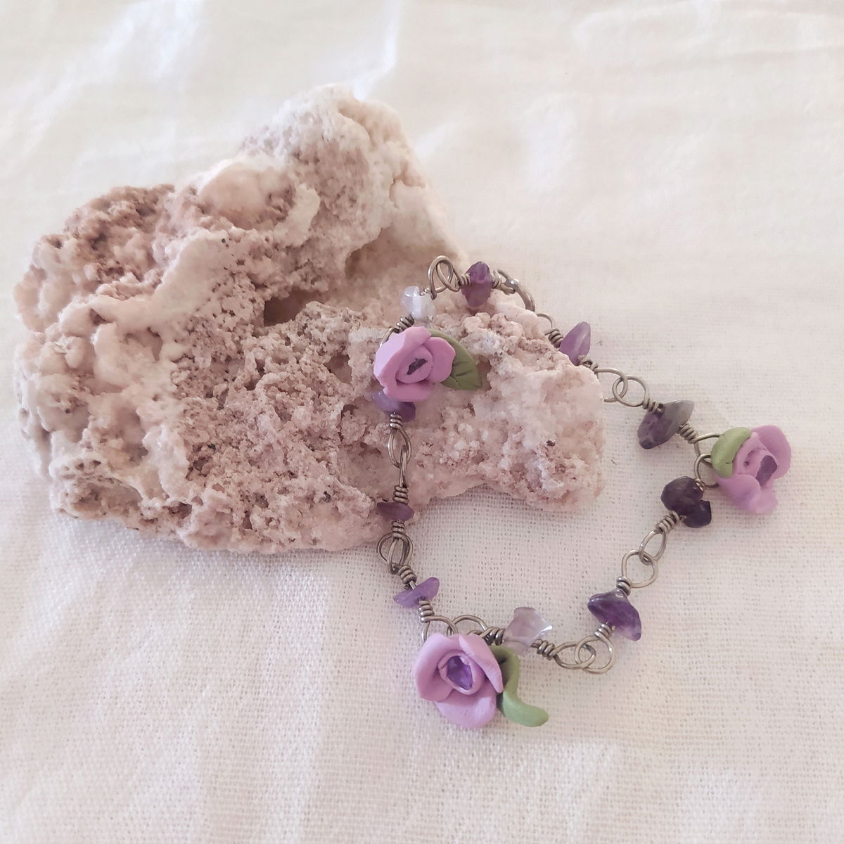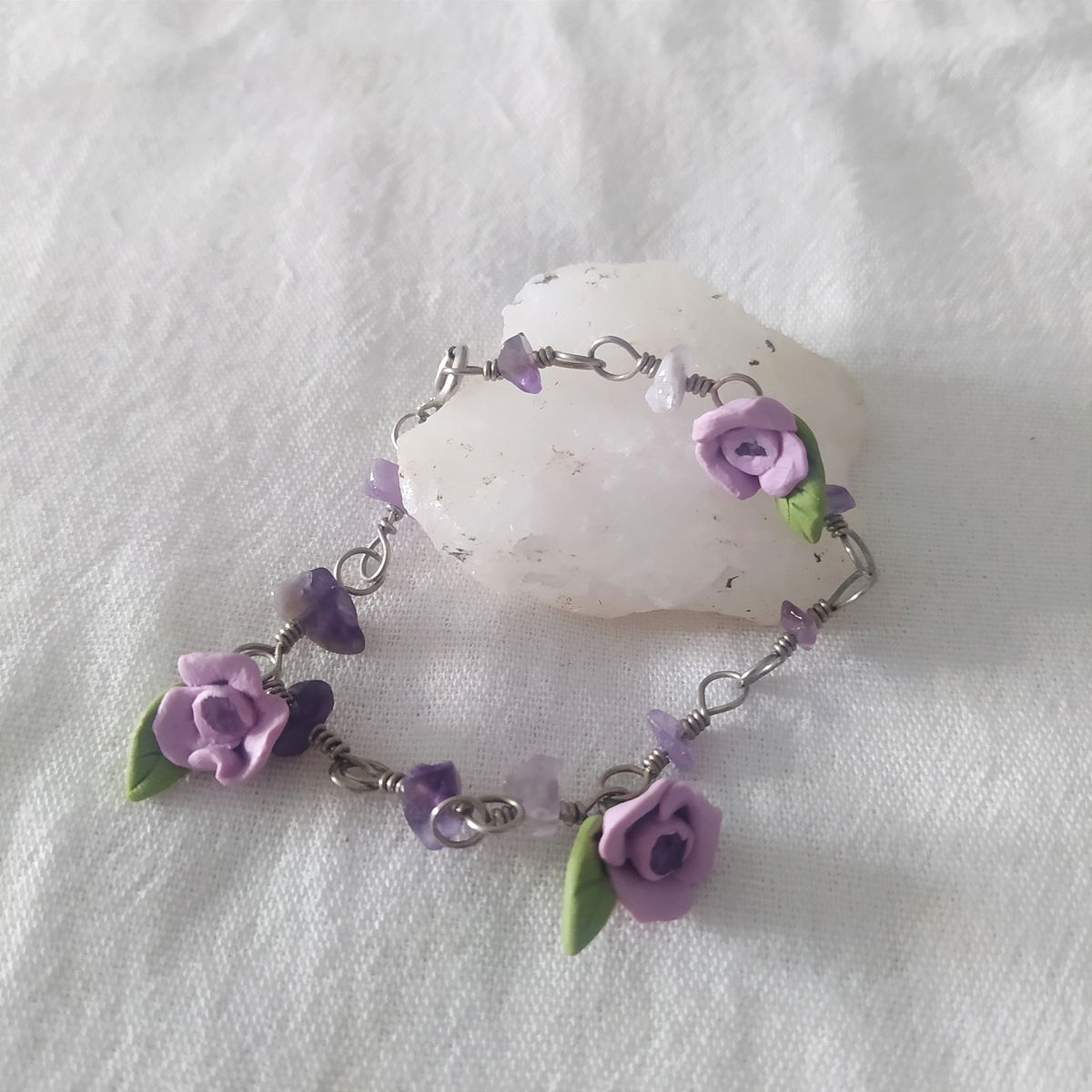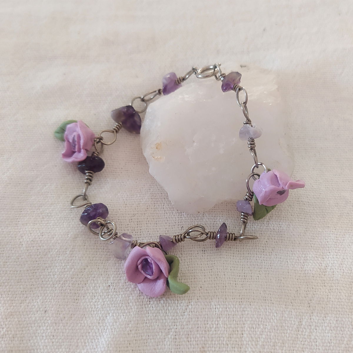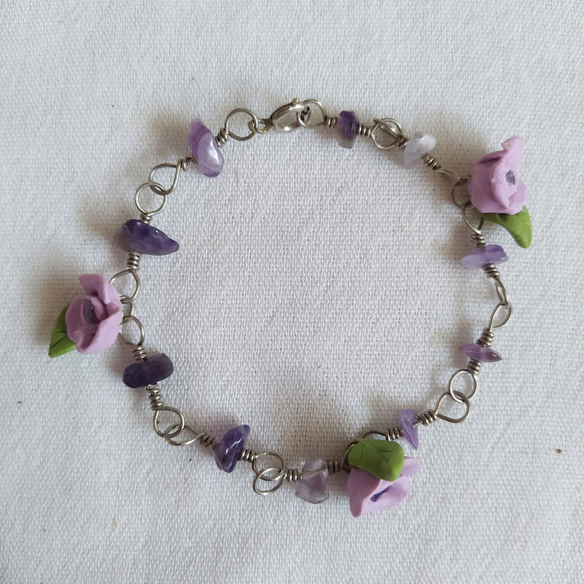 Pulsera de alpaca con amatista y flores lilas