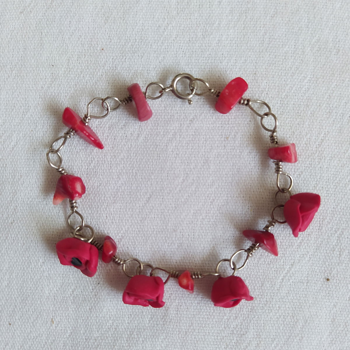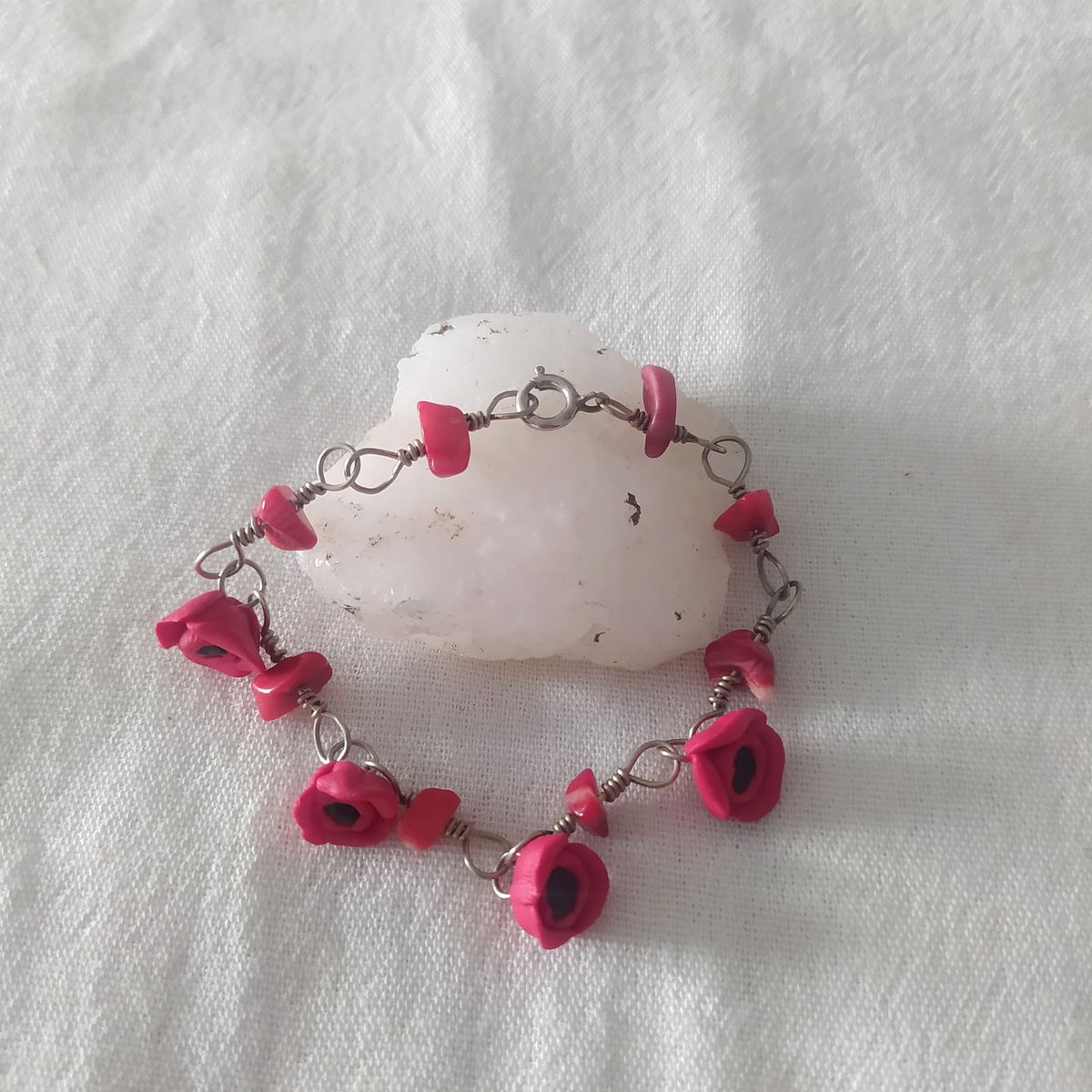 Pulsera de alpaca con coral y flores rojas con turmalina negra en su interior