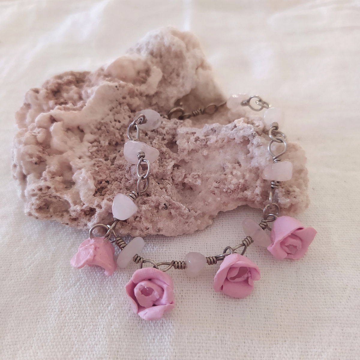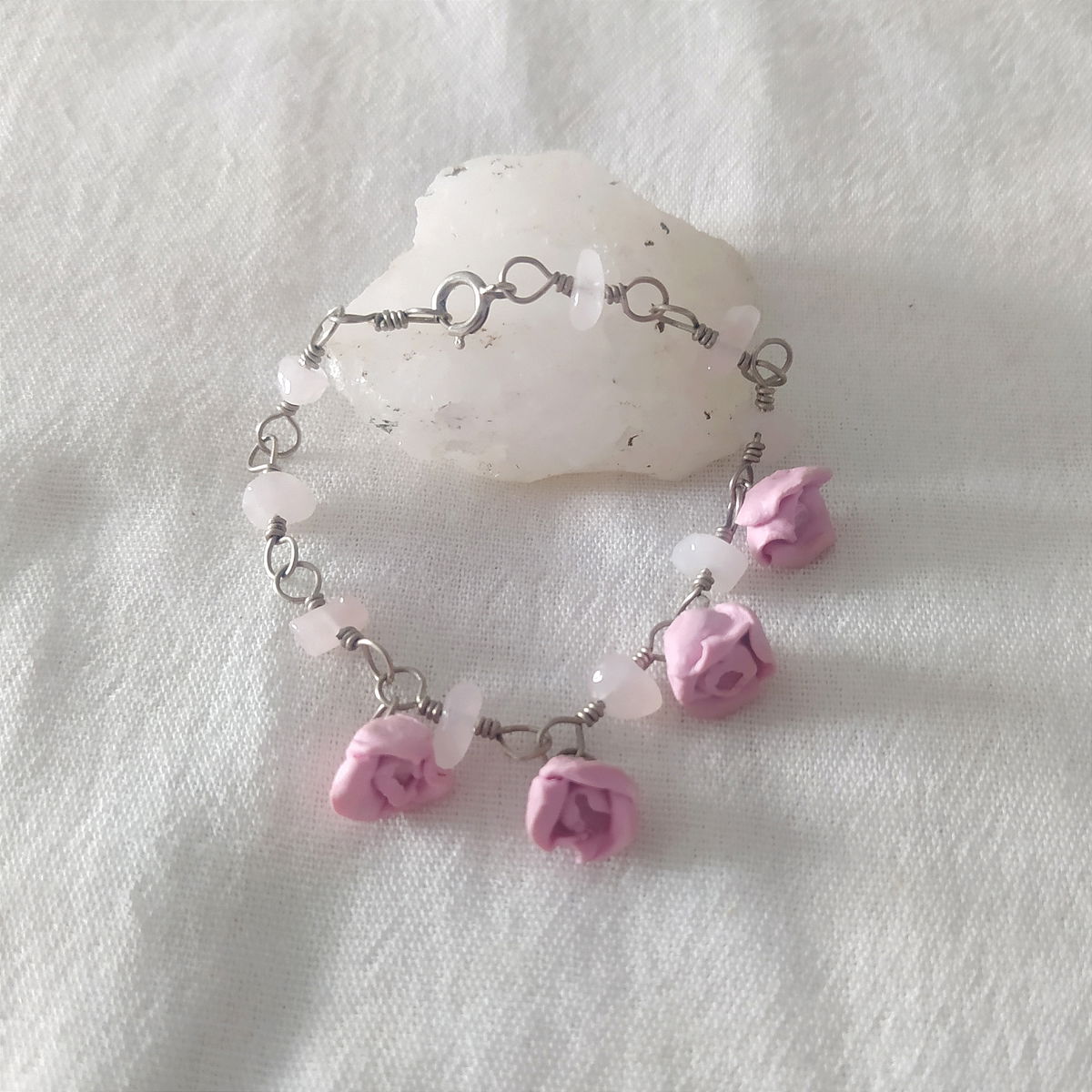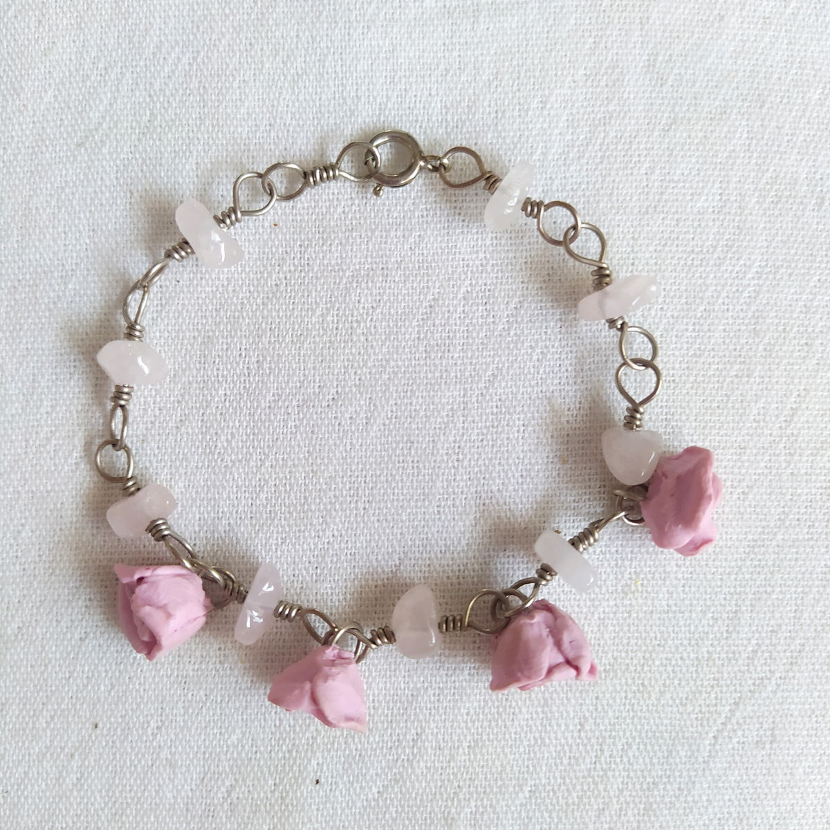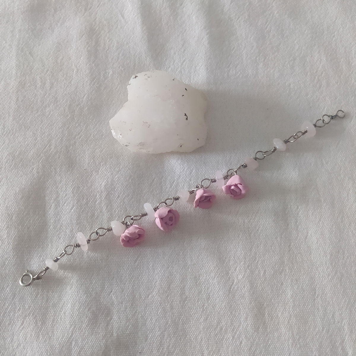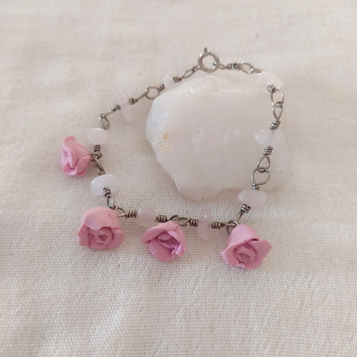 Pulsera de alpaca con cuarzo rosa y flores rosas