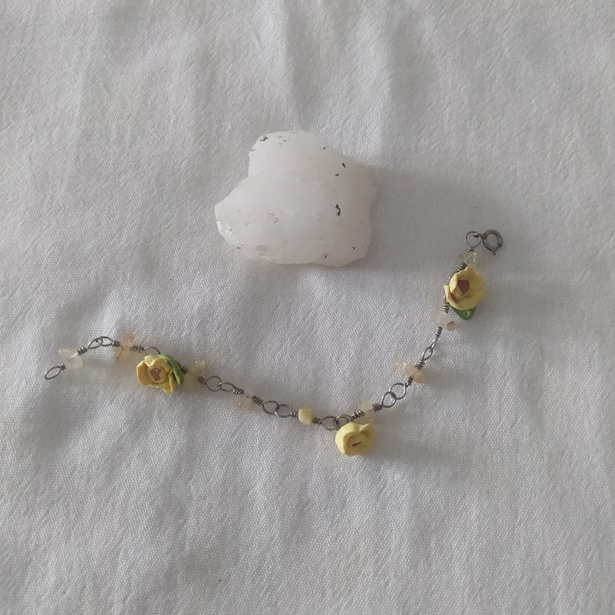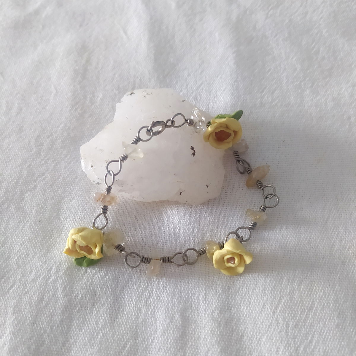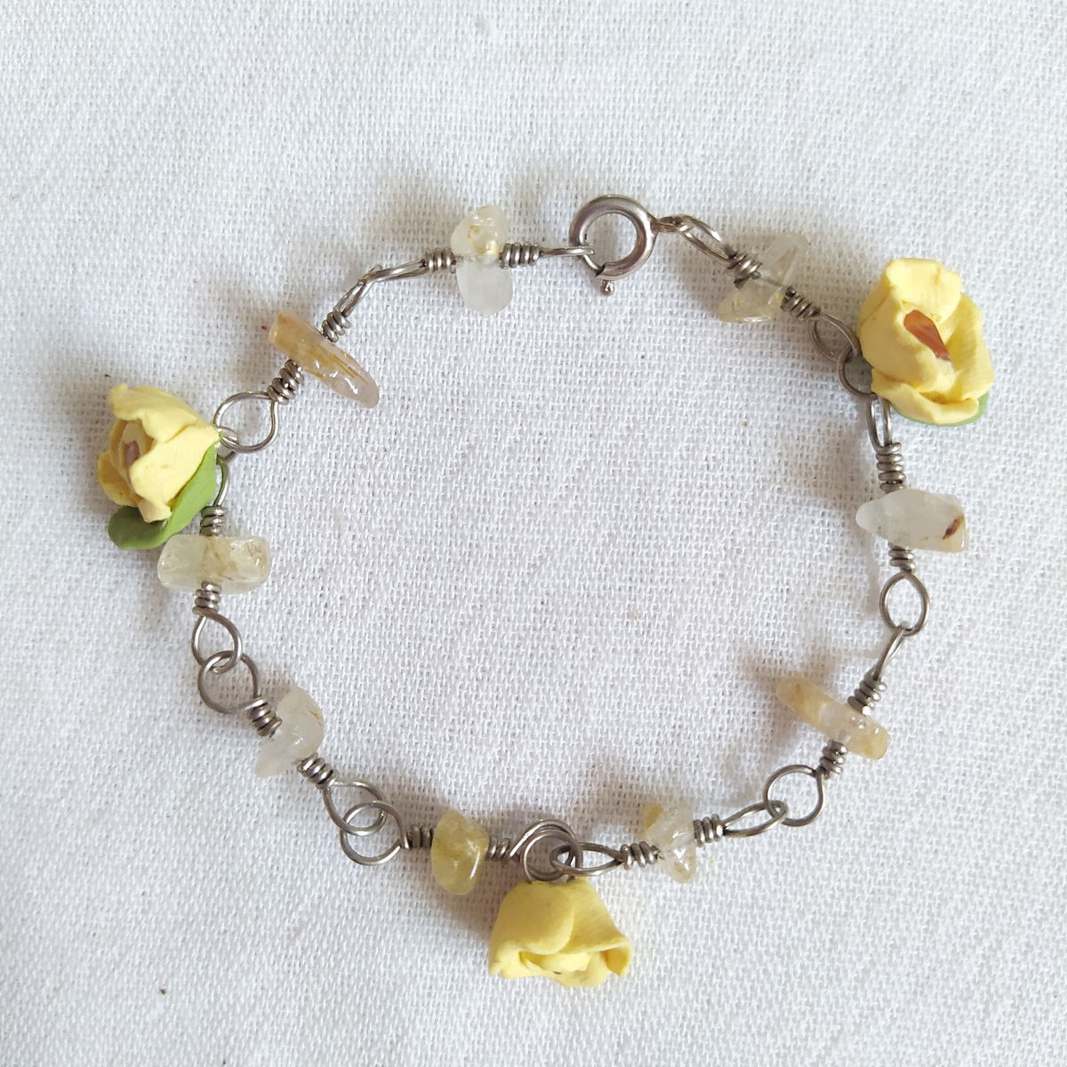 Pulsera de alpaca con cuarzo rutilado y flores amarillas