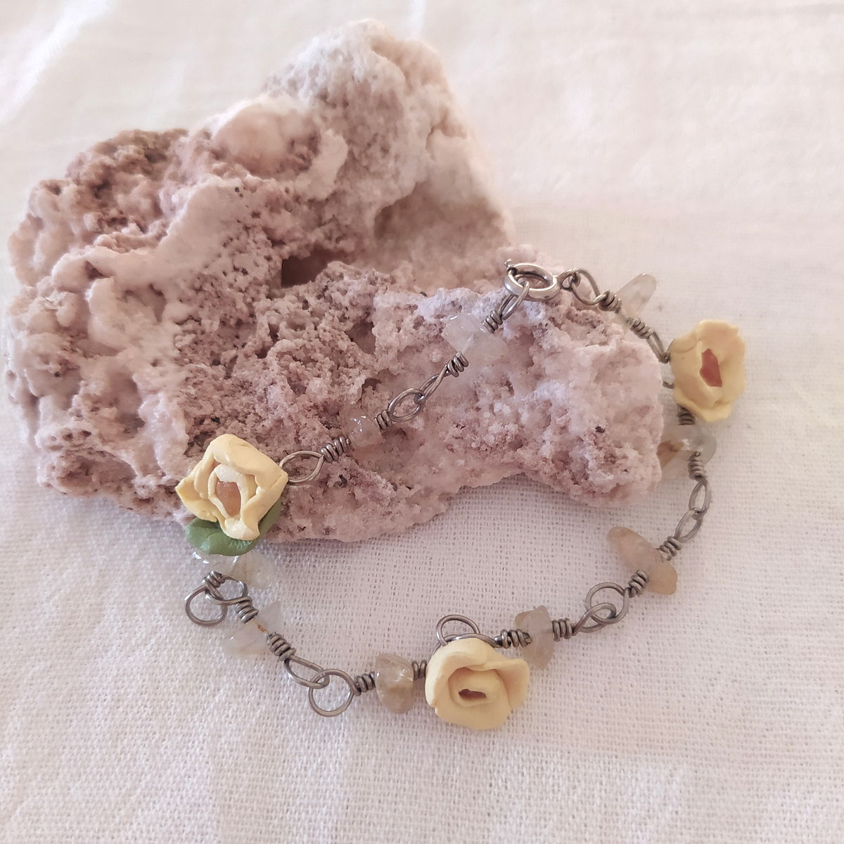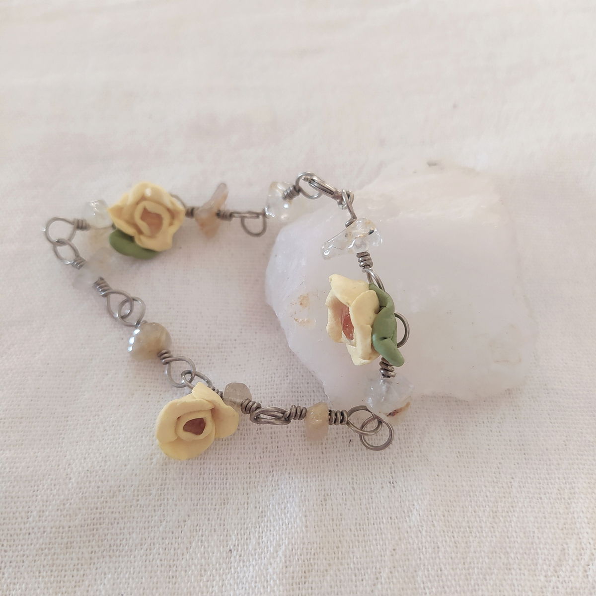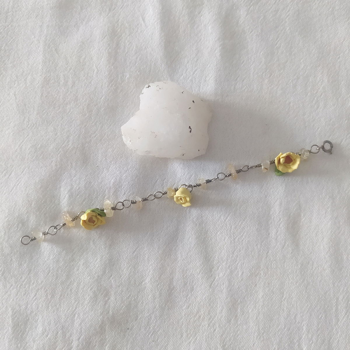 Pulsera de alpaca con cuarzo rutilado y flores amarillas