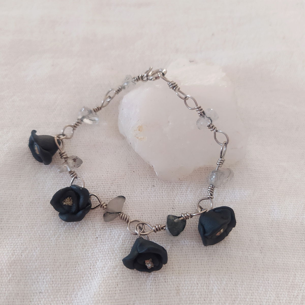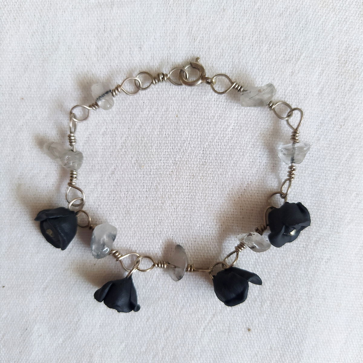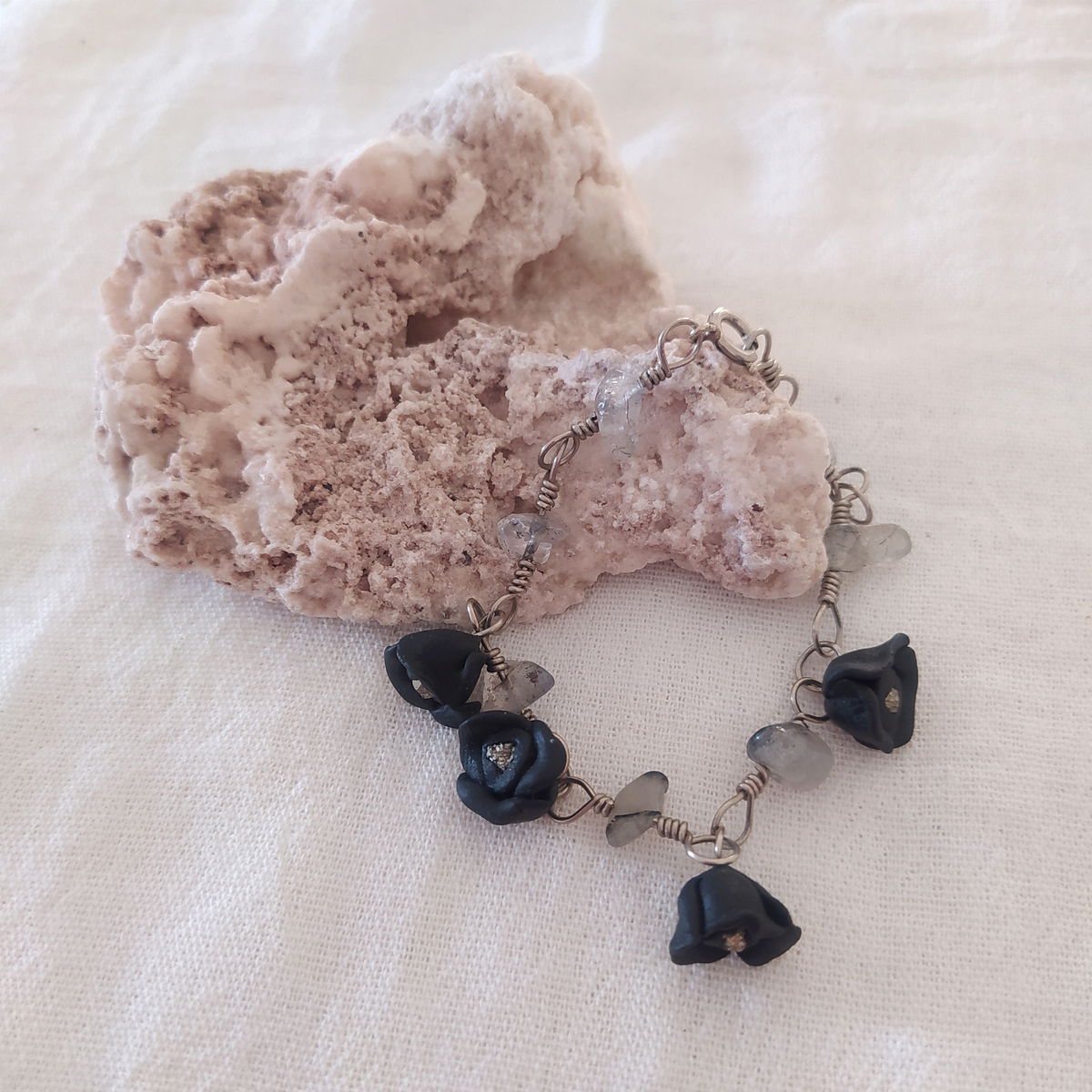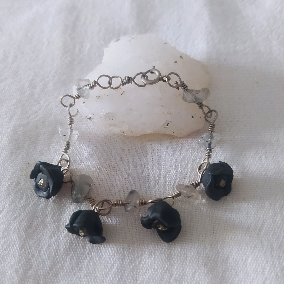 Pulsera de alpaca con cuarzo turmalinado y flores negras.