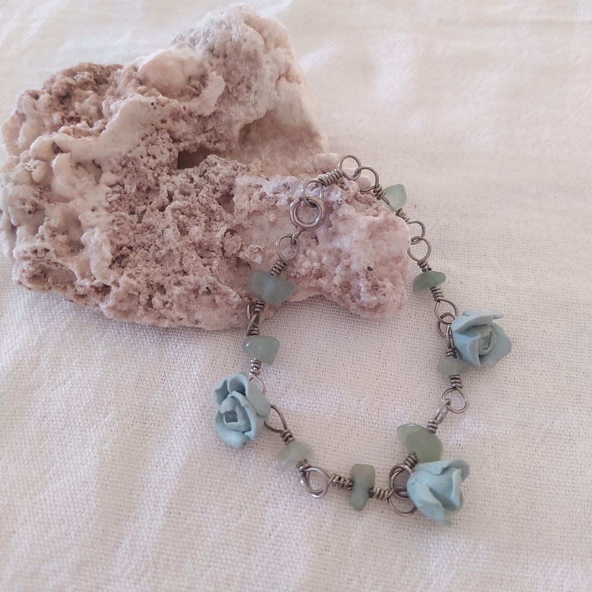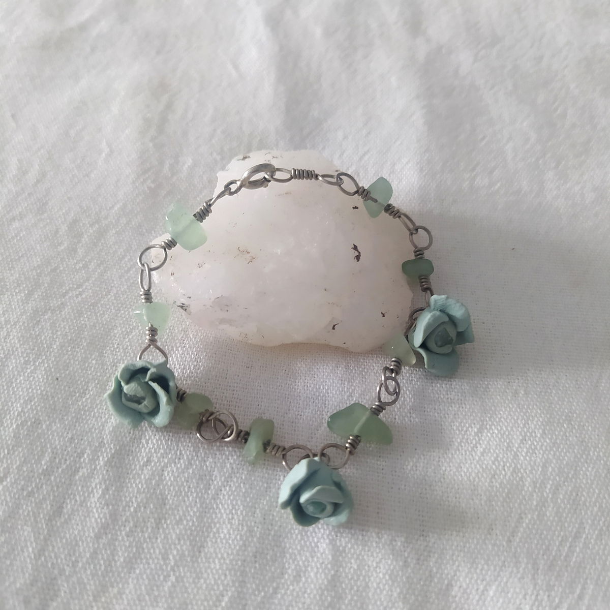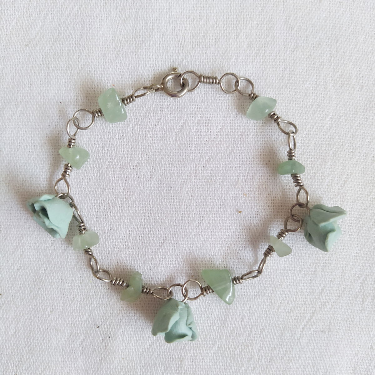 Pulsera de alpaca con jade y flores verde aqua