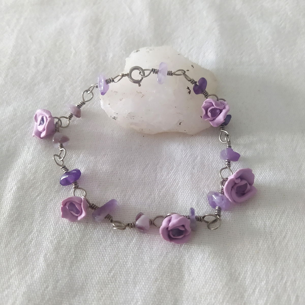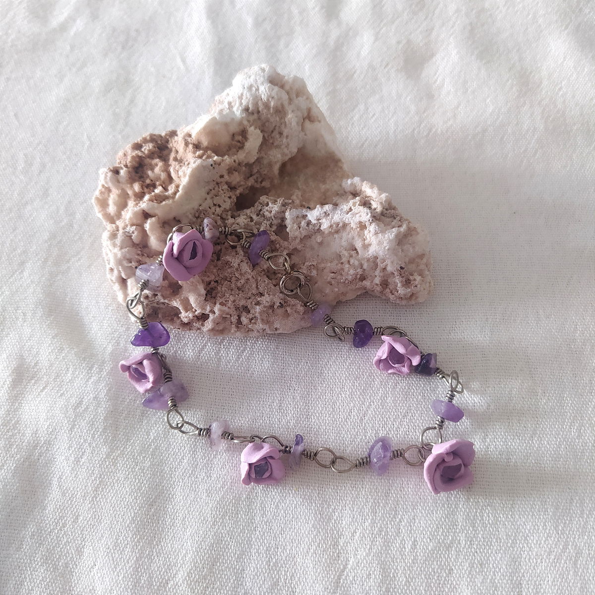 Tobillera de alpaca con amatista y flores lilas