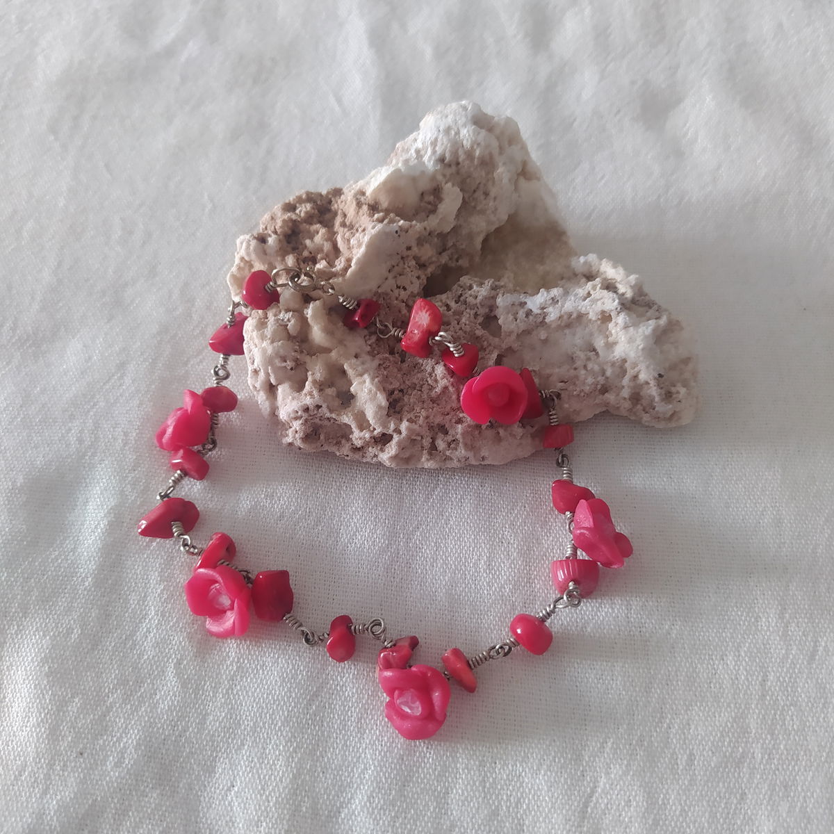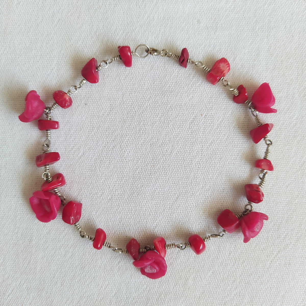 Tobillera de alpaca con coral y flores rojas
