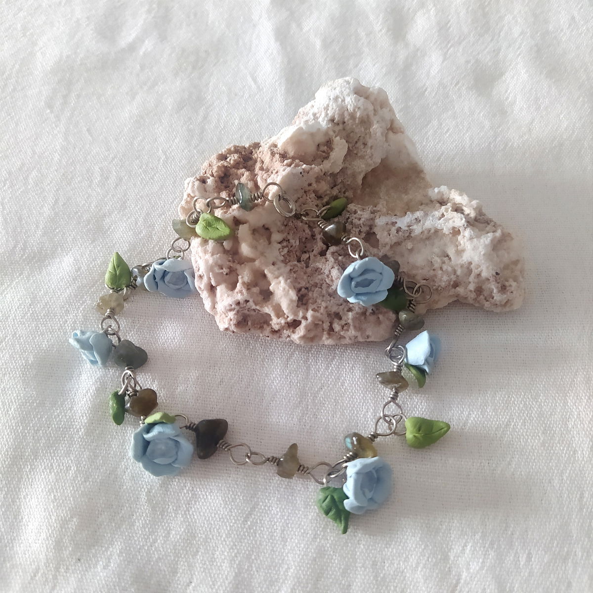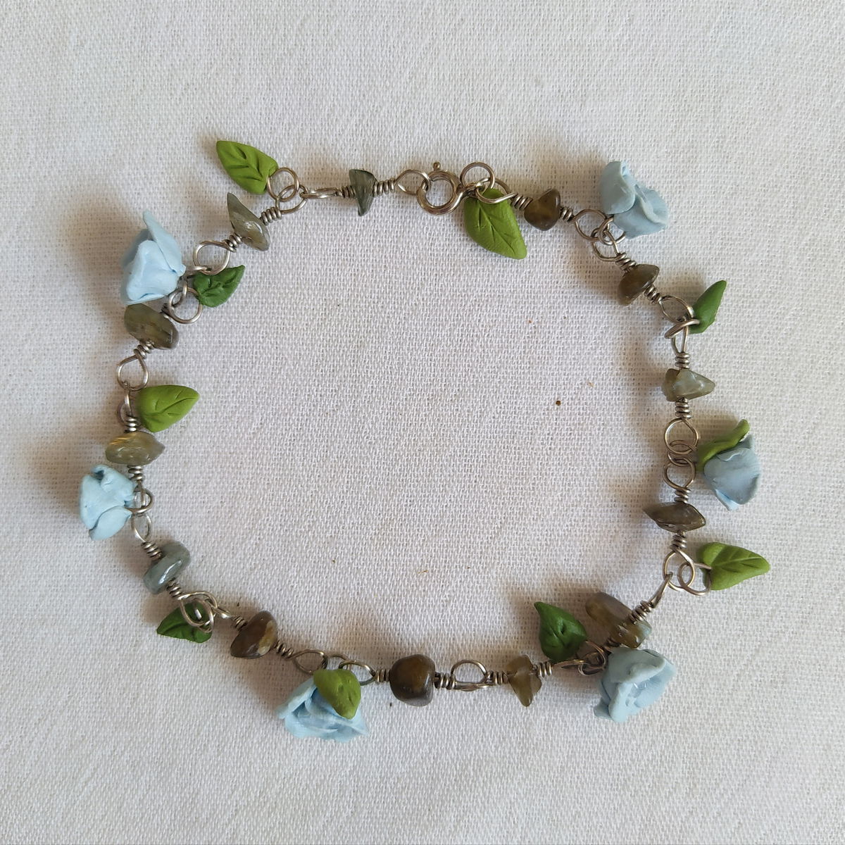 Tobillera de alpaca con labradorita y flores celestes