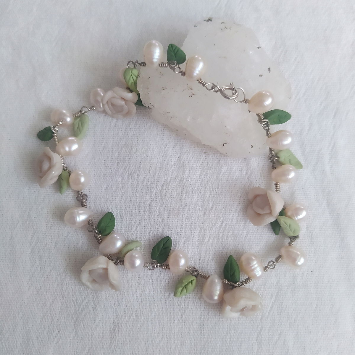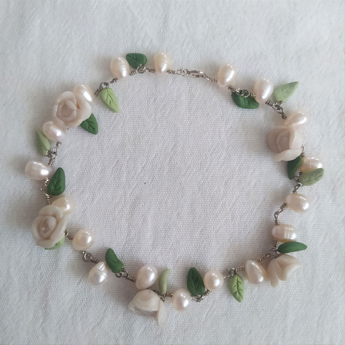Tobillera de plata 925, perlas blancas y flores flancas.