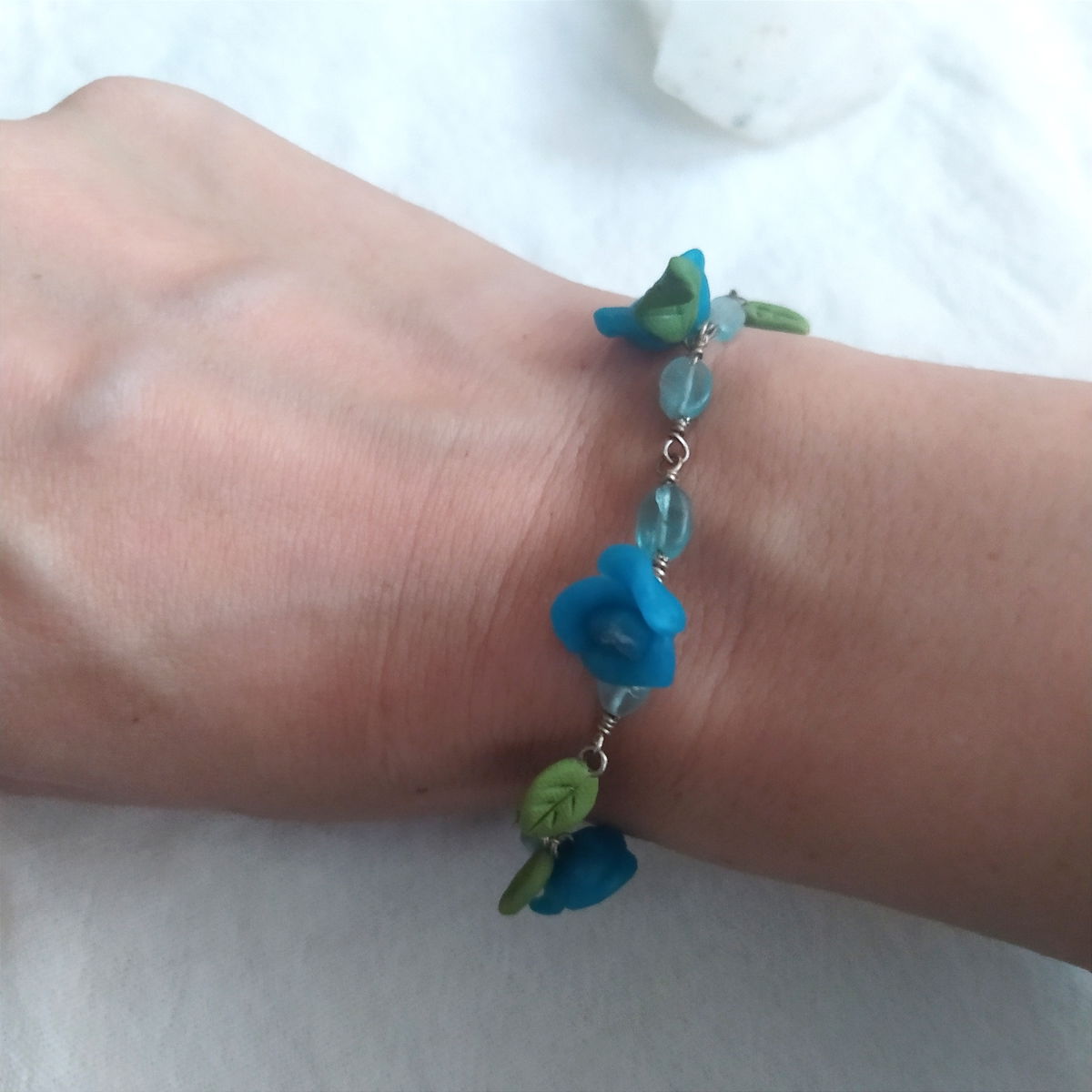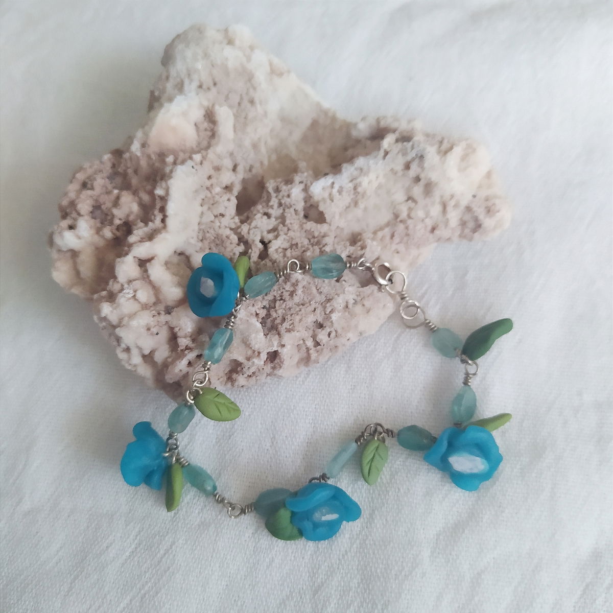 Pulsera de plata 925, aquamarina y flores turquesas.