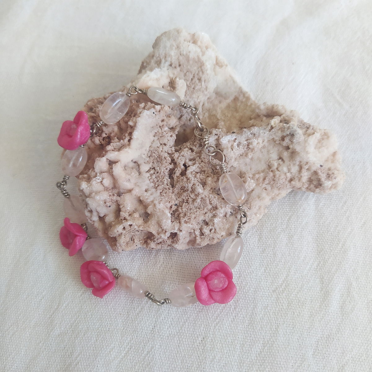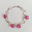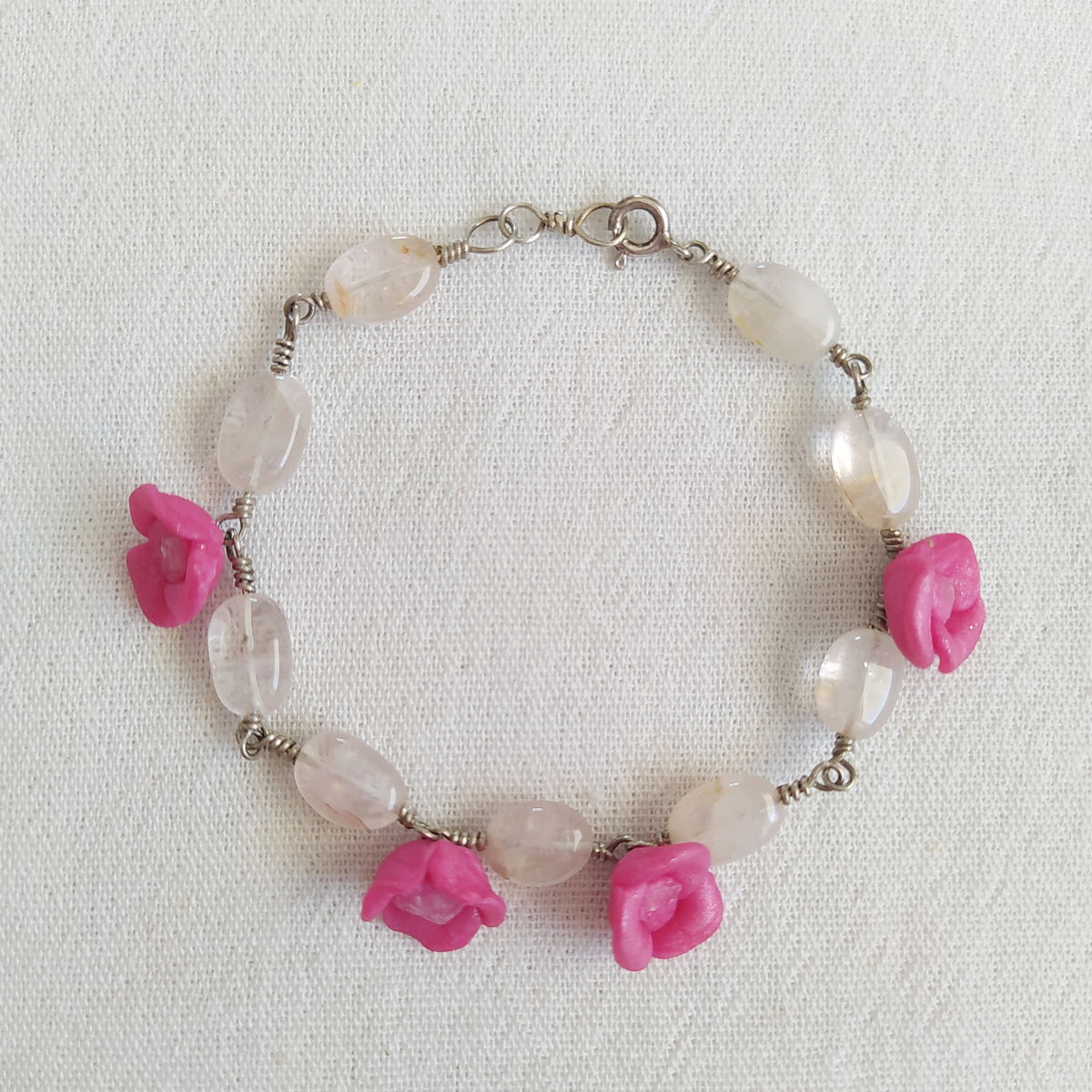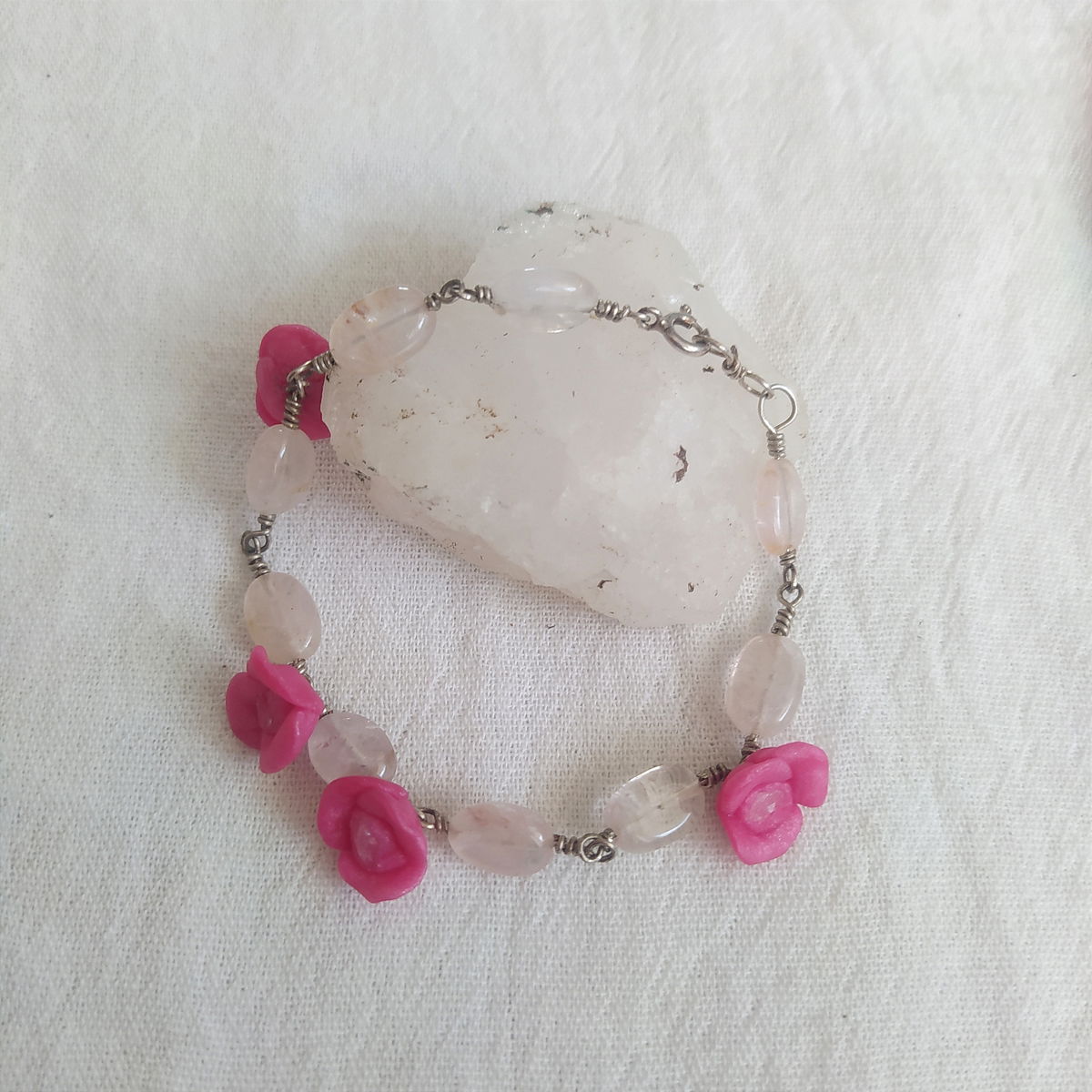 Pulsera de plata 925, cuarzo cristal y flores magenta.