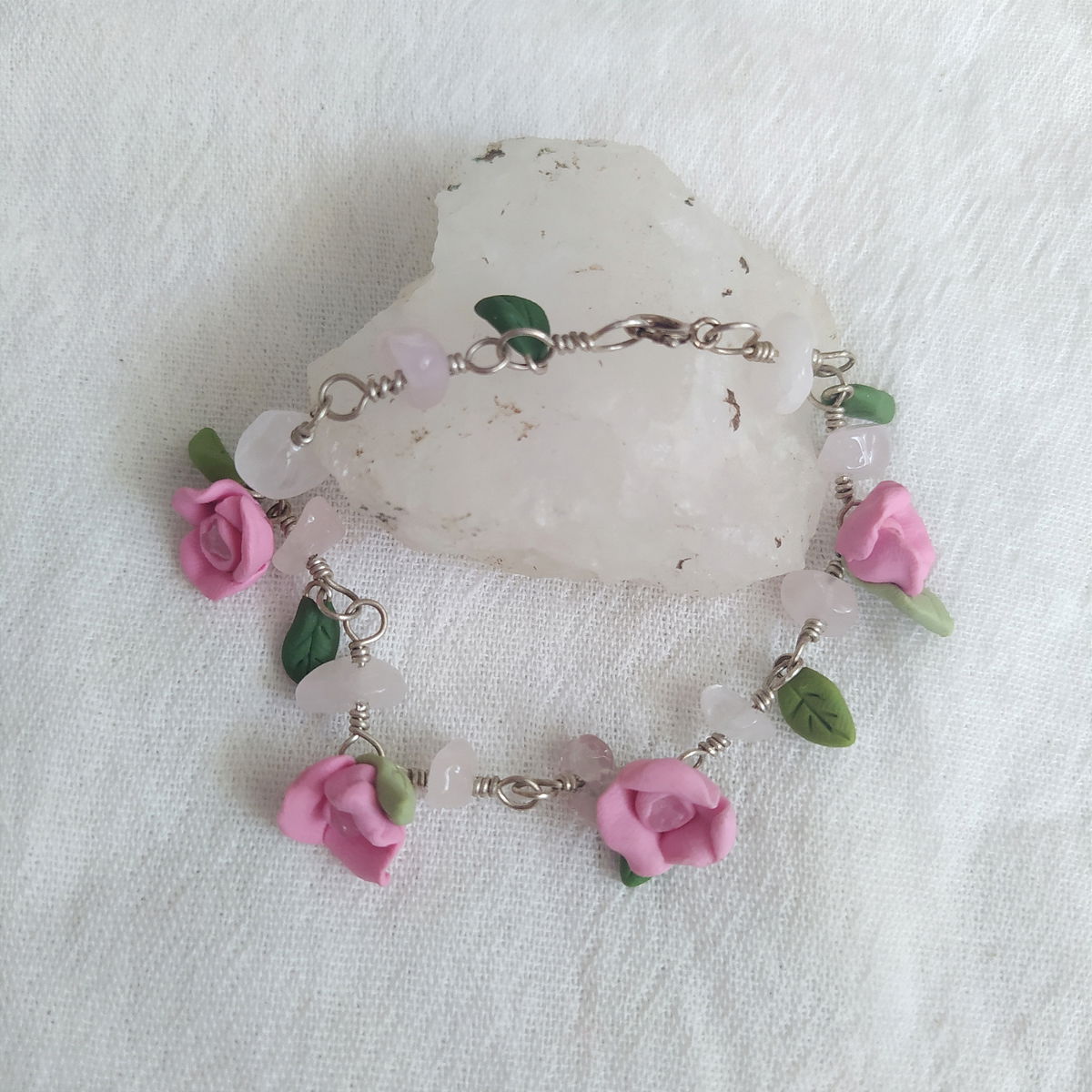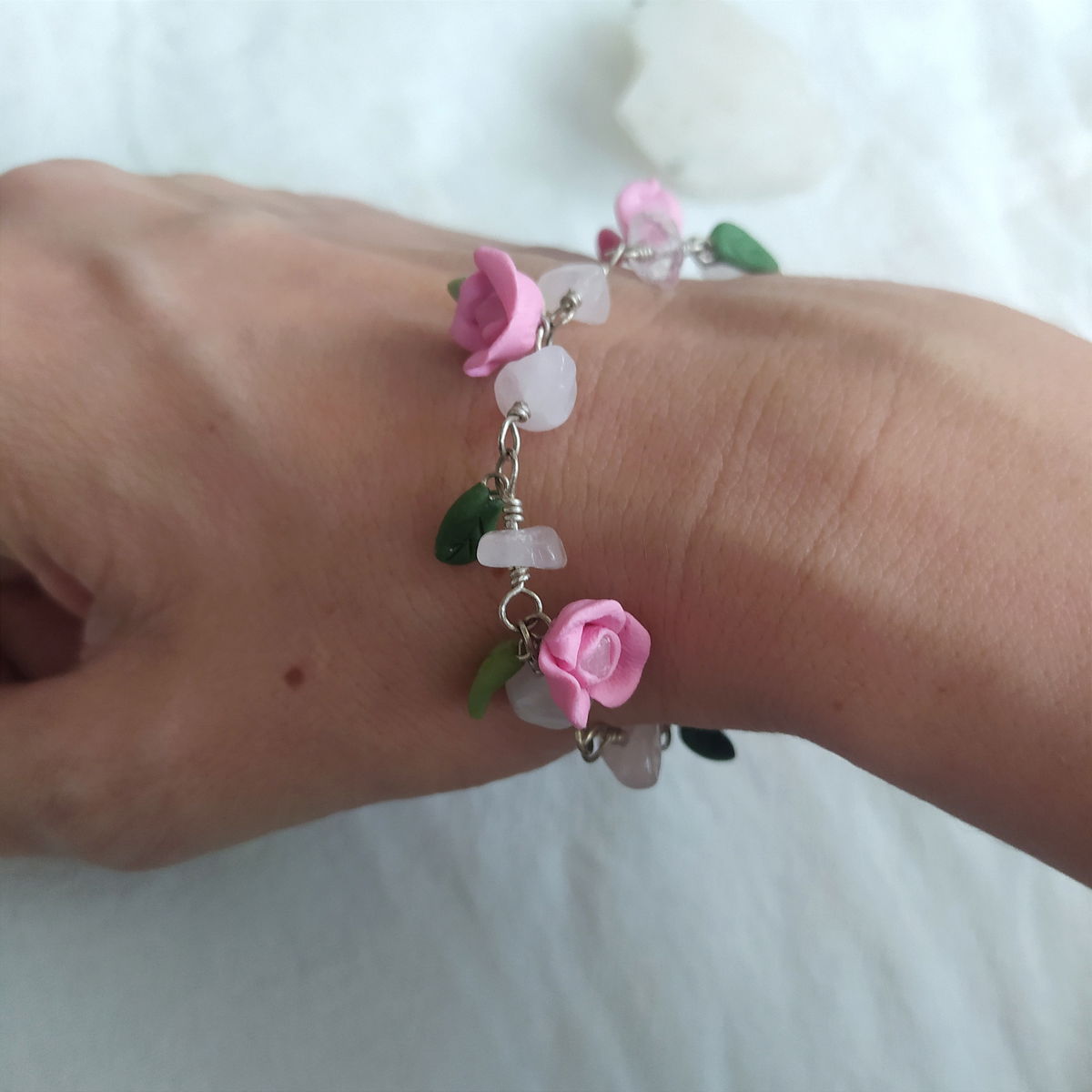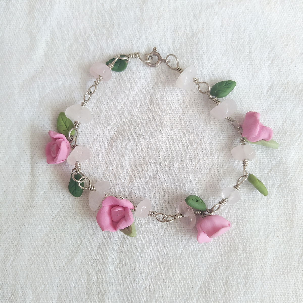Pulsera de plata 925, cuarzo rosa y flores rosas