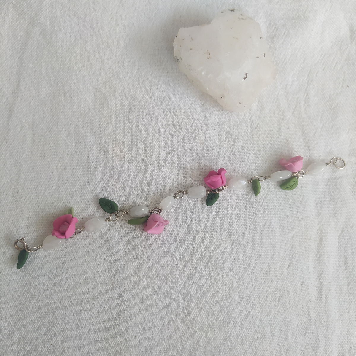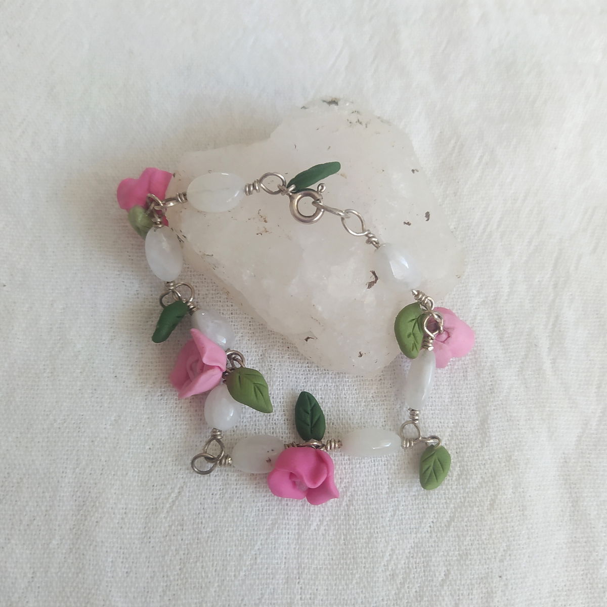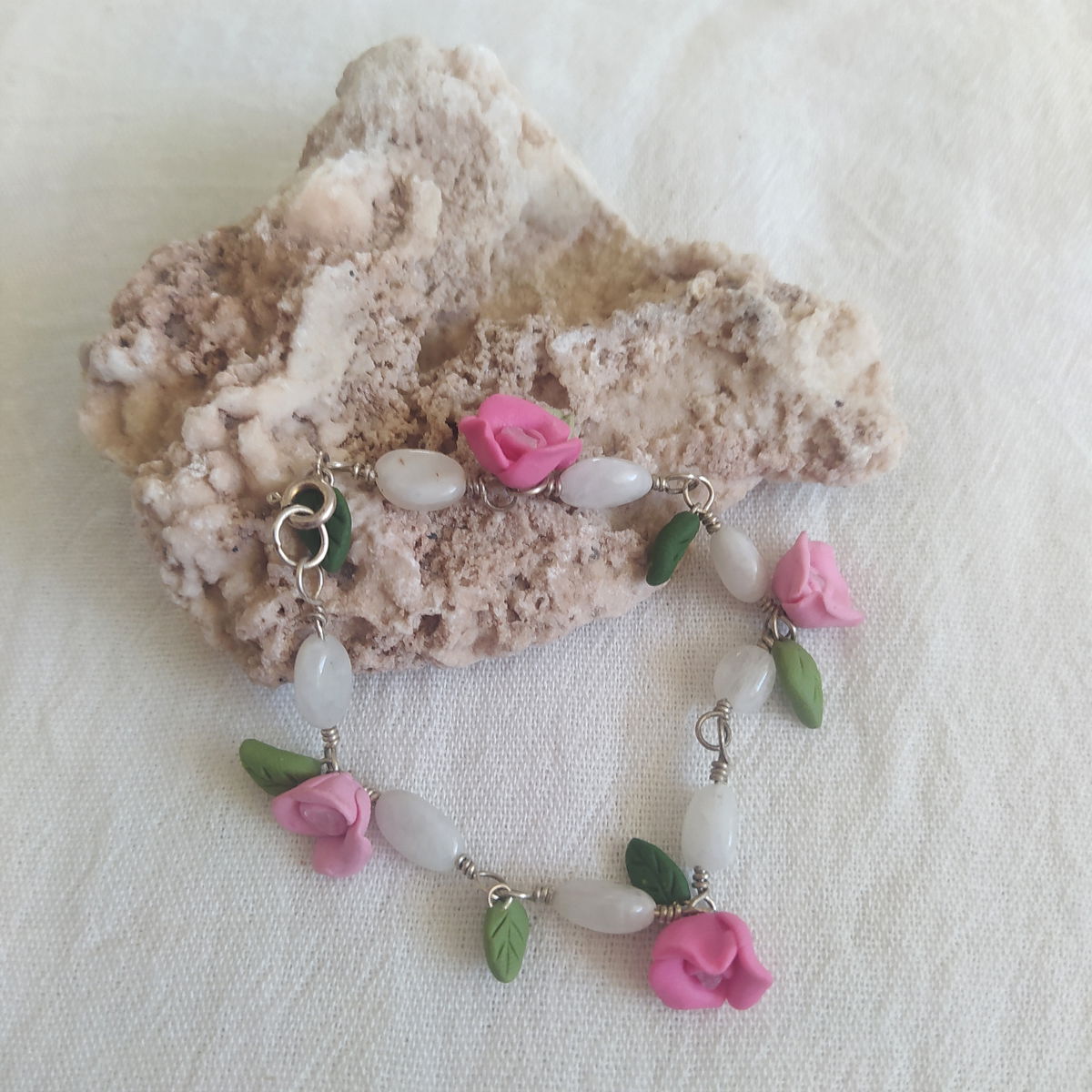 Pulsera de plata 925, piedra de la luna y flores rosas.