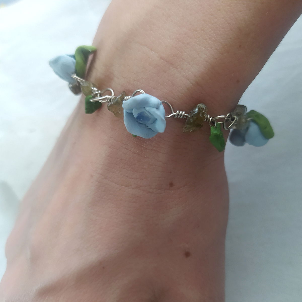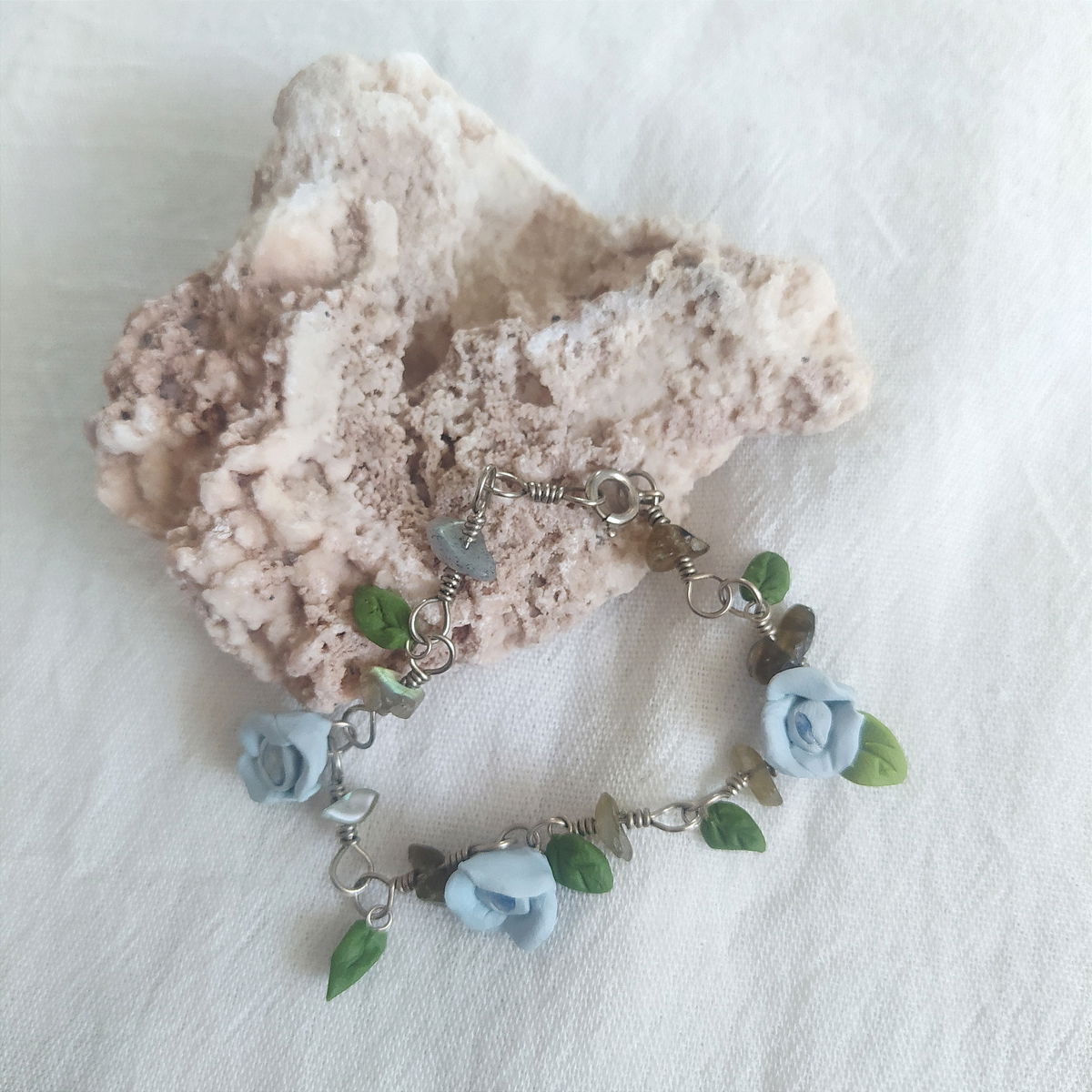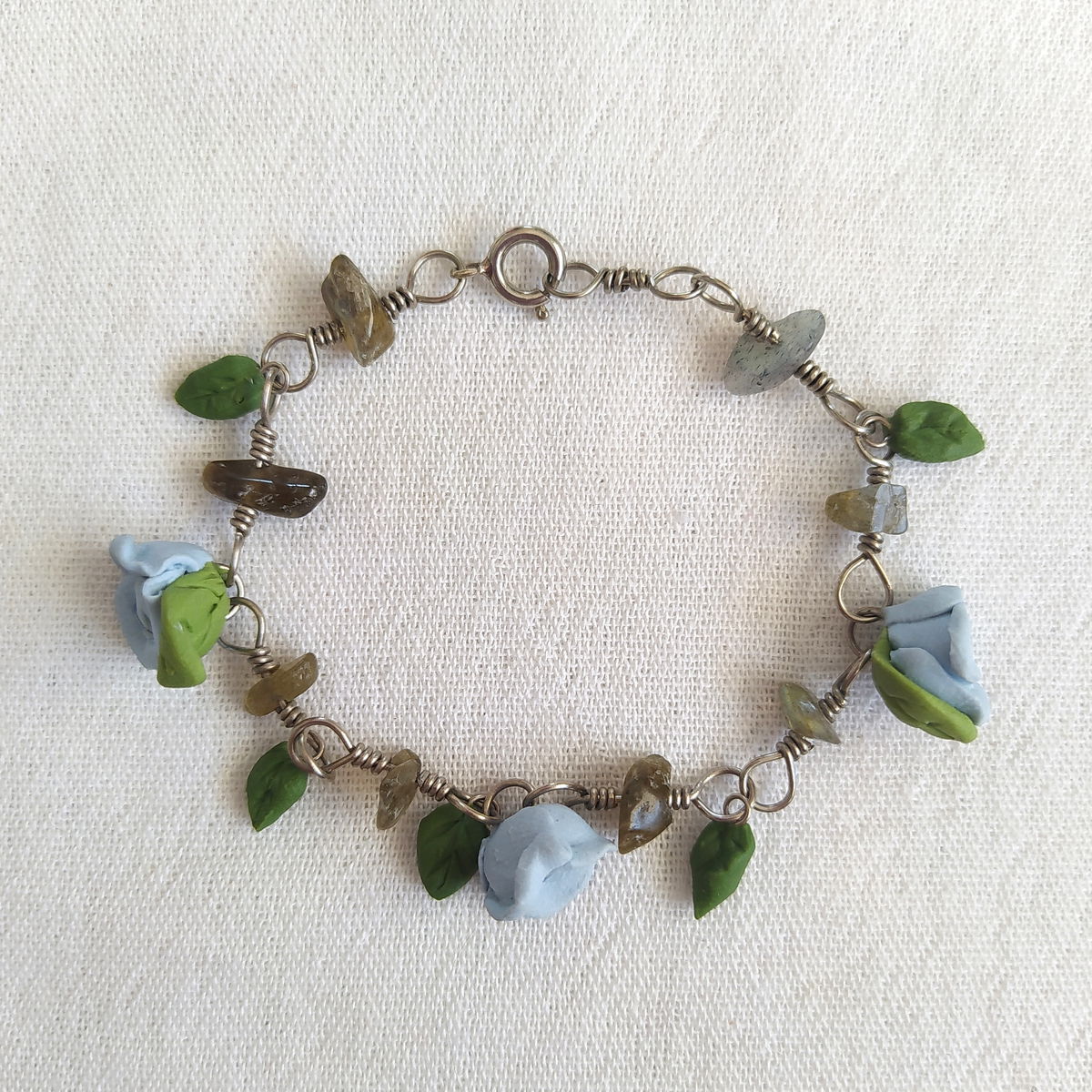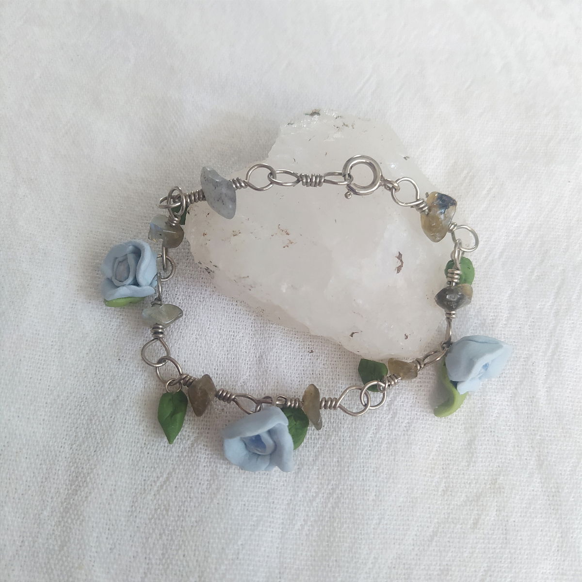 Pulsera de plata 925, labradorita y flores celestes.