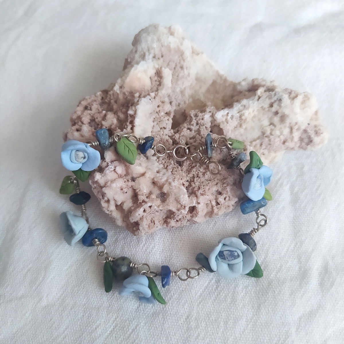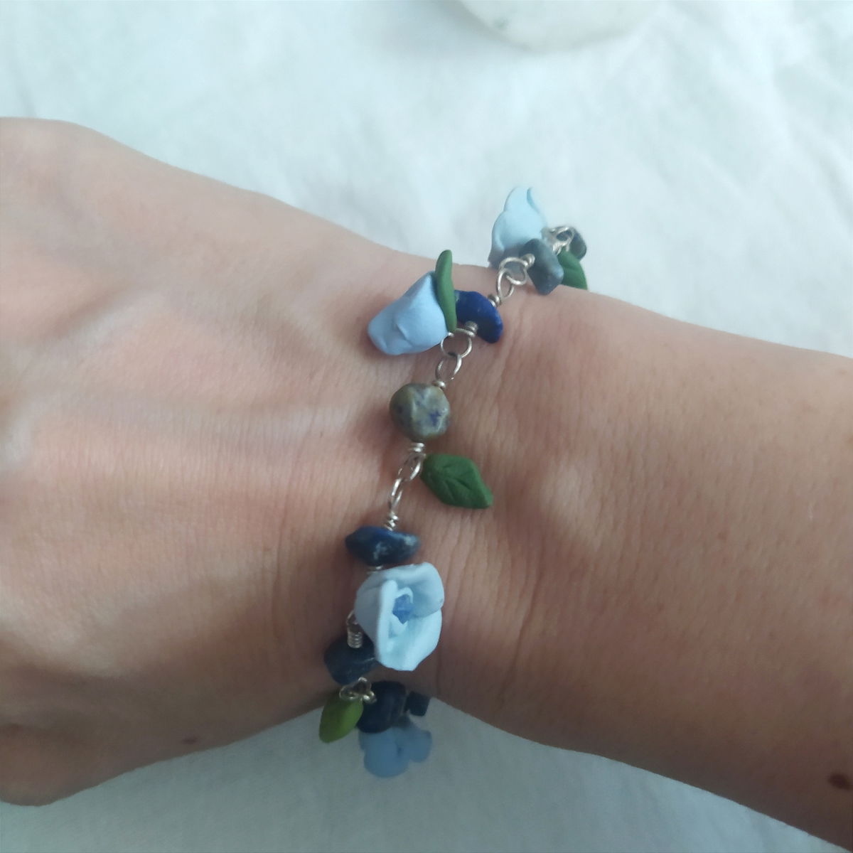 Pulsera de plata 925, lapislazuli y flores celestes.