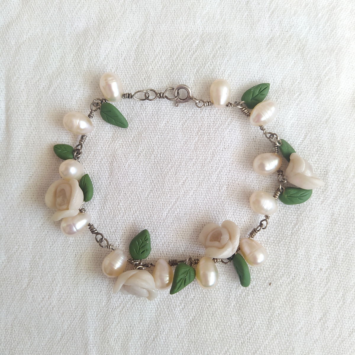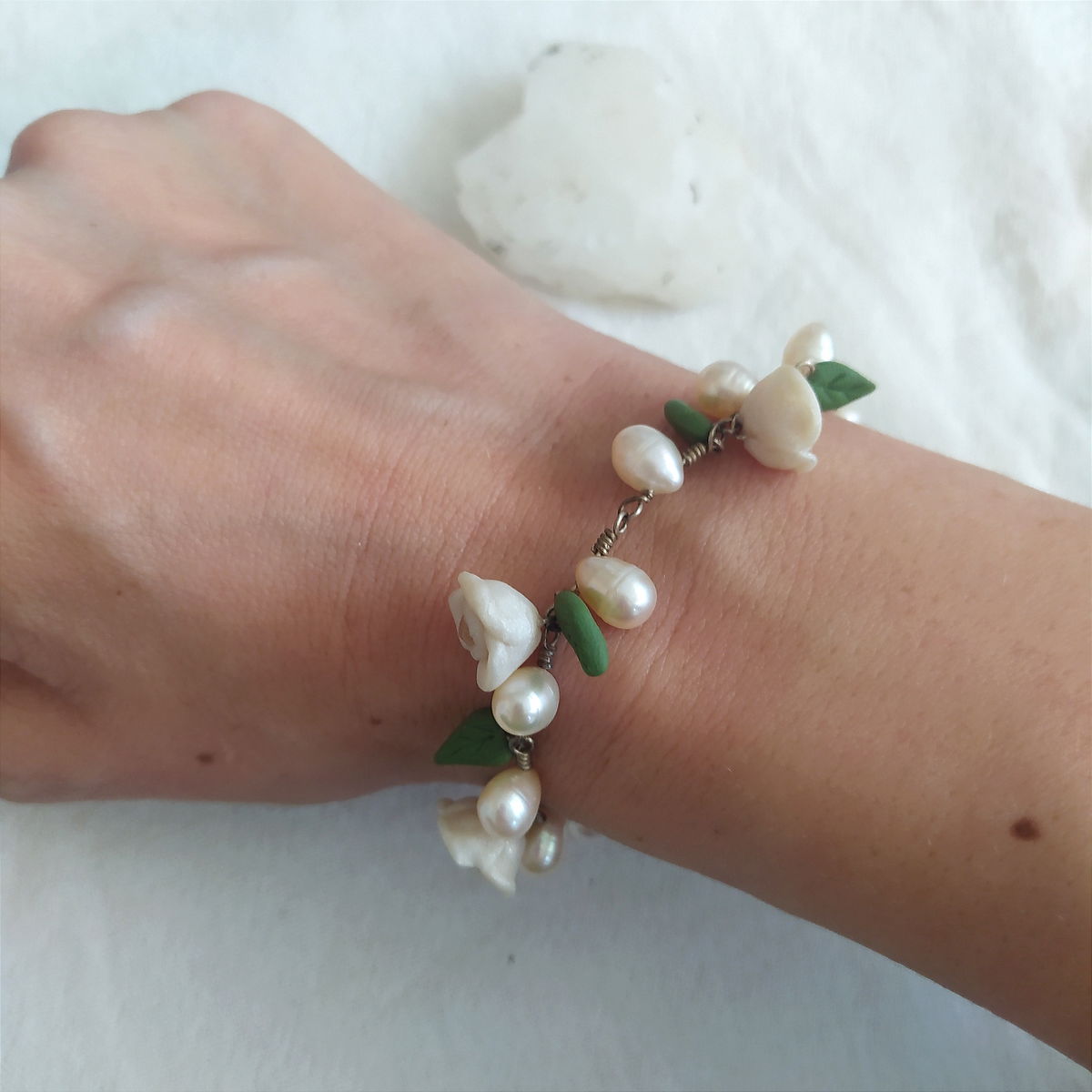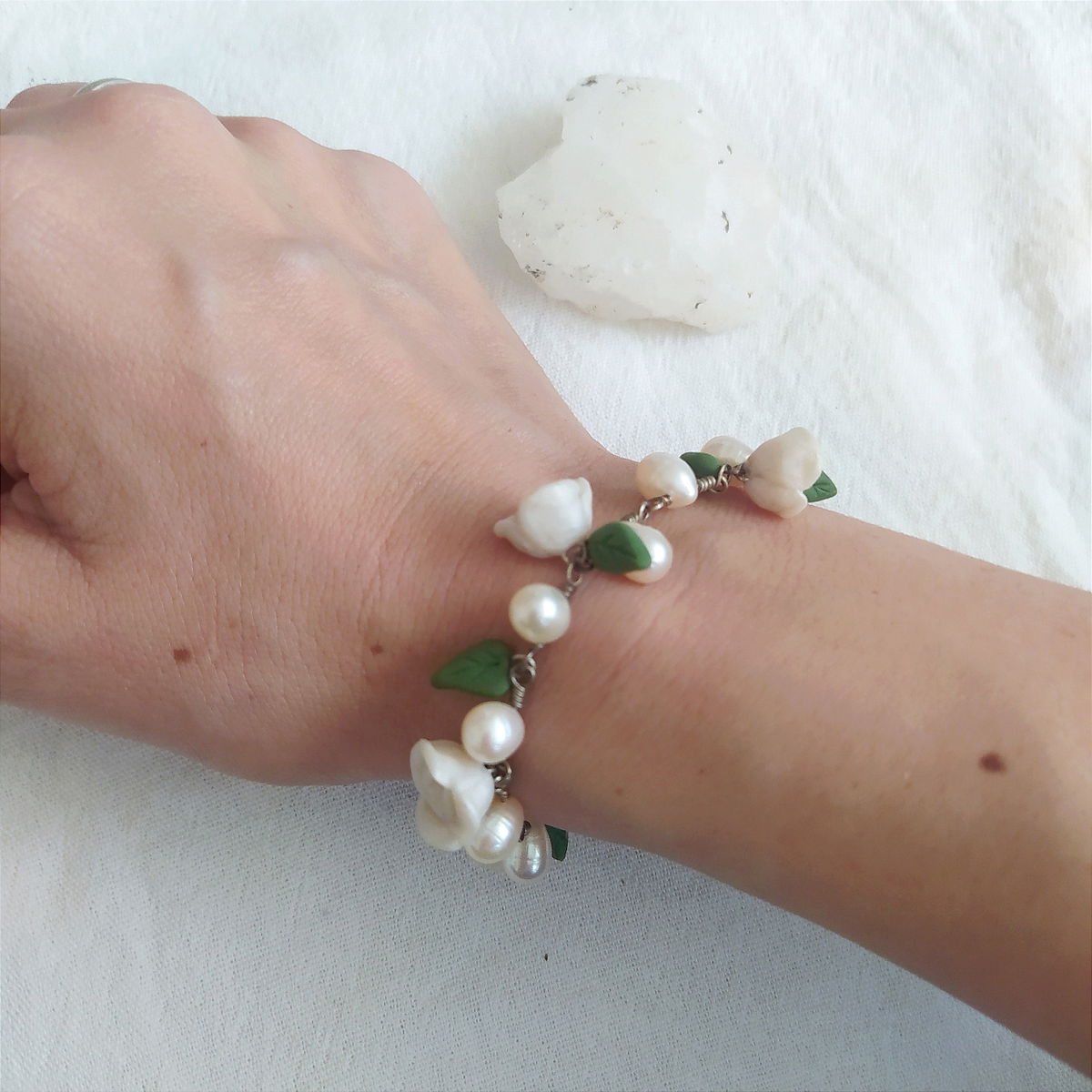 Pulsera de plata 925, perlas blancas y flores blancas con cuarzo cristal en su interior.