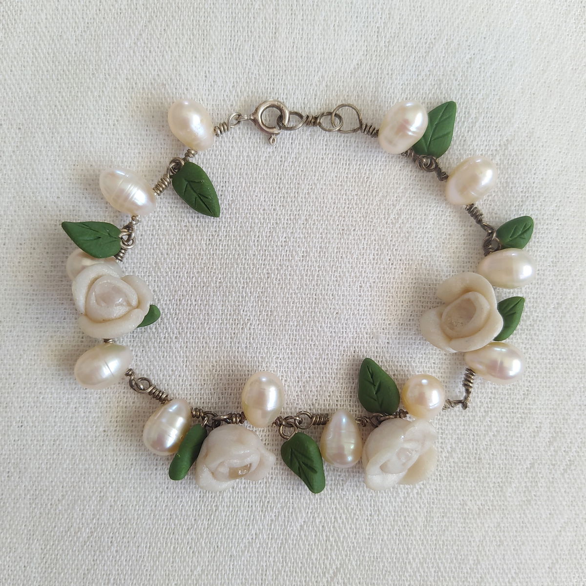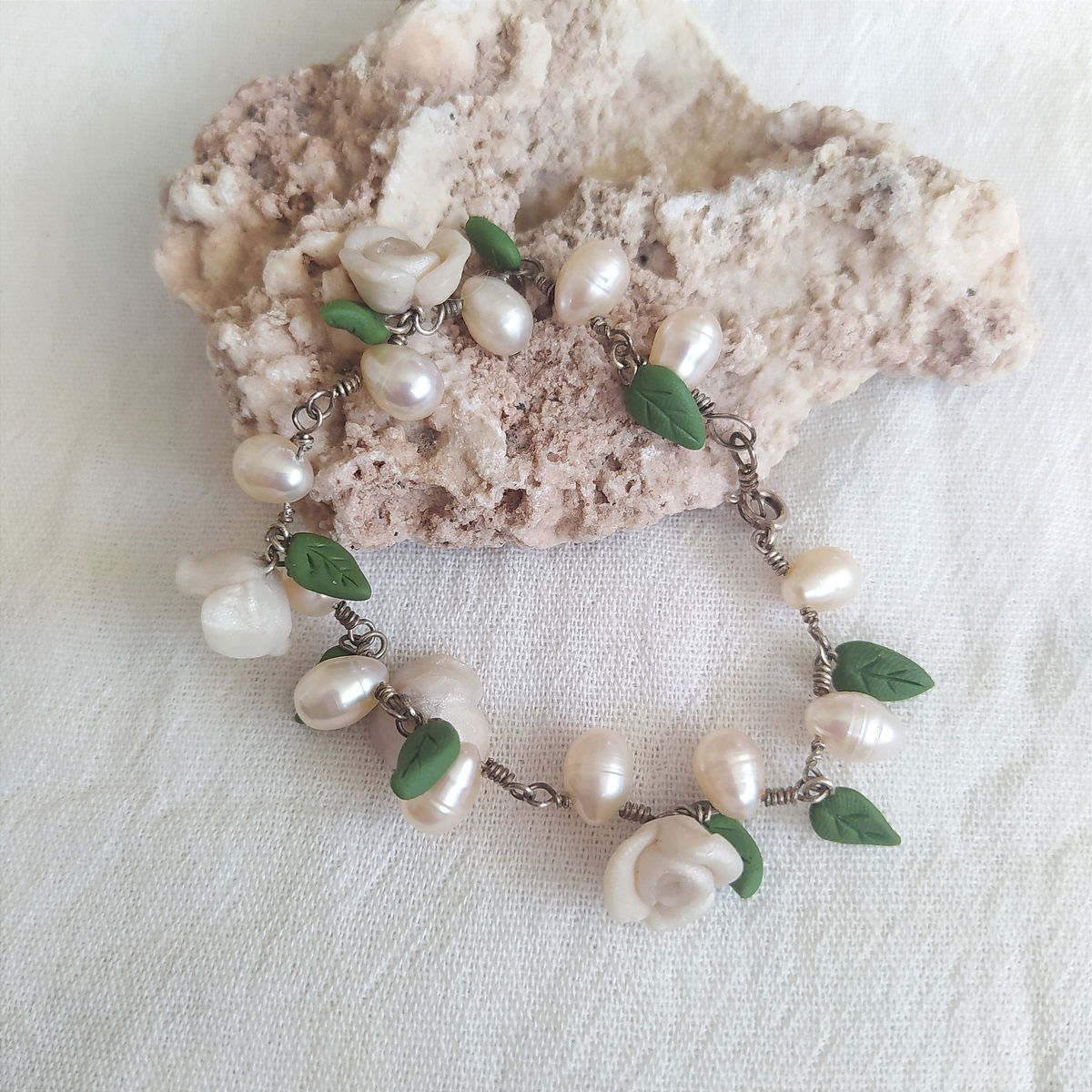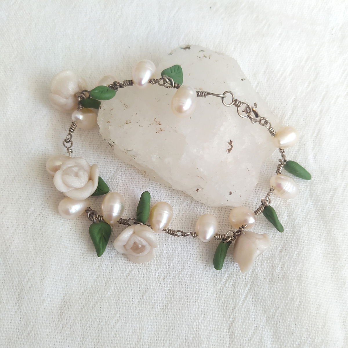 Pulsera de plata 925, perlas blancas y flores blancas con cuarzo cristal en su interior.