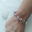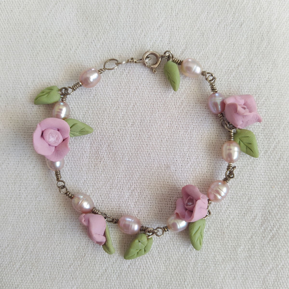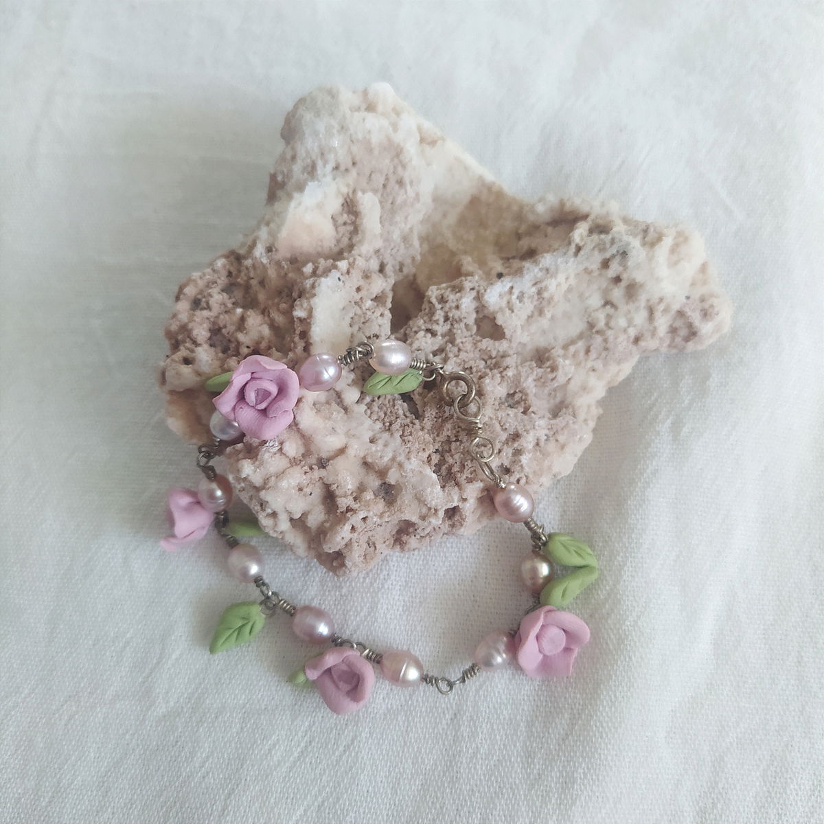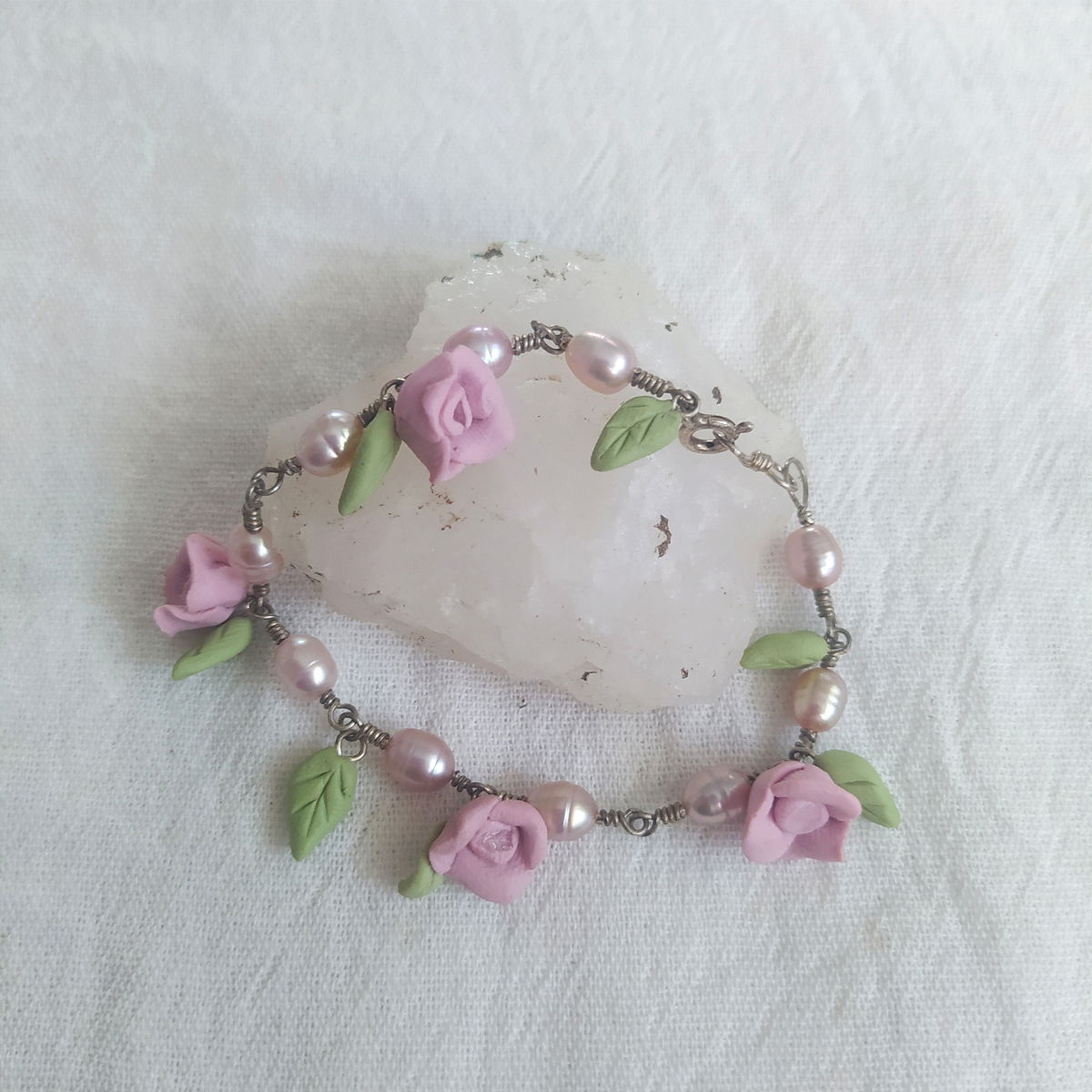 Pulsera de plata 925, perlas rosas y flores rosas con cuarzo cristal en su interior.