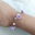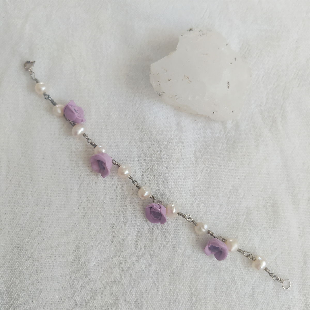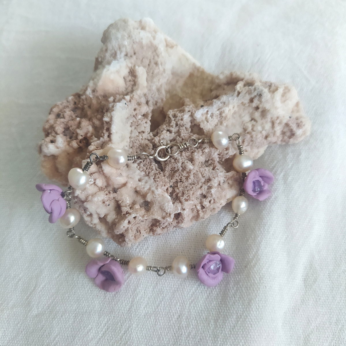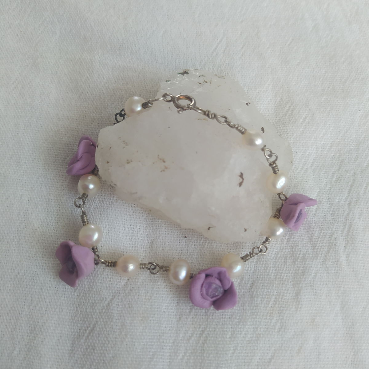 Pulsera de plata 925, perlas blancas y flores lilas con amatista en su interior.