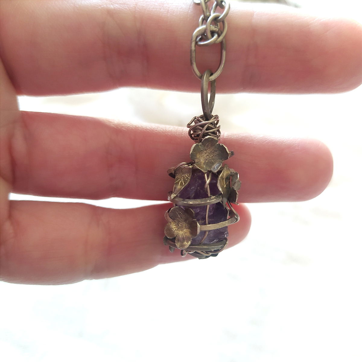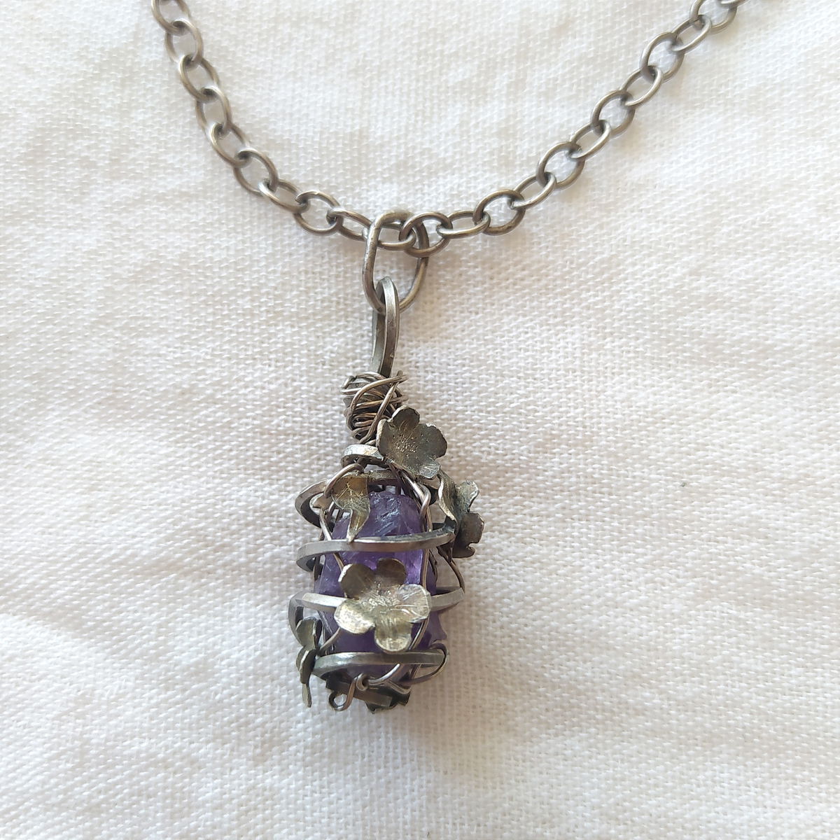 Dije de amatista encapsulado en enredadera de flores en alpaca.
