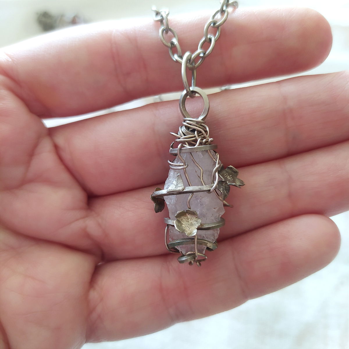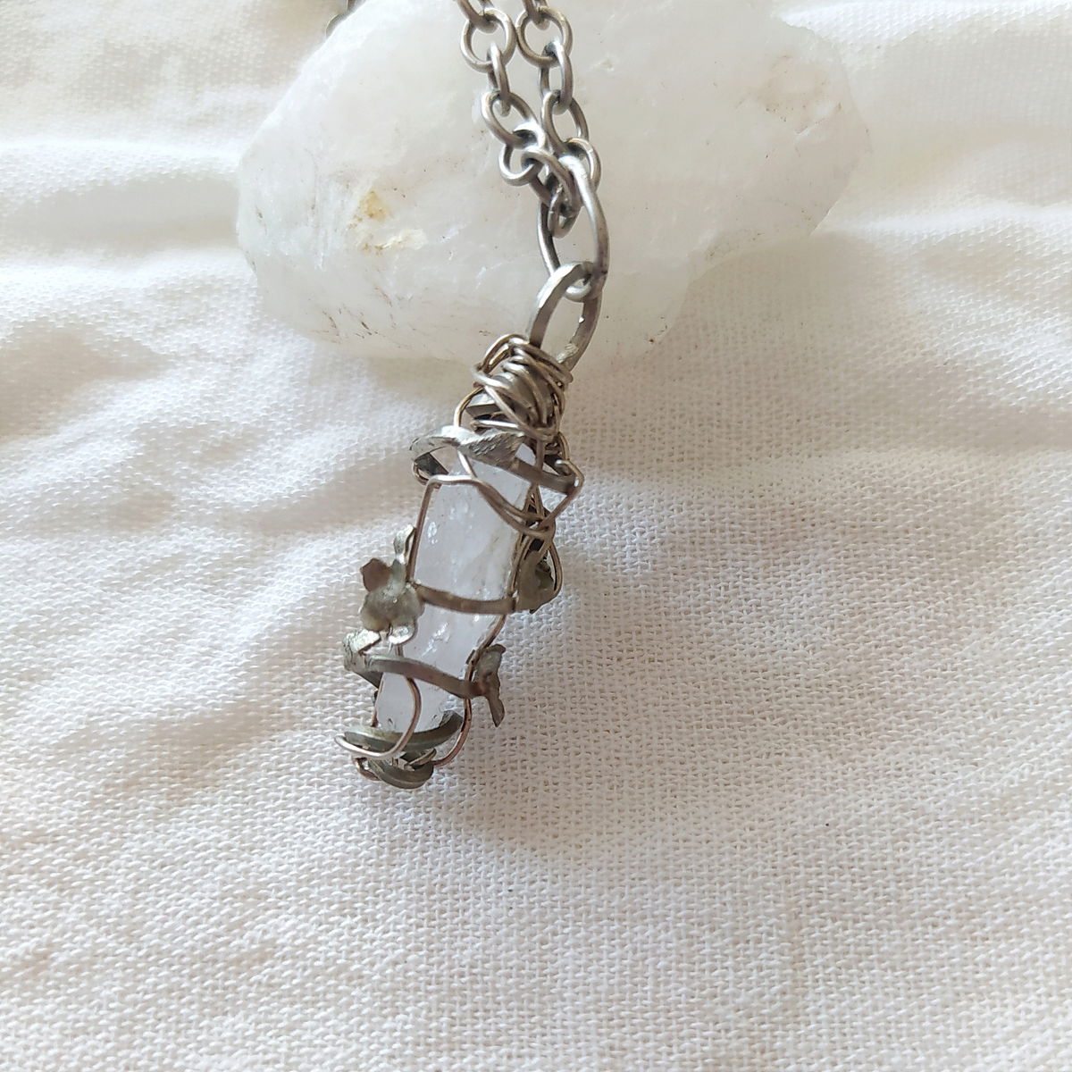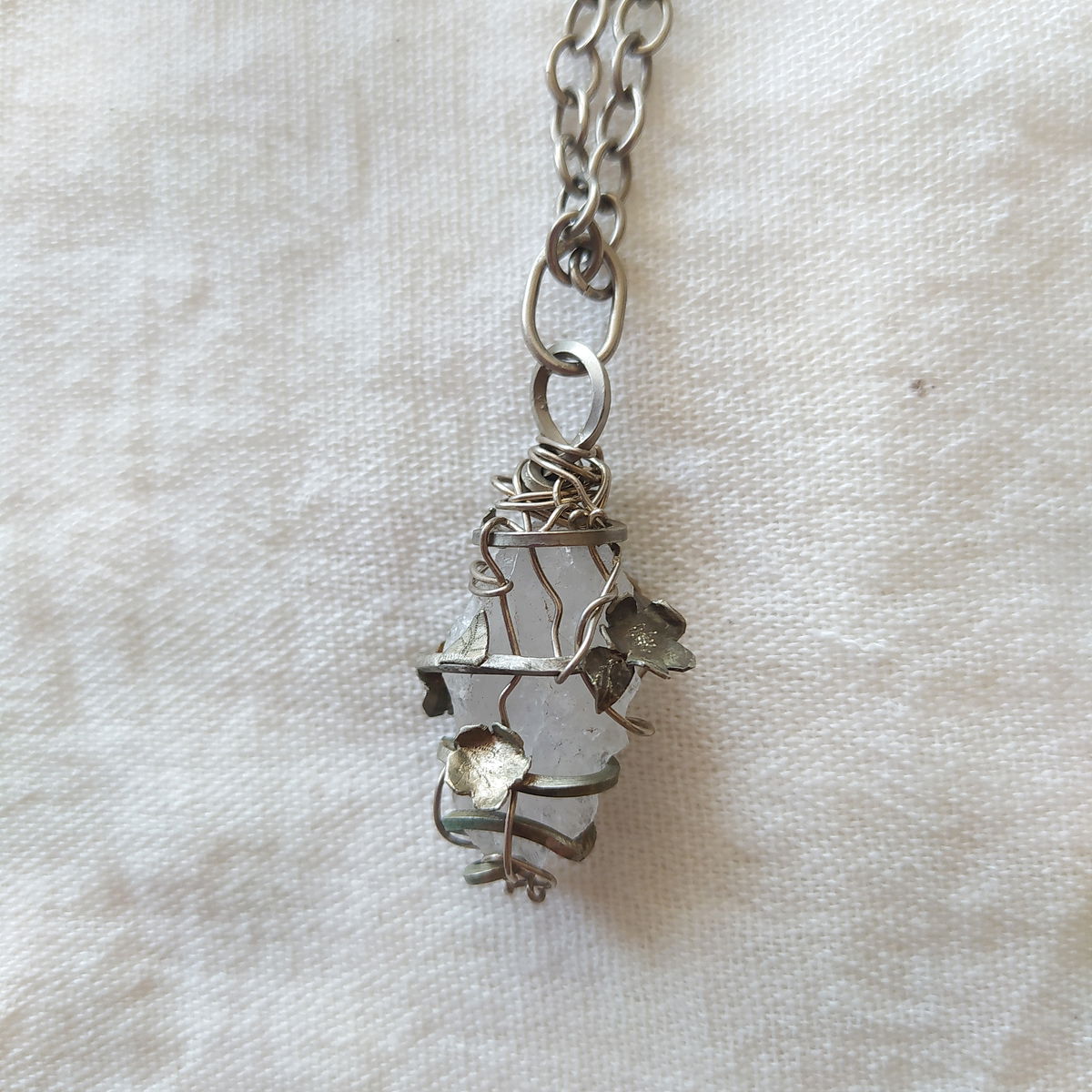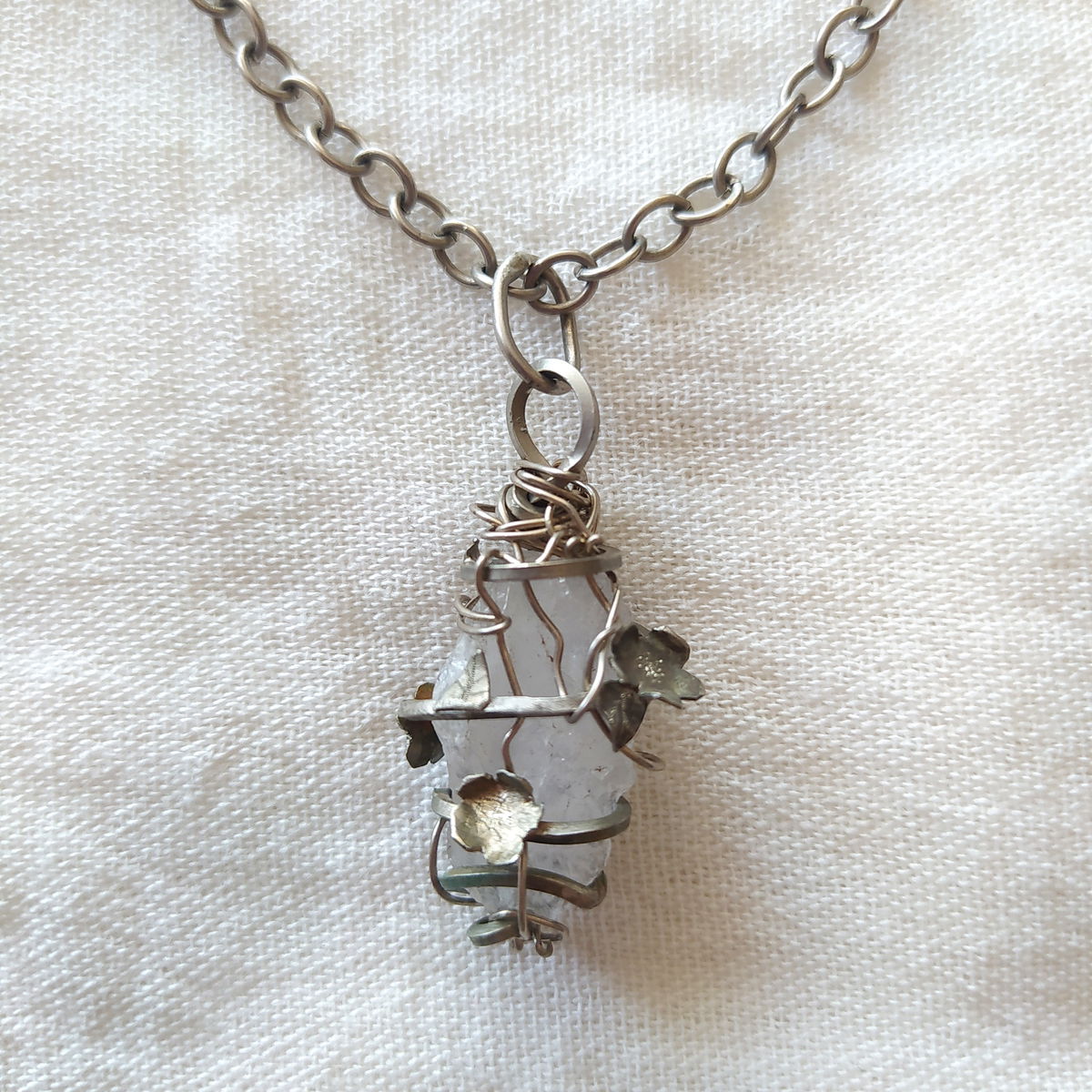 Dije de cuarzo cristal encapsulado en enredadera de flores en alpaca.