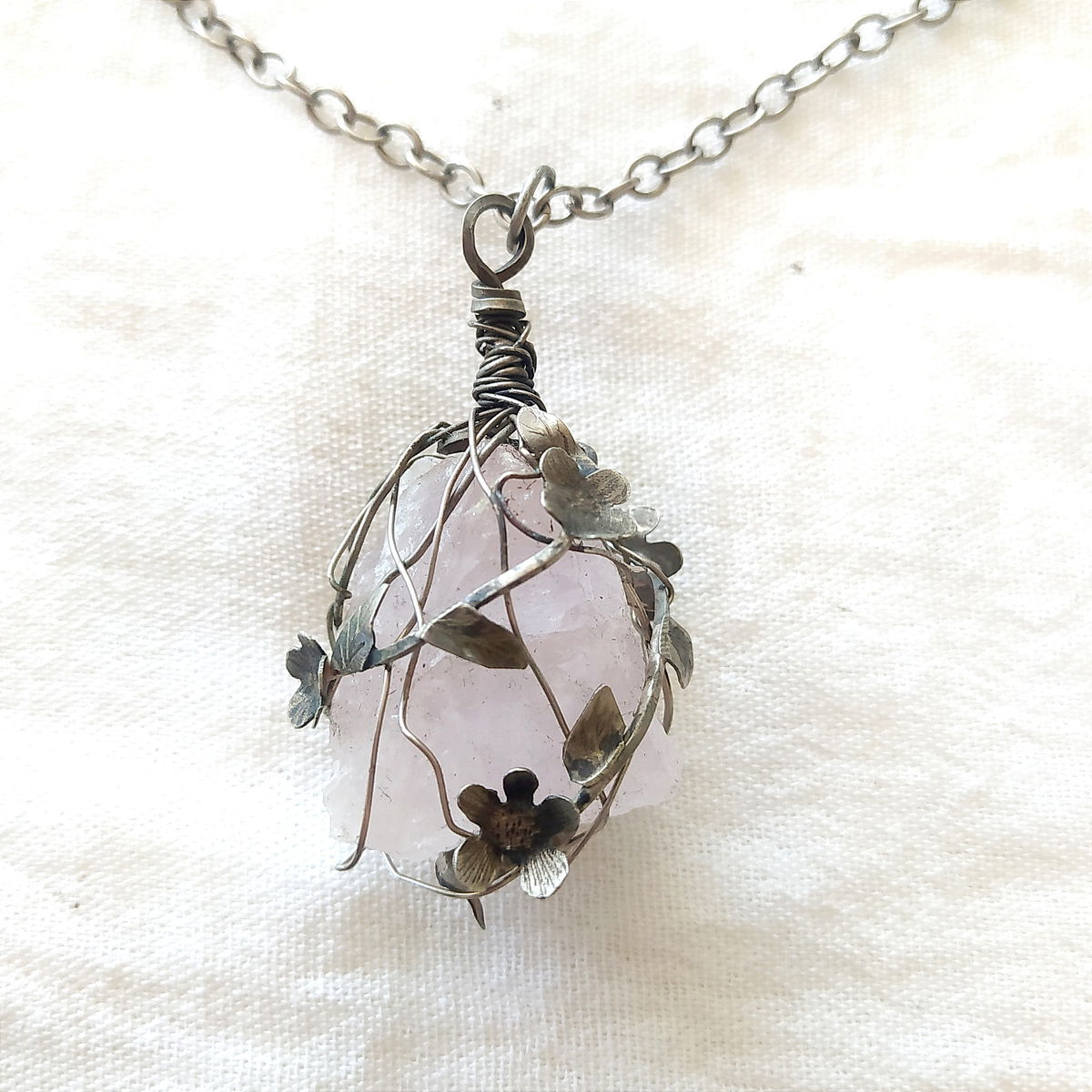 Dije de cuarzo rosa encapsulado en enredadera de flores en alpaca.